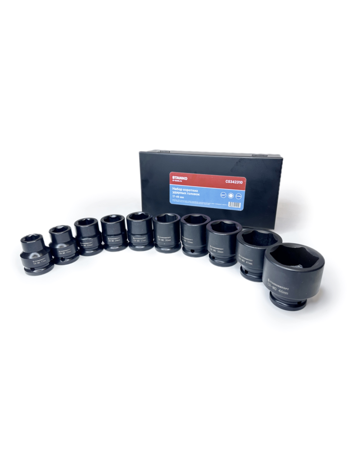 В набор входят ударные головки 17 мм, 19 мм, 22 мм, 24 мм, 27 мм, 30 мм, 32 мм, 36 мм, 41 мм, 46 мм.