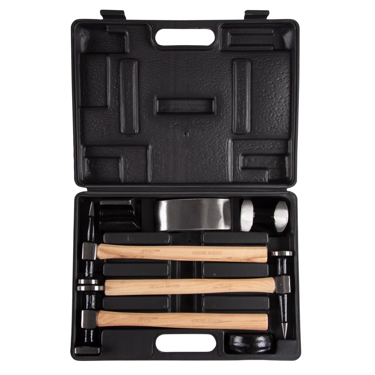 Материалы – конструкционная сталь, дерево (рукояти молотков), пластик PE-HD (кейс)