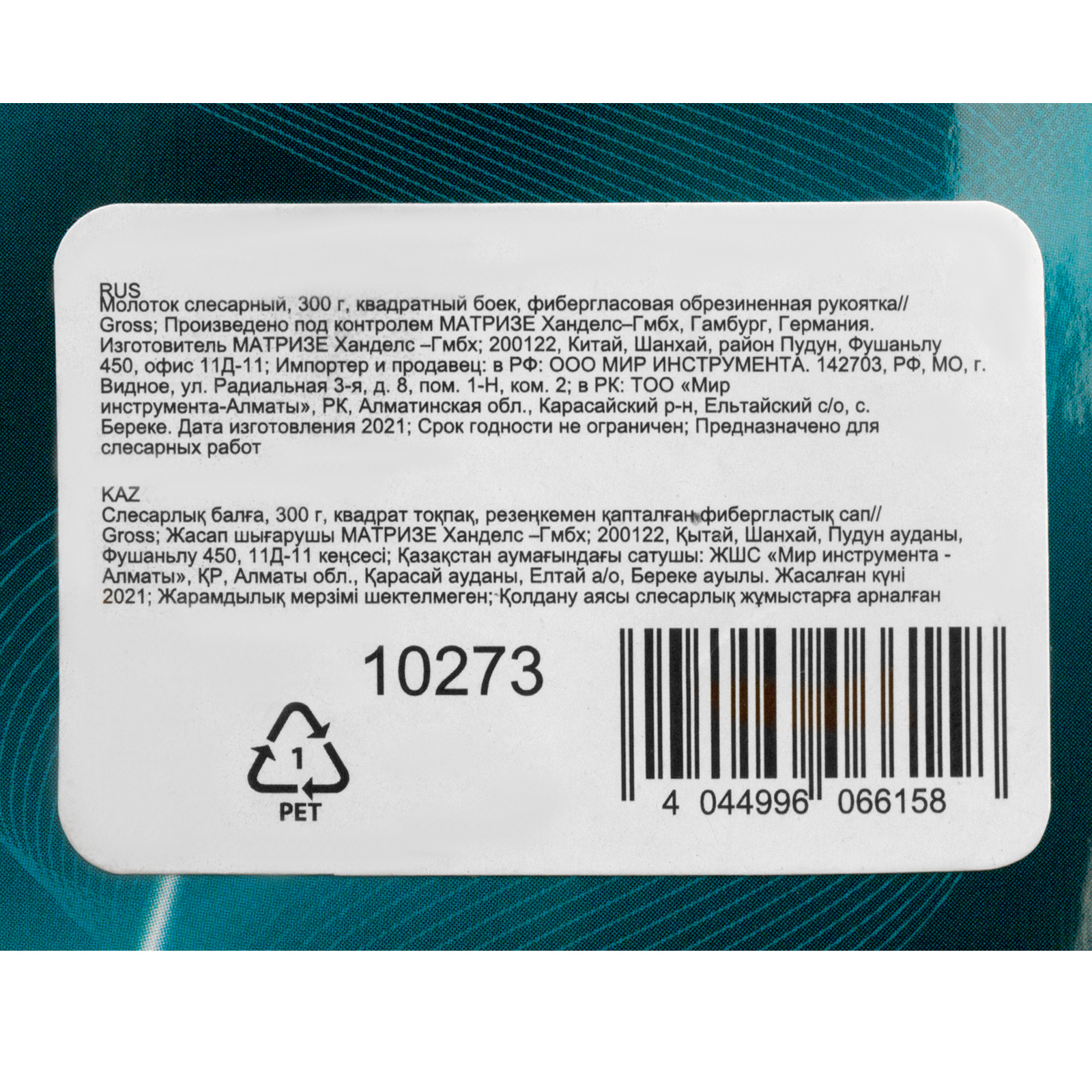 Слесарный молоток Gross 10273 с квадратным бойком весом 300 г и фибергласовой обрезиненной рукояткой предназначен для работы с металлическими заготовками, забивания гвоздей, штырей, дюбелей и других крепежей. Подходит для манипуляций в узких местах благодаря заостренной форме бойка. Молоток рекомендован для профессионального и домашнего применения.ПреимуществаОптимальная прочность и твердость — головка инструмента изготовлена из стали 50, закалена токами высокой частоты, отфрезерована и отшлифована.Деформационная стойкость — твердость квадратной части бойка составляет 50-52 HRC на глубину до 3 мм, а носок имеет твердость 44-46 HRC.Устойчивость к динамическим нагрузкам — область всада обладает наименьшей твердостью 34-36 HRC, что исключает появление трещин при выполнении работ.Надежная конструкция — рукоятка прочно фиксирует головку при помощи эпоксидной смолы, поэтому она не соскочит при ударе.Работа в сложных условиях — материал рукоятки не подвержен воздействию влаги и агрессивных сред.Комфортное использование — фибергласовая рукоятка поглощает вибрации от отдачи, а ее обрезиненная поверхность обеспечивает отличное сцепление с ладонью.