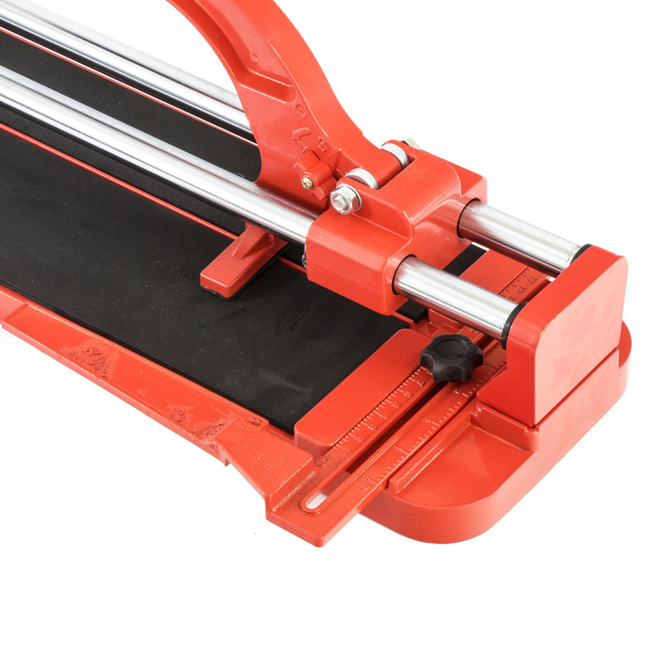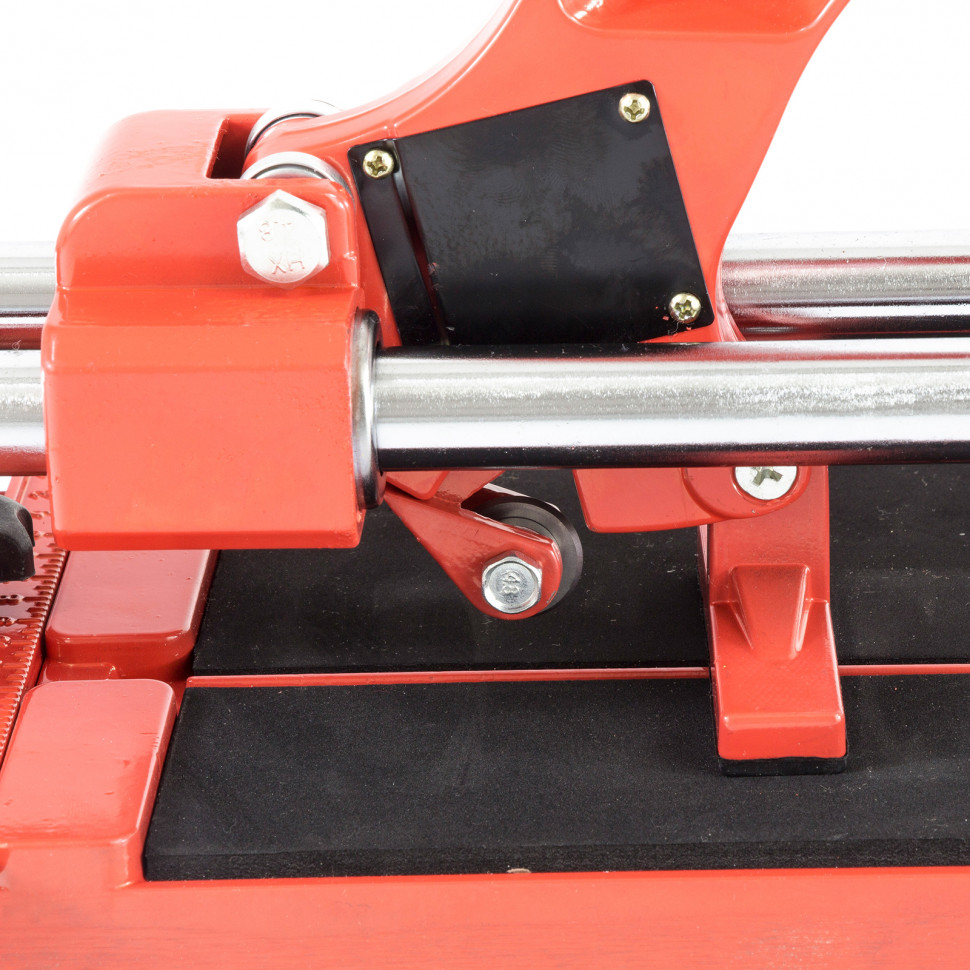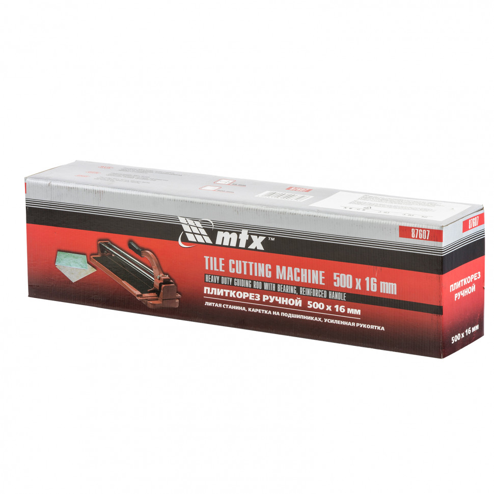 Плиткорез MTX 87607 с литой станиной, кареткой на подшипниках и усиленной рукояткой, используется для резки кафельной плитки размером до 500 х 16 мм. Ходовая каретка представляет собой массивный цельнолитой закрытый корпус, внутри которого размещаются цилиндрические шариковые подшипники, благодаря которым каретка перемещается по направляющим свободно даже при их загрязнении. Отсутствие люфтов в каретке позволяет выполнять рез максимально точно. Инструмент будет полезен мастерам в ходе бытовых облицовочных работ.ПреимуществаДолговечность и надежность — режущий ролик плиткореза выполнен из твердого сплава ВК-8.Защита от ударов — на конце направляющих имеются резиновые амортизаторы.Плавный и свободный ход — цельнолитая закрытая каретка снабжена шарикоподшипниковым механизмом, две трубчатых направляющих из хромированной стали с антикоррозионным покрытием обеспечивают свободный ход каретки по ним в процессе резки.Точность работы — в конструкции устройства имеется металлическая линейка-угольник.Устойчивое основание и неподвижность плитки — плиткорез снабжен цельнолитой станиной из алюминиево-магниевого сплава с обрезиненной поверхностью, а также мягкими амортизирующими накладками.Регулируемый боковой упор (он же линейка-угольник) — удобно осуществлять серийную резку.Надежный хват — рукоятка с прорезиненной накладкой не скользит в руке.