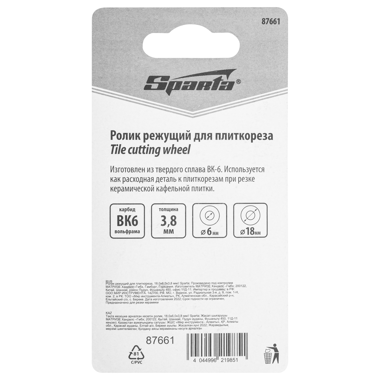Режущий ролик Sparta 87661 размером 18,0 х 6,0 х 3,8 мм — рабочий элемент для плиткорезов Sparta 876355, 876365, 876375. Позволяет быстро и ровно разрезать керамическую плитку. Используется для проведения отделочных работ.ПреимуществаВысокий ресурс — ролик из твердого сплава ВК6 долго сохраняет режущие свойства.Долговечность — ролик устойчив к коррозии и не разрушается под воздействием влаги.Готовность к установке — крепежные элементы входят в комплект поставки, их не нужно приобретать отдельно.Продуманная упаковка — блистер удобен для размещения на стенде.