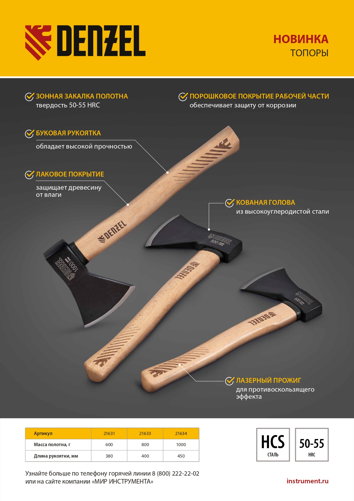 Кованый плотницкий топор Denzel 21633 с буковым топорищем и рабочей частью весом 800 г предназначен для рубки и тесания древесины. Выдерживает высокие нагрузки, поэтому идеально подходит для работы в тяжелых условиях.ПреимуществаУстойчивость к нагрузкам — голова топора изготовлена из высокоуглеродистой стали и закалена до твердости 50-55 HRC.Надежная защита от коррозии — на головку нанесено черное эмалевое покрытие.Прочность и долговечность — буковая рукоятка расклинена и дополнительно зафиксирована эпоксидным клеем, что обеспечивает надежную фиксацию головки и в целом надежность всего инструмента.Стойкость к рассыханию и воздействию влаги — топорище покрыто защитным лаком.Комфортная работа — инструмент отличается сбалансированной эргономичной формой и весом.