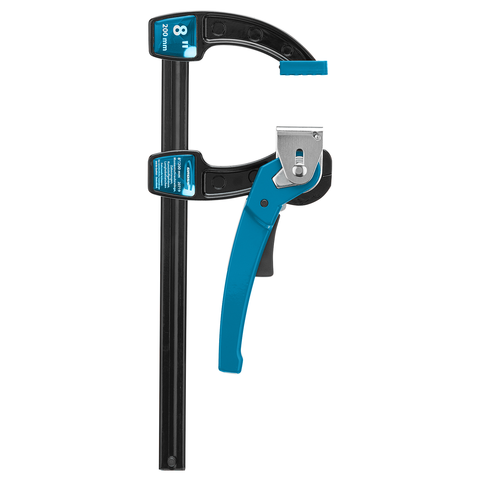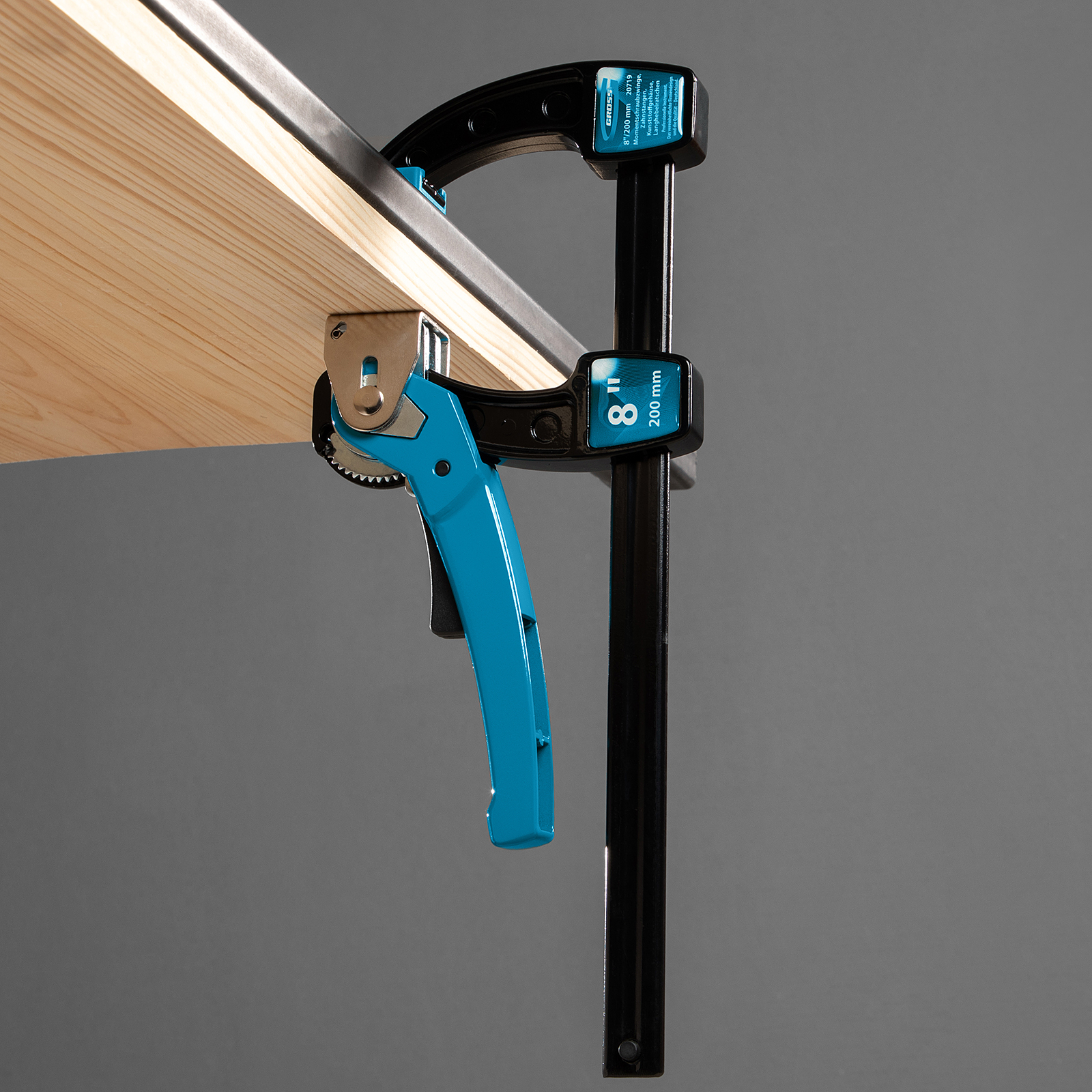 Реечная быстрозажимная струбцина Gross 20719, с металлическим корпусом, с рычажным храповым механизмом, служит для фиксирования деталей и конструкций толщиной до 8 дюймов / 200 мм. Губки подводят вплотную к детали, а храповый механизм с рычагом позволяет произвести окончательную фиксацию, максимально используя мускульную силу. Стопорный механизм VIBRAFIX способен удерживать предметы с усилием 1200 НН. Струбцина используется для выполнения профессиональных столярных и слесарных работ.ПреимуществаРейка изготовлена из холоднотянутой стали, что обеспечивает инструменту стойкость к повышенным нагрузкам.Корпус и губки выполнены из металла и выдерживают значительные усилия при сжатии.На губке установлена резиновая прижимная накладка, защищающая поверхность зажимаемого предмета от повреждений.Струбцина изготовлена на фирменном заводе в Тайване и обладает высоким качеством.