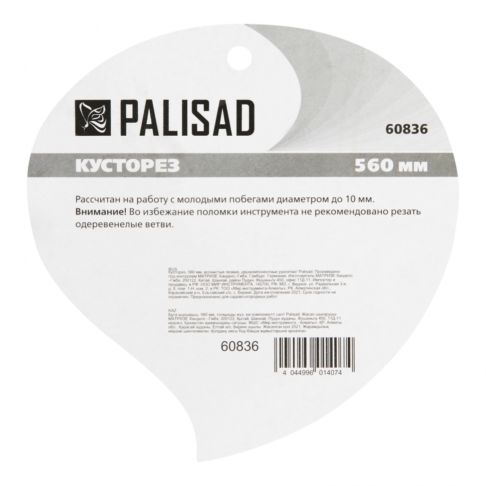 Кусторез Palisad 60836 длиной 560 мм, с волнистыми лезвиями и двухкомпонентными рукоятками, позволяет провести омолаживающую обрезку молодых побегов толщиной до 10 мм. С его помощью можно ухаживать за кустарниками и живой изгородью. Тефлоновое покрытие основного лезвия обеспечивает легкость реза. Волнистые кромки надежно удерживают ветки, поэтому инструмент подходит для подравнивания побегов с гладкой корой.ПреимуществаНадежность — лезвия выполнены из среднеуглеродистой стали, а стальные рукоятки отличаются высокой прочностью на изгиб.Эффективная работа — закаленные и остро заточенные лезвия долго сохраняют режущие свойства.Защита от разрушения — тефлоновое покрытие предотвращает образование коррозии на основном лезвии, а порошковое покрытие — на рукоятках.Ограничитель сжатия — кусторез защищен от повреждения во время работы с большим усилием.Комфортная работа — рукоятки с резиновыми накладками не выскальзывают из рук.