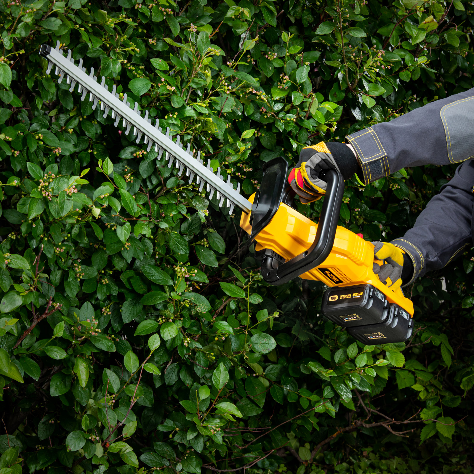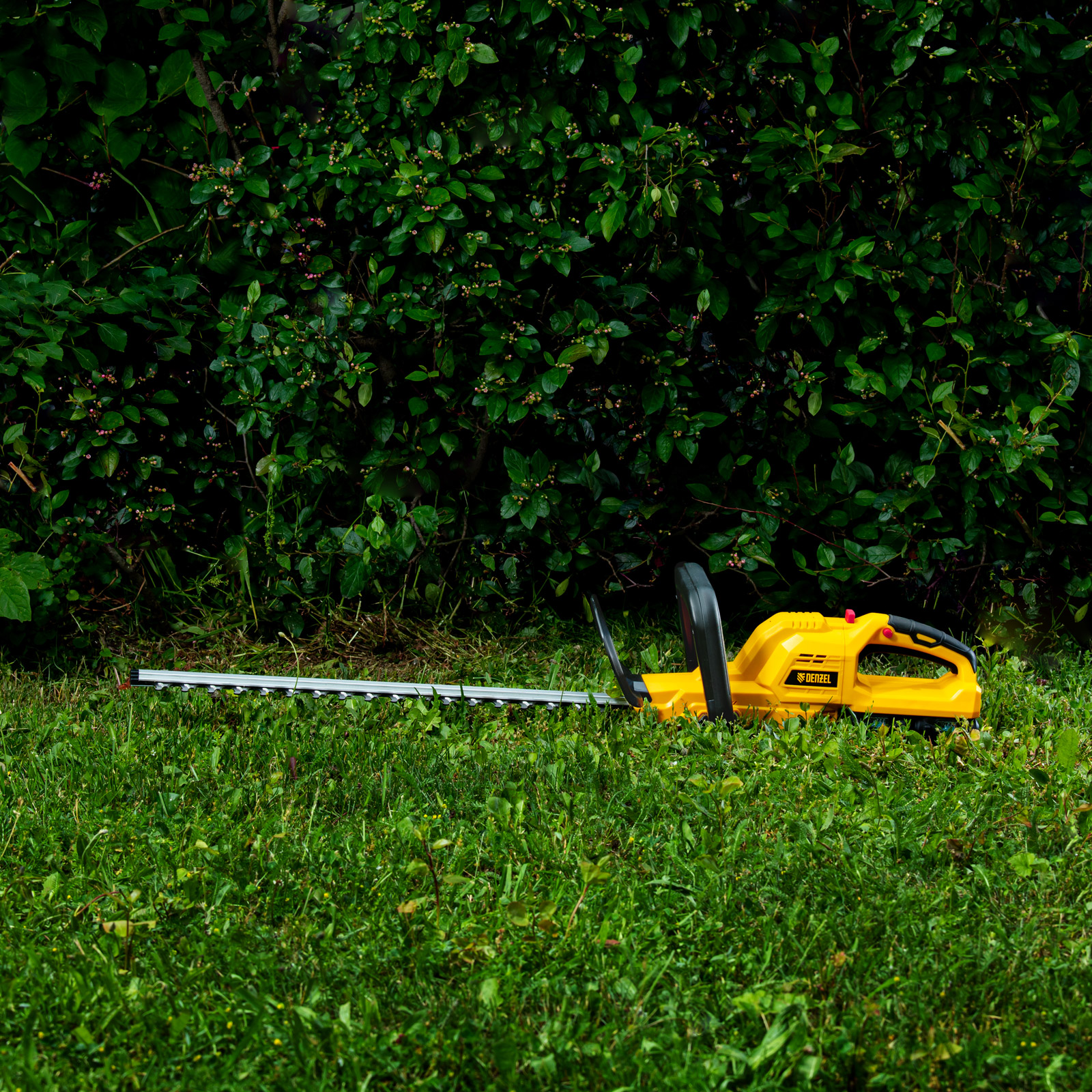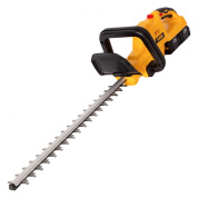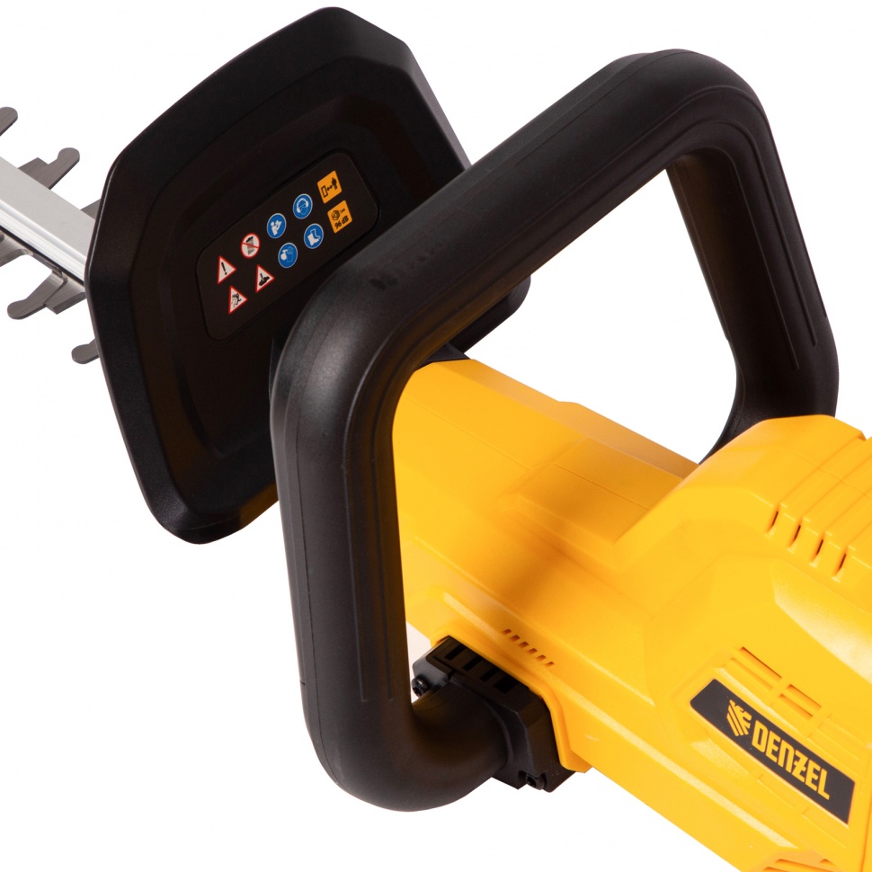Аккумуляторный кусторез Denzel RBC510-36 59410 с двумя Li-Ion батареями емкостью 4 Ач и суммарным напряжением 36 В, с поворотной ручкой, , используется для стрижки кустарников и тонких веток деревьев, подрезания дикой поросли травы. С его помощью можно создать живую изгородь или ландшафтные скульптуры из декоративных растений. Нож длиной 510 мм обеспечивает толщину реза 24 мм. Кусторез не зависит от сети электропитания, поэтому работать с ним можно в самых отдаленных участках сада. Устройство не выделяет вредных выхлопов и работает намного тише в сравнении с бензиновыми аналогами. Преимущества: Удобная работа под разным углом — рукоятку можно развернуть на 90 градусов влево и вправо для боковой подрезки кустарников, а для надежной фиксации предусмотрена кнопка блокировки поворота. Высокий ресурс и надежность — редуктор и кривошипно-шатунный механизм полностью выполнены из металла, поэтому выдерживают повышенные нагрузки. Двойная защита от случайного пуска — блокировка кнопки запуска позволяет избежать получения травм. Безопасность — на корпусе кустореза имеется специальный пластиковый кожух для защиты рук оператора. Виброзащита — благодаря системе гашения колебаний работа кусторезом не вызывает дискомфорт. Неожиданных остановок в работе не случится — LED-индикатор отображает уровень заряда батареи. Универсальность — аккумуляторы 4Ач Li-ion совместимы с любым инструментом 18V Denzel battery system серии IB. Быстрое восстановление работоспособности — в комплект входит зарядное устройство для одновременной зарядки двух аккумуляторов. Удобное хранение и транспортировка — защитный кожух для ножа предохраняет пользователя от случайного контакта с режущей кромкой. Гарантия 3 года — качество кустореза подтверждено производителем.