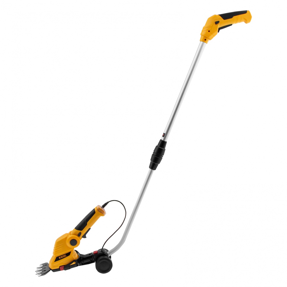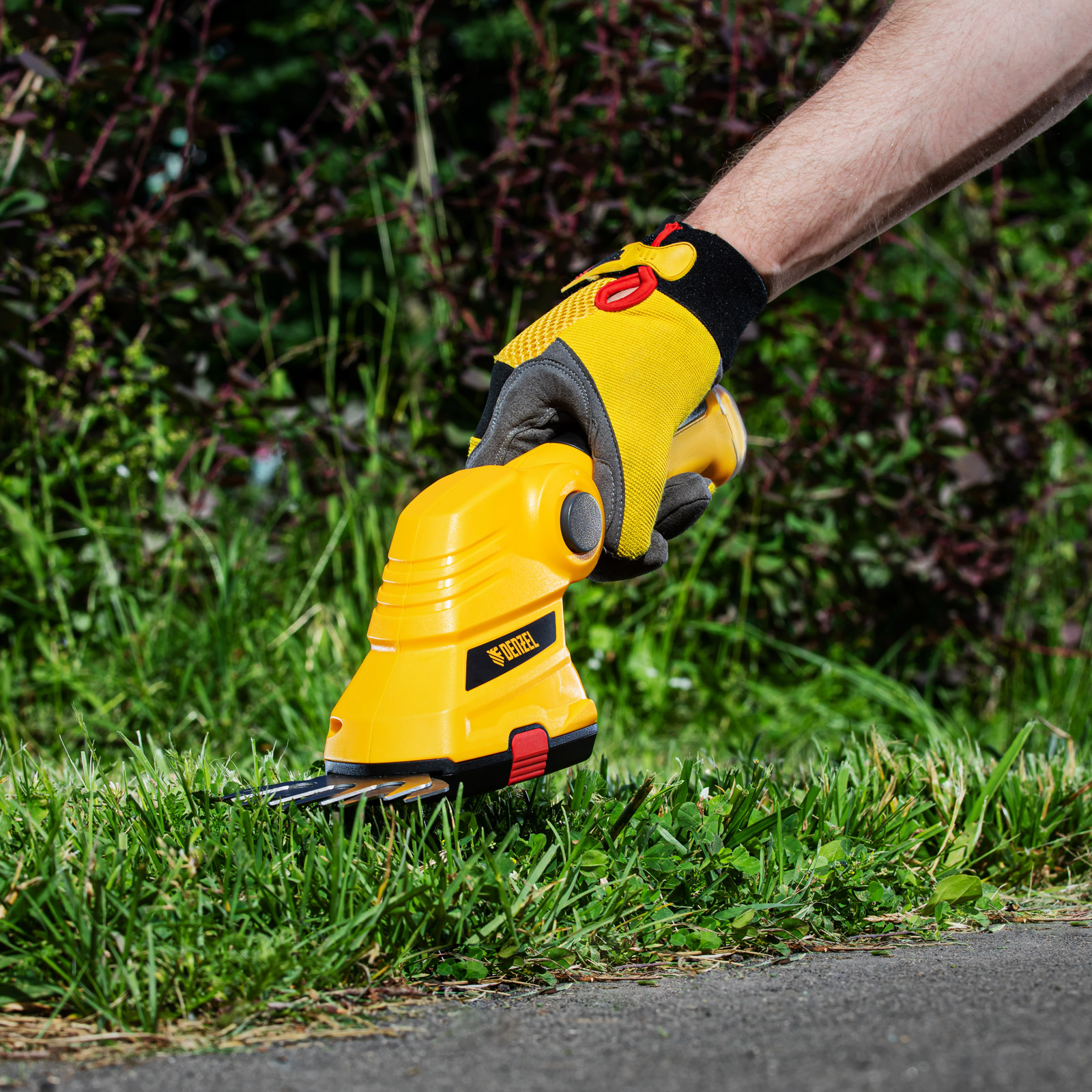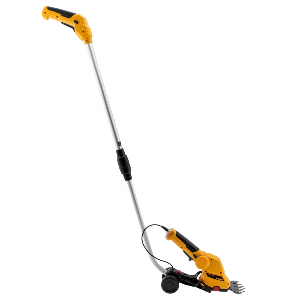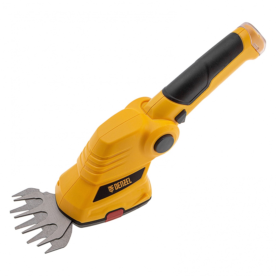 Аккумуляторные ножницы-кусторез Denzel G801E 968157 с телескопической штангой, с Li-Ion батареей емкостью 1,5 Ач и напряжением 7,2 В, используются для ухода за садовым участком. Поставляются с двумя насадками: для подрезания газонной травы и для обрезки кустов и тонких веток деревьев. Небольшой вес 1,1 кг и съемная штанга с колесным блоком обеспечивают комфортное использование ножниц-кустореза. Преимущества: Надежный аккумулятор емкостью 1,5 Ач — работать без подзарядки можно до 50 минут. Автономность — аккумуляторный инструмент можно использовать вдали от дома. Экологичность — ножницы-кусторез не выделяют вредных выхлопов, не наносят вреда пользователю и окружающей среде. Эффективная работа — прочные двусторонние ножи заточены с обеих сторон и долго сохраняют остроту. Удобная эксплуатация — инструмент можно закрепить на телескопической штанге, регулируемой в диапазоне 800-1100 мм, что позволяет выполнять работы в труднодоступных местах. Регулируемый угол наклона — фиксация рукоятки в нужном положении позволяет добиться точной и аккуратной обработки растений. Долговечность — медная обмотка двигателя устойчива к перегреву и обеспечивает стабильную работу ножниц-кустореза даже при высоких нагрузках. Система быстрой смены оснастки — переключение между задачами не занимает много времени. Гарантия 3 года — качество инструмента подтверждено производителем.
