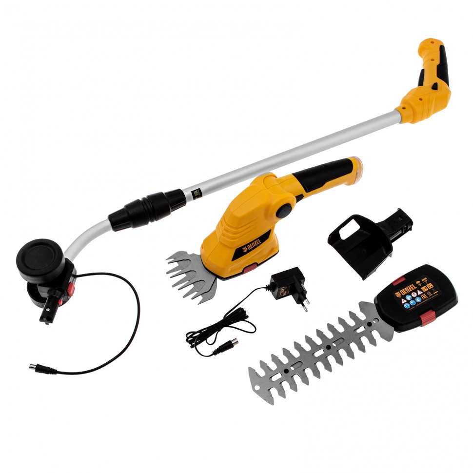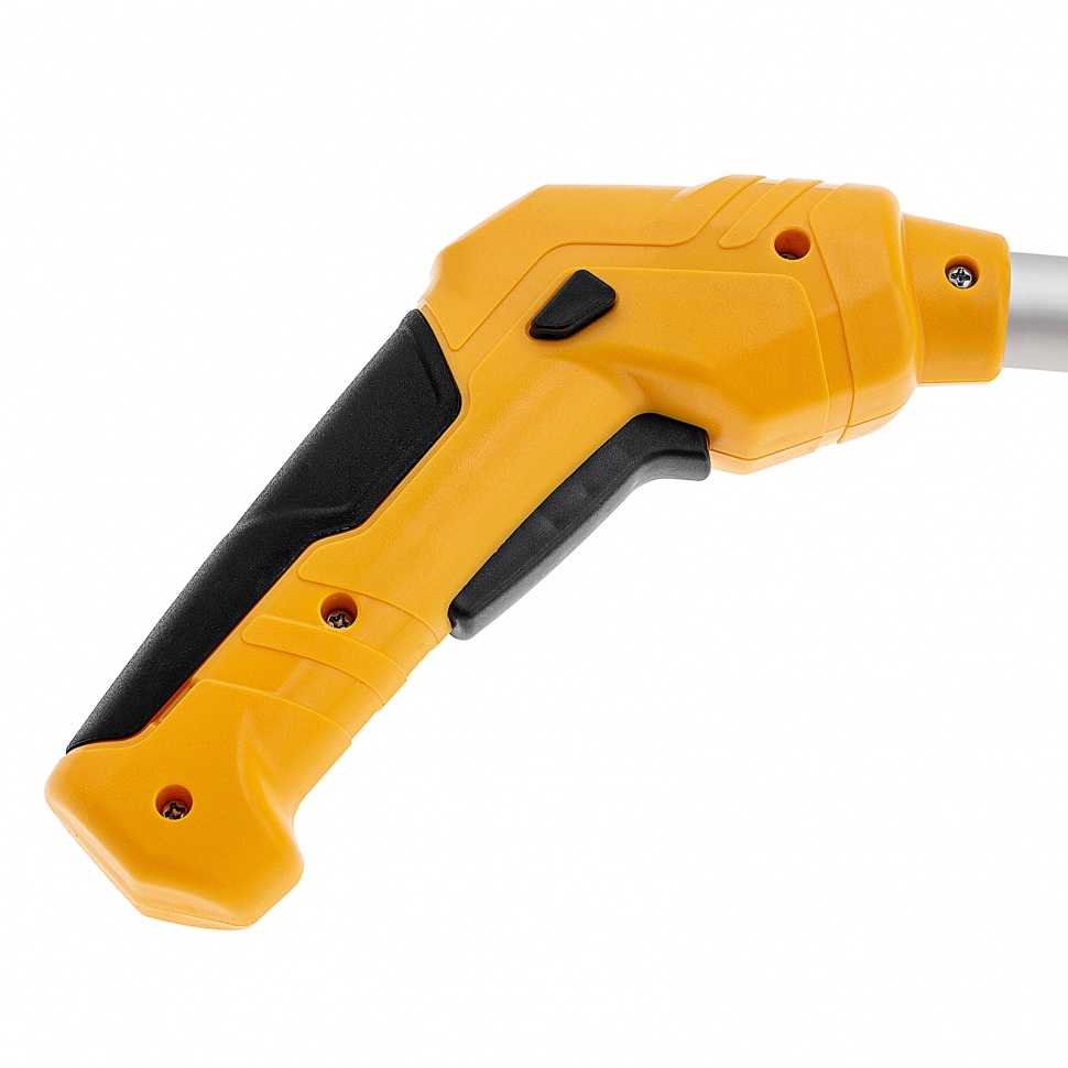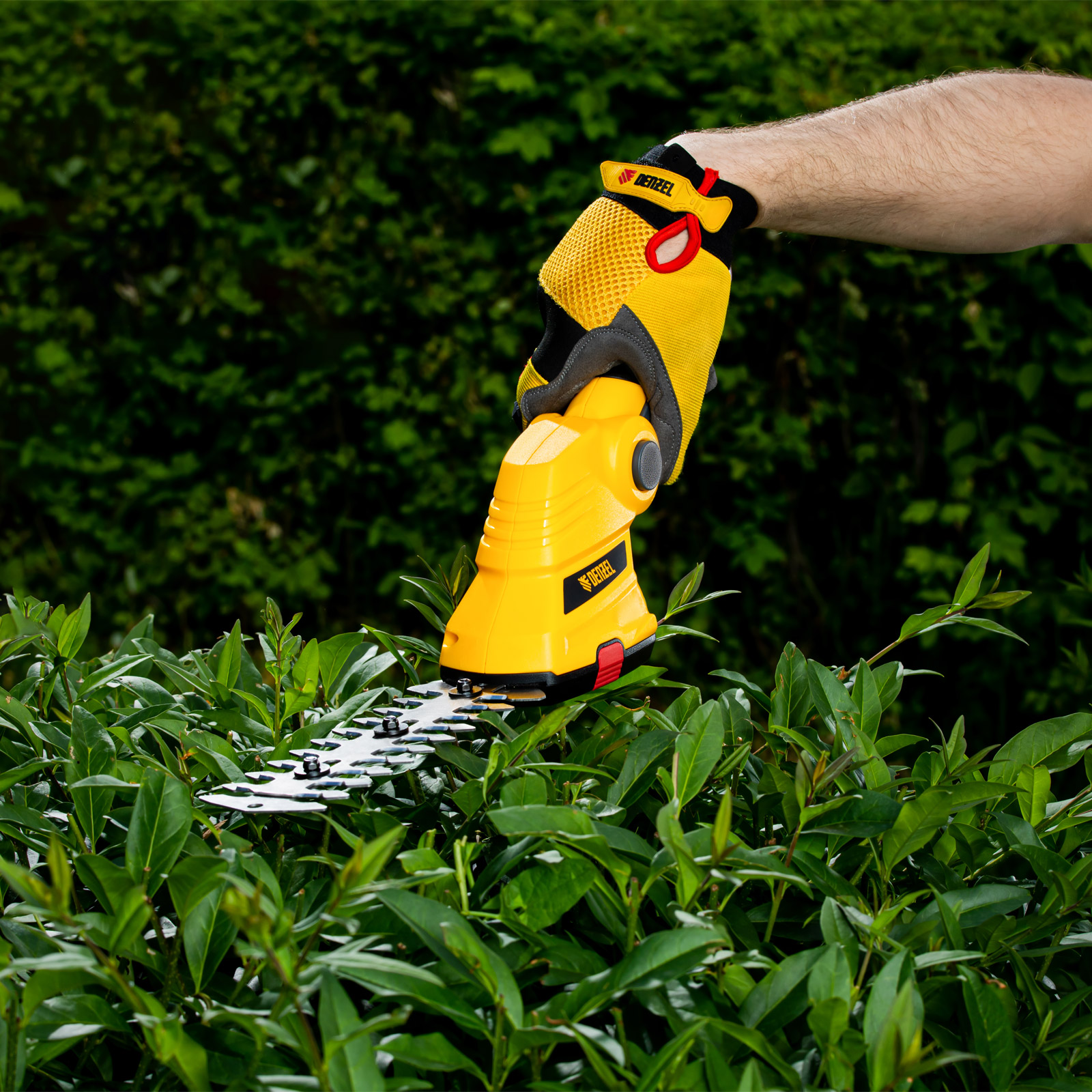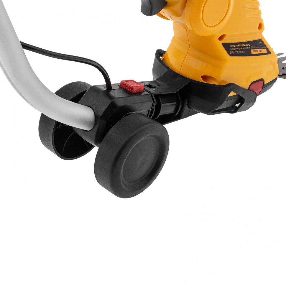 Аккумуляторные ножницы-кусторез Denzel G801E 968157 с телескопической штангой, с Li-Ion батареей емкостью 1,5 Ач и напряжением 7,2 В, используются для ухода за садовым участком. Поставляются с двумя насадками: для подрезания газонной травы и для обрезки кустов и тонких веток деревьев. Небольшой вес 1,1 кг и съемная штанга с колесным блоком обеспечивают комфортное использование ножниц-кустореза. Преимущества: Надежный аккумулятор емкостью 1,5 Ач — работать без подзарядки можно до 50 минут. Автономность — аккумуляторный инструмент можно использовать вдали от дома. Экологичность — ножницы-кусторез не выделяют вредных выхлопов, не наносят вреда пользователю и окружающей среде. Эффективная работа — прочные двусторонние ножи заточены с обеих сторон и долго сохраняют остроту. Удобная эксплуатация — инструмент можно закрепить на телескопической штанге, регулируемой в диапазоне 800-1100 мм, что позволяет выполнять работы в труднодоступных местах. Регулируемый угол наклона — фиксация рукоятки в нужном положении позволяет добиться точной и аккуратной обработки растений. Долговечность — медная обмотка двигателя устойчива к перегреву и обеспечивает стабильную работу ножниц-кустореза даже при высоких нагрузках. Система быстрой смены оснастки — переключение между задачами не занимает много времени. Гарантия 3 года — качество инструмента подтверждено производителем.