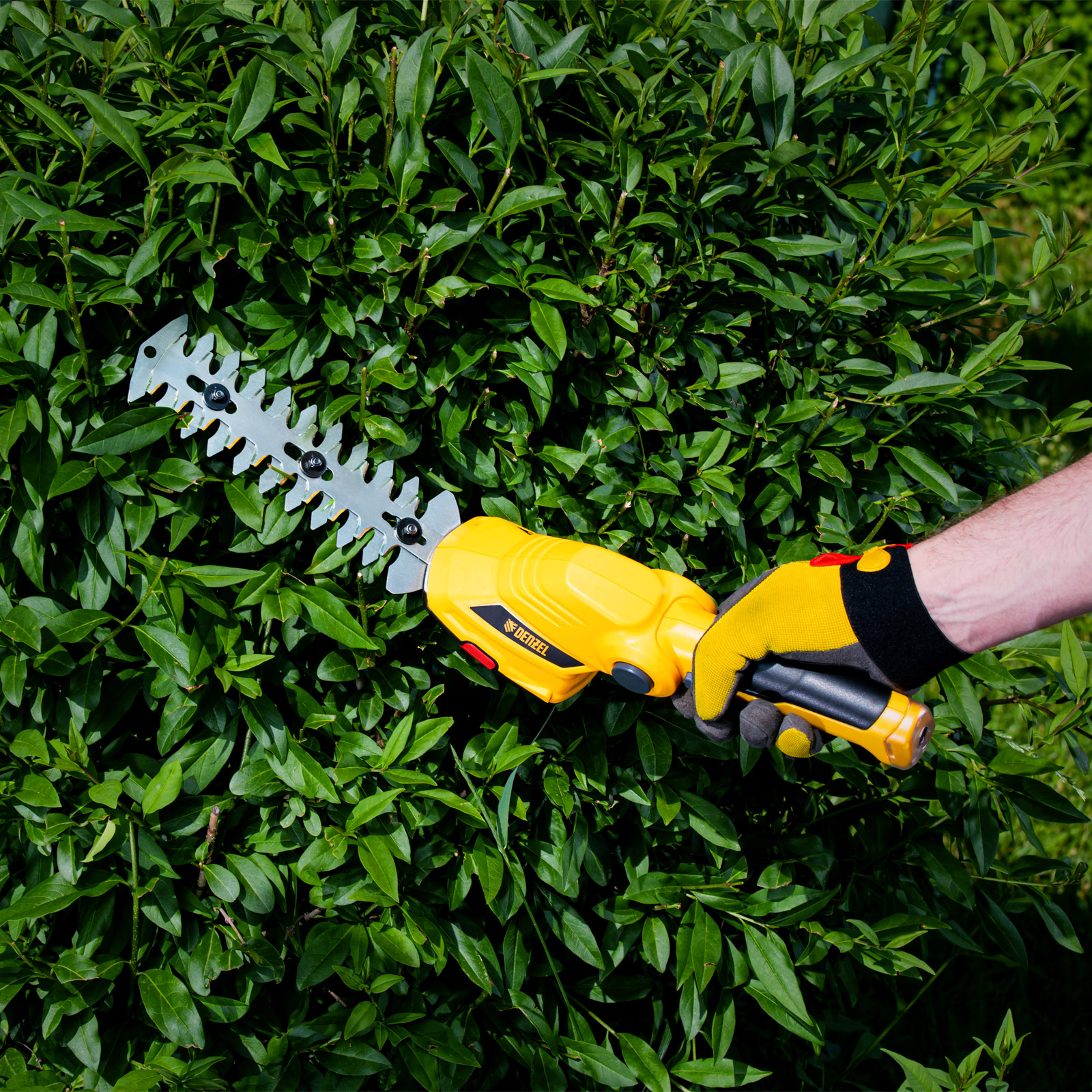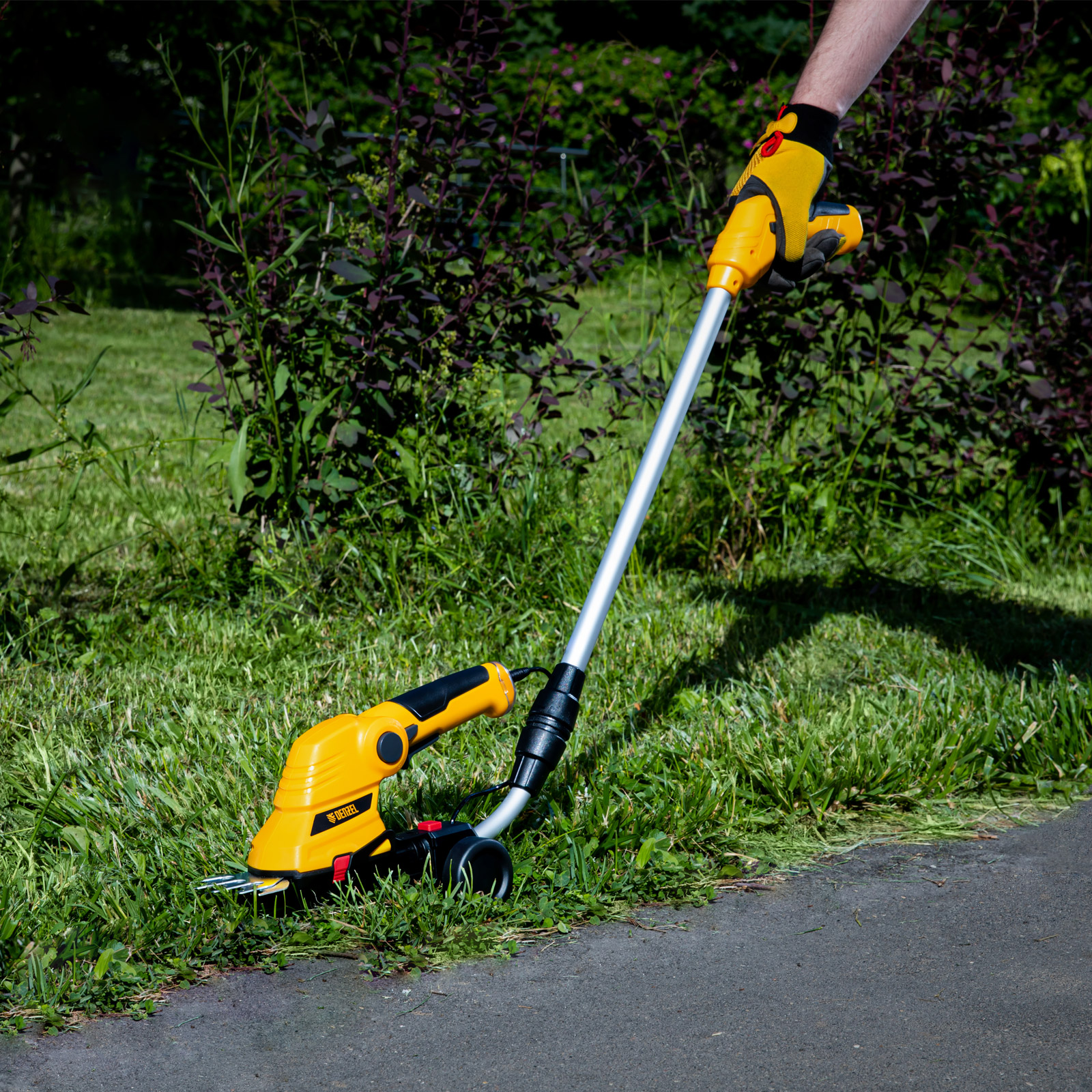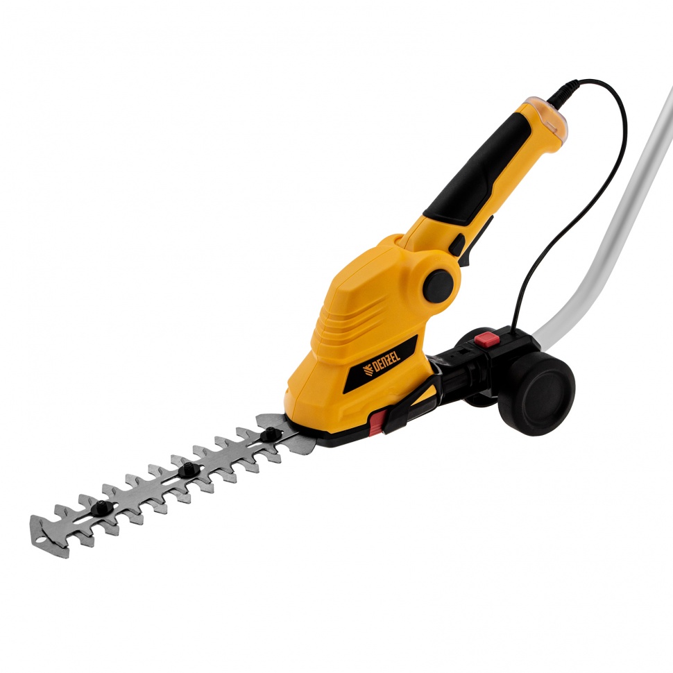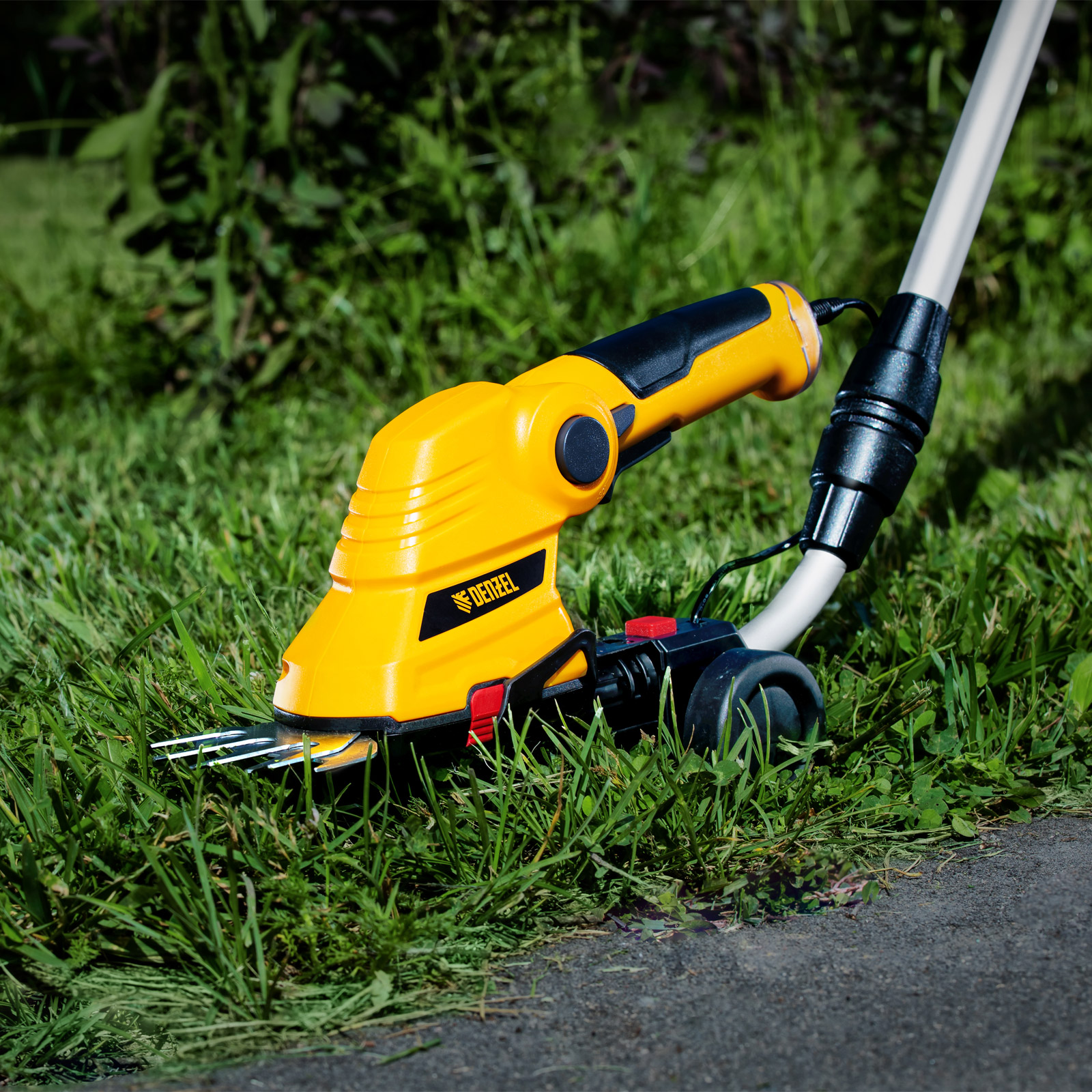 Аккумуляторные ножницы-кусторез Denzel G801E 968157 с телескопической штангой, с Li-Ion батареей емкостью 1,5 Ач и напряжением 7,2 В, используются для ухода за садовым участком. Поставляются с двумя насадками: для подрезания газонной травы и для обрезки кустов и тонких веток деревьев. Небольшой вес 1,1 кг и съемная штанга с колесным блоком обеспечивают комфортное использование ножниц-кустореза. Преимущества: Надежный аккумулятор емкостью 1,5 Ач — работать без подзарядки можно до 50 минут. Автономность — аккумуляторный инструмент можно использовать вдали от дома. Экологичность — ножницы-кусторез не выделяют вредных выхлопов, не наносят вреда пользователю и окружающей среде. Эффективная работа — прочные двусторонние ножи заточены с обеих сторон и долго сохраняют остроту. Удобная эксплуатация — инструмент можно закрепить на телескопической штанге, регулируемой в диапазоне 800-1100 мм, что позволяет выполнять работы в труднодоступных местах. Регулируемый угол наклона — фиксация рукоятки в нужном положении позволяет добиться точной и аккуратной обработки растений. Долговечность — медная обмотка двигателя устойчива к перегреву и обеспечивает стабильную работу ножниц-кустореза даже при высоких нагрузках. Система быстрой смены оснастки — переключение между задачами не занимает много времени. Гарантия 3 года — качество инструмента подтверждено производителем.