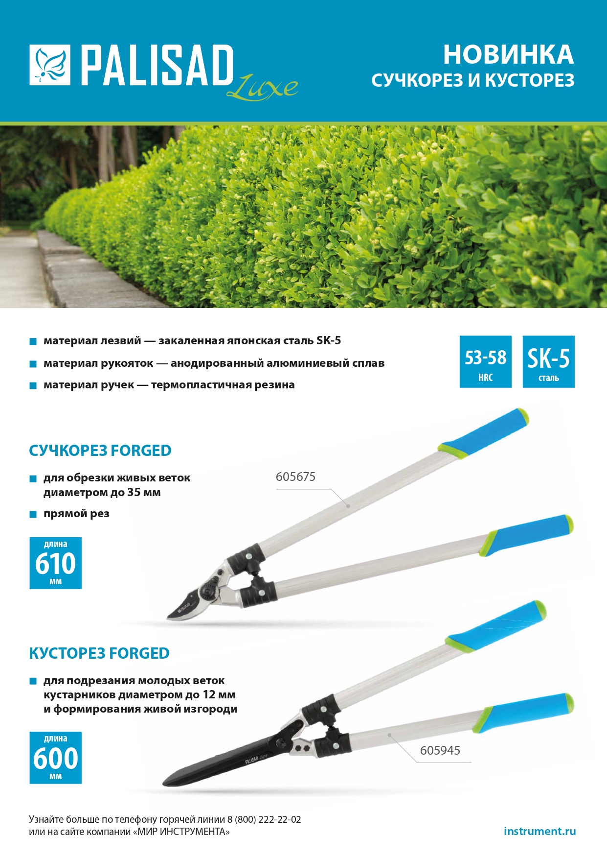 Кусторез кованый Palisad Forged LUXE 605945 длиной 600 мм, с алюминиевыми обрезиненными рукоятками, предназначен для подрезки крон деревьев и кустов с ветками диаметром до 12 мм. С его помощью можно создать живую изгородь и омолодить растения, добиться увеличения прироста побегов и урожая. Инструмент пригодится как частным, так и профессиональным садоводам.Преимущества Надежность — кованые лезвия и основание из японской инструментальной стали выдерживают интенсивное использование. Высокий ресурс — лезвия прошли индукционную закалку, поэтому долго сохраняют режущие свойства. Коррозионная стойкость — на лезвия нанесено защитное хромовое покрытие. Прочность — рукоятки из алюминиевого сплава не подвержены коррозии, а благодаря овальному профилю выдерживают высокие нагрузки. Продуманная конструкция — ограничитель сжатия с демпфером предотвращает поломку инструмента. Комфортное использование — резиновые накладки на рукоятках обеспечивают надежный захват и препятствуют проскальзыванию инструмента в руках.