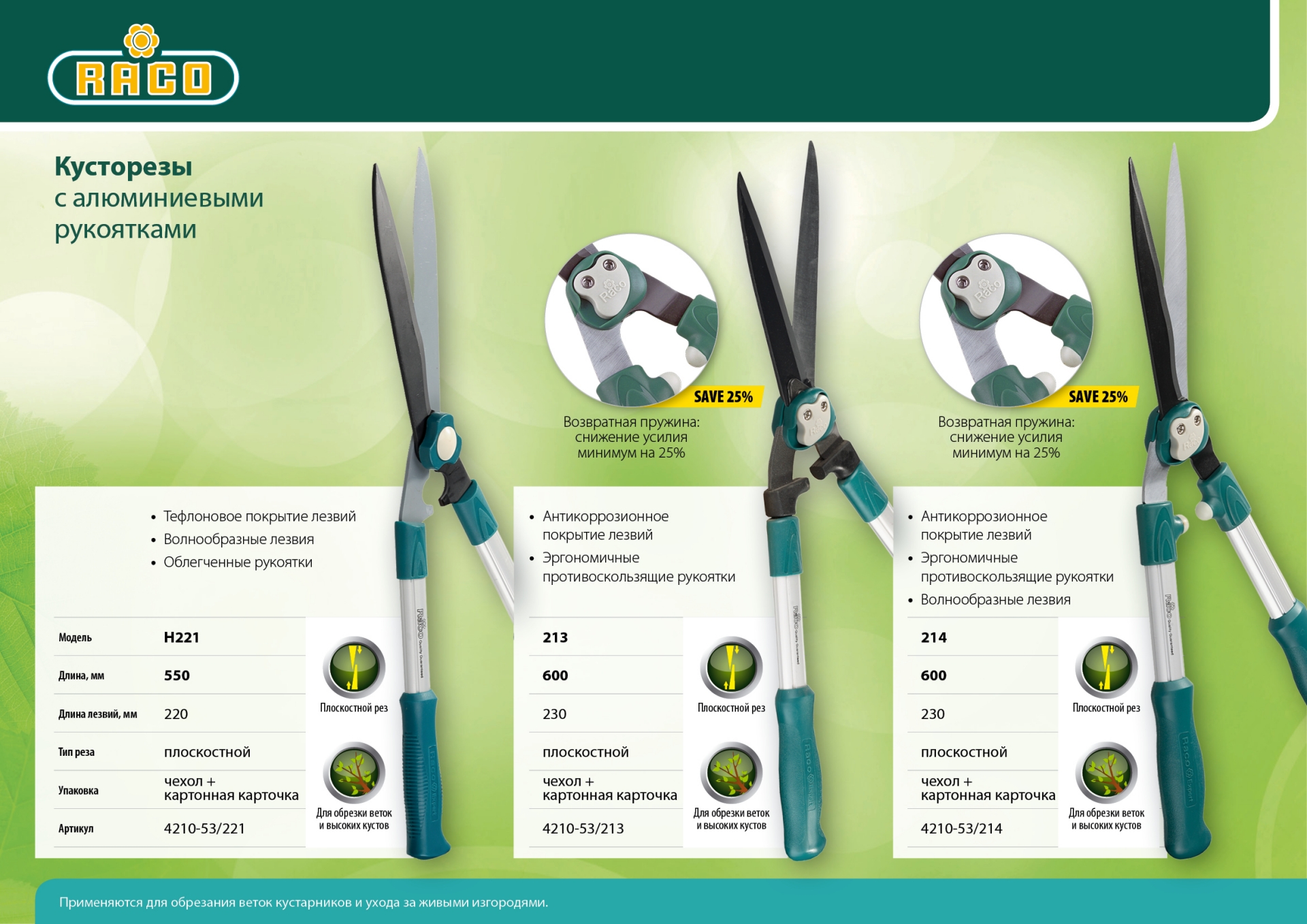 Кусторезы RACO изготовлены из современных и качественных материалов. Обеспечивают чистый рез, удобны в работе, надежны, с длительным сроком службы.