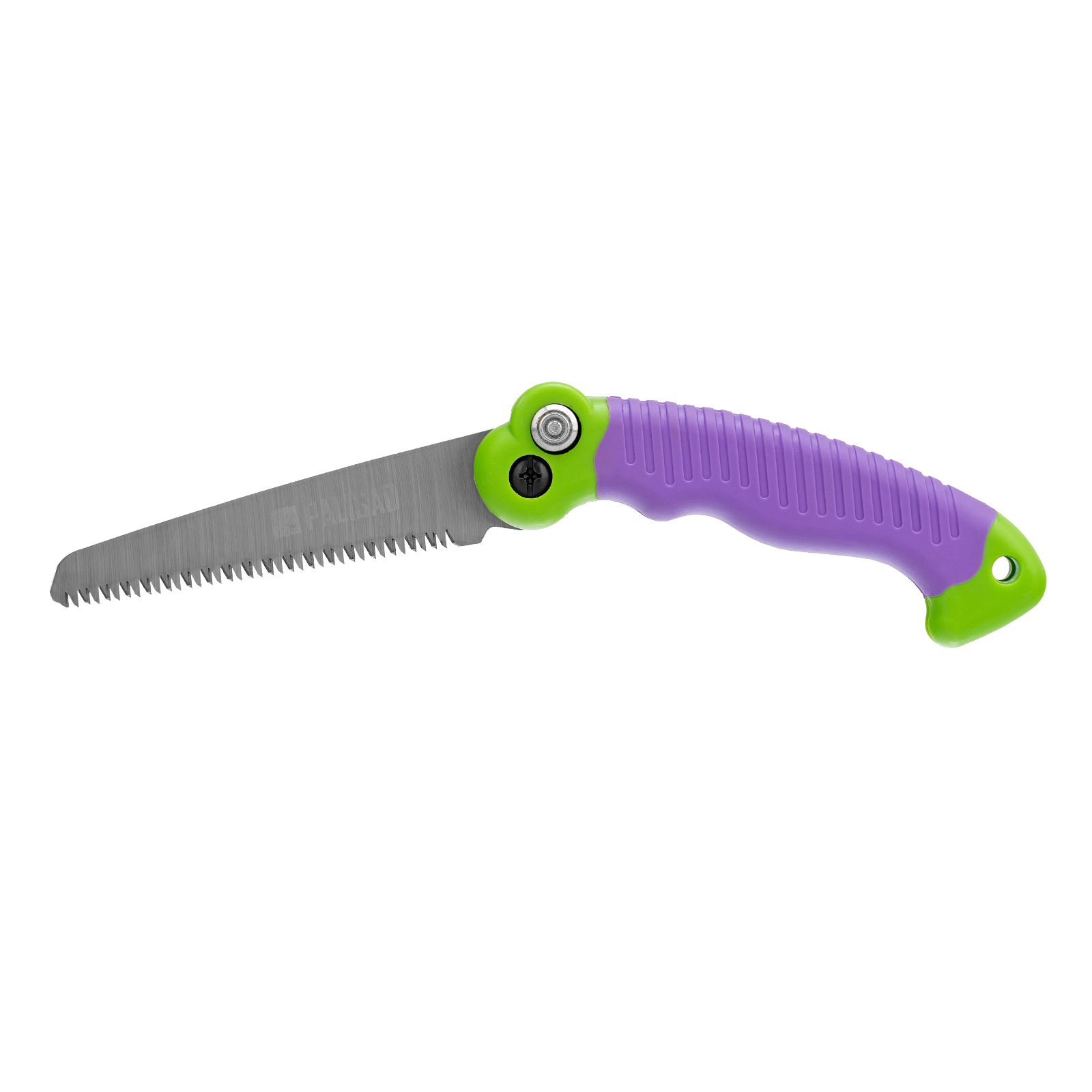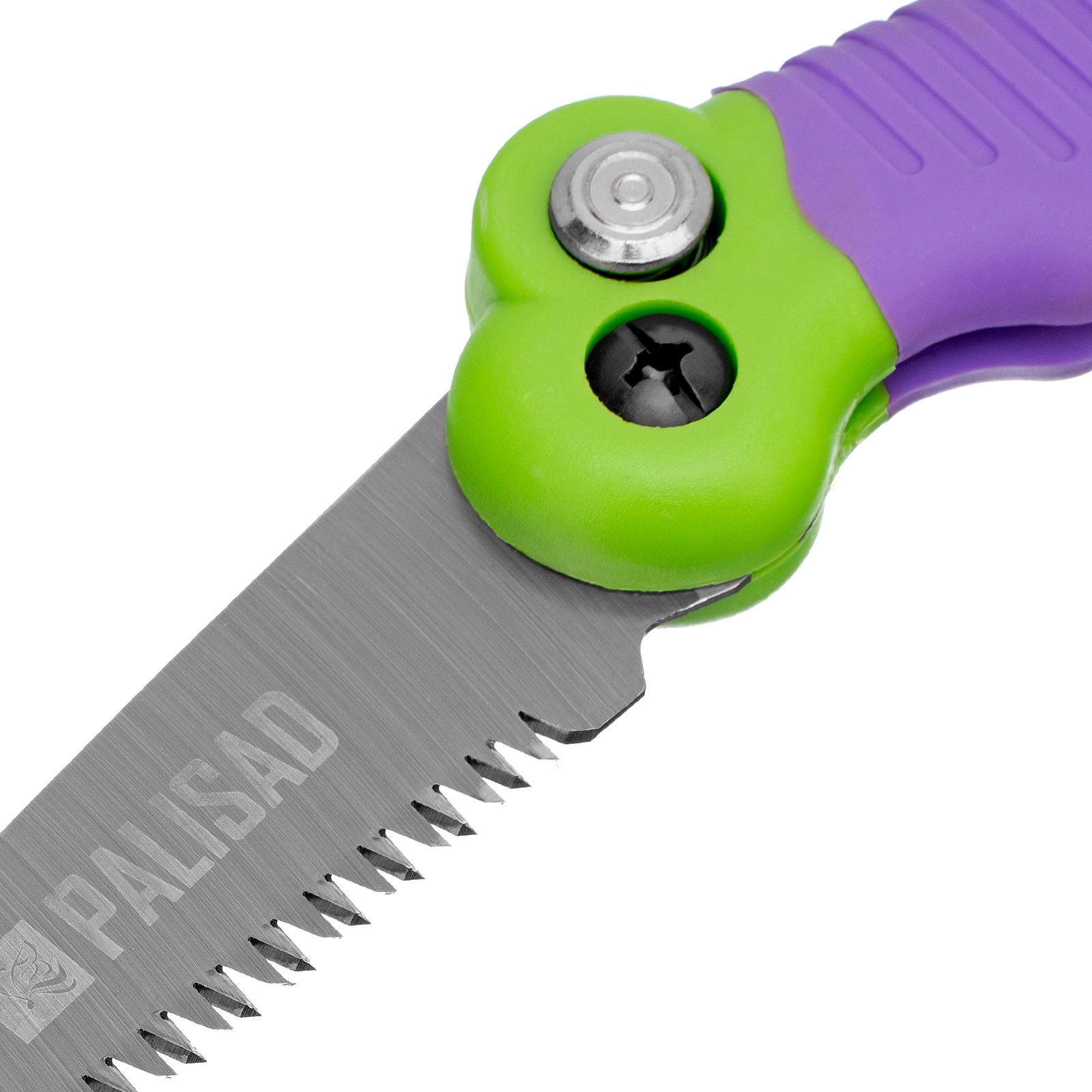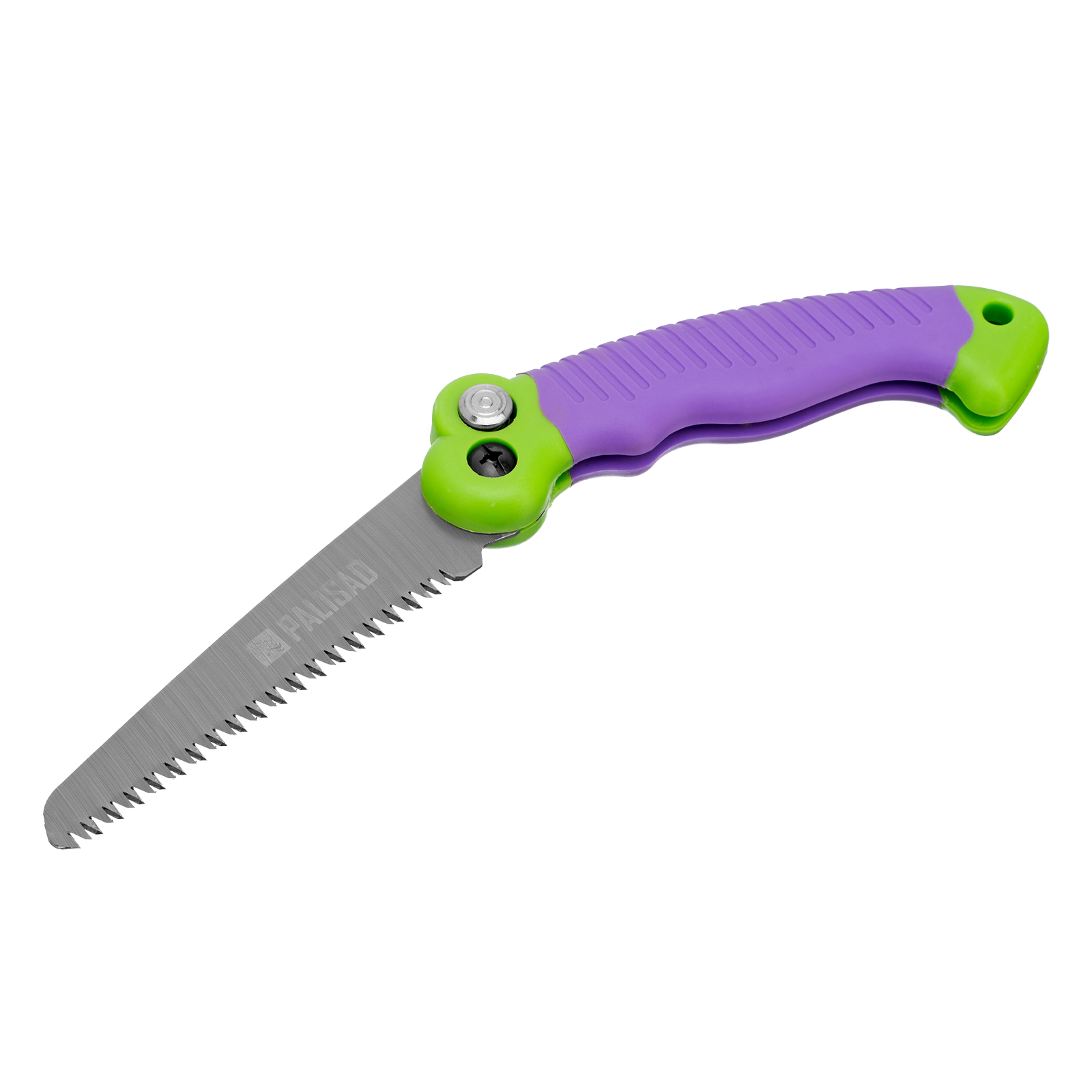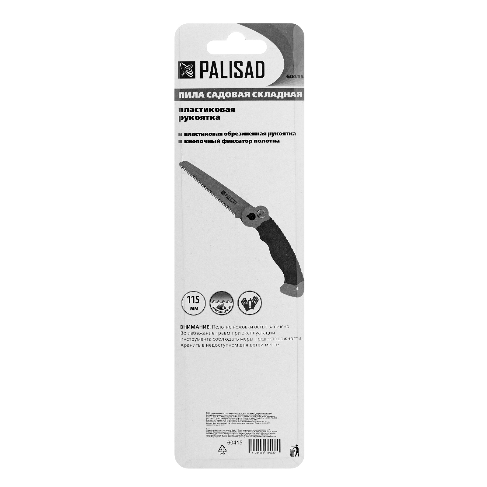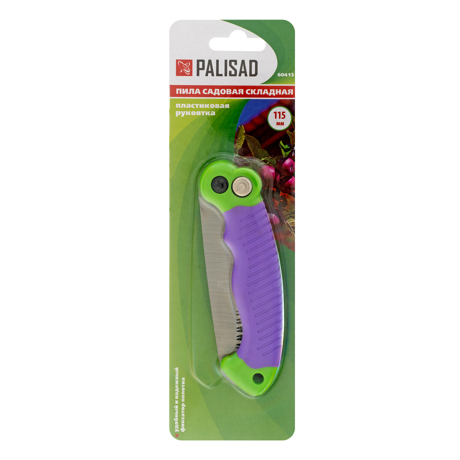 Садовая складная пила Palisad 60415 с рабочей частью длиной 115 мм и пластиковой обрезиненной рукояткой — удобный и компактный инструмент, который будет полезен не только в саду или на строительной площадке, но и в походе. Позволяет обрезать ветки деревьев, выполнять продольный и поперечный рез сухой или сырой древесины. Зубья с трехгранной заточкой обеспечивают эффективную работу при минимальных усилиях со стороны пользователя.ПреимуществаПрочность и долговечность — полотно изготовлено из рессорно-пружинной стали и покрыто лаком для защиты от коррозии.Обрезка живых веток — шаг зубьев составляет TPI 9-10, что обеспечивает чистый и ровный рез.Эффективная работа — зубья закалены до необходимой твердости, разведены и остро заточены.Продуманная конструкция — рукоятка одновременно служит ножнами для лезвия.Комфортная работа — двухкомпонентная обрезиненная рукоятка с рифленой поверхностью не выскальзывает из руки.Безопасное хранение и транспортировка — кнопочный фиксатор надежно удерживает лезвие в сложенном состоянии.