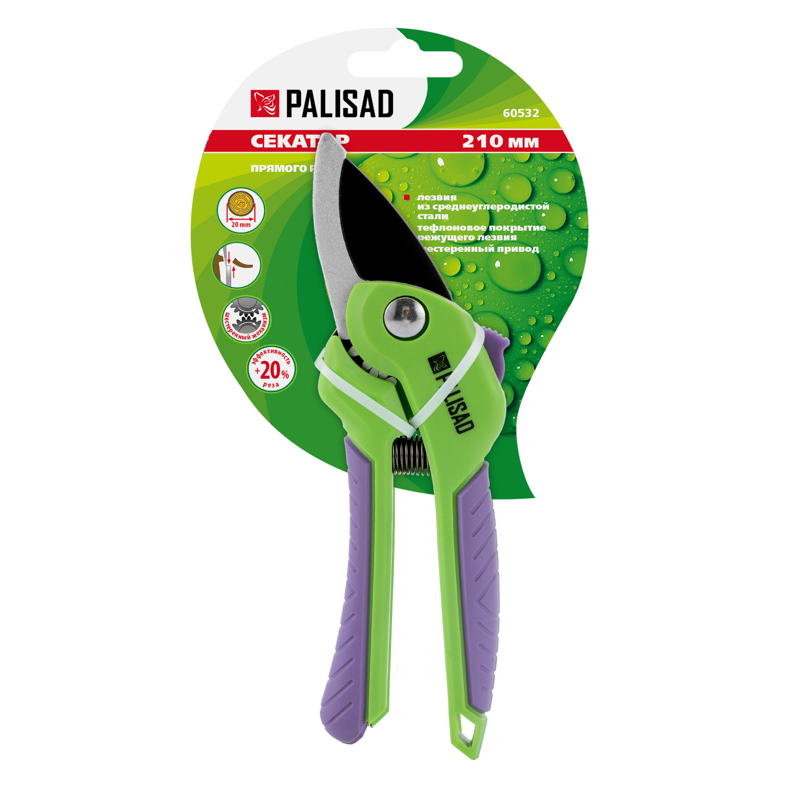 Секатор прямого реза Palisad 60532 длиной 210 мм, с шестеренным приводом и двухкомпонентными рукоятками, используется для щадящей обрезки живых веток толщиной до 20 мм. Режущее лезвие с тефлоновым покрытием легко справляется с этой задачей. Лезвия перемещаются в параллельных плоскостях, поэтому секатор производит чистый и ровный срез, минимально повреждая растение. Шестеренный привод увеличивает силу сжатия на 15%. ПреимуществаПрочность и долговечность — лезвия изготовлены из высокоуглеродистой стали, двухкомпонентные рукоятки не боятся воздействия ультрафиолета.Высокий ресурс — режущее лезвие прошло индукционную закалку, его кромка имеет прецизионную заточку. Контроль качества реза — регулировочный винт позволяет повысить плотность примыкания лезвий.Защита от образования коррозии — на режущее лезвие нанесено тефлоновое покрытие, опорное оцинковано.Комфортная работа — рукоятки со вставками из термопластичной резины обеспечивают надежный хват.Безопасное хранение и транспортировка — фиксатор удерживает лезвия в сомкнутом положении, не давая им самопроизвольно раскрыться.