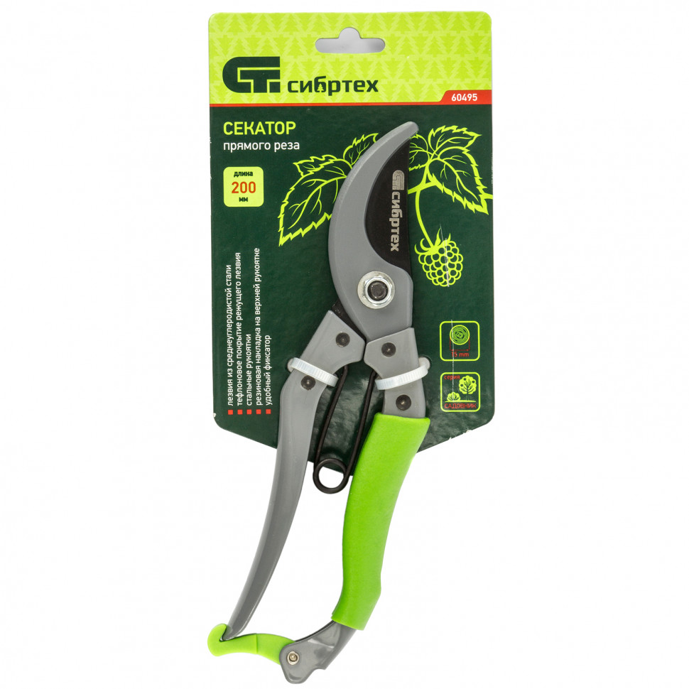 Секатор прямого реза Сибртех 60495 длиной 200 мм, с металлическим рукоятками, верхняя в ПВХ-оболочке, используется для ухода за садом и огородом. Предназначен для обрезания живых веток диаметром до 15 мм. Лезвие с прецизионной заточкой двигается в плоскости, параллельной опорному лезвию, чисто обрезая ветки и нанося минимальные повреждения растениям. Плотность примыкания лезвий регулируется — для этого предусмотрен винт.ПреимуществаНадежность — лезвия изготовлены из среднеуглеродистой стали, стальные профилированные рукоятки выдерживают высокие нагрузки.Износостойкость — рабочая кромка прошла индукционную закалку и долго сохраняет режущую способность.Легкий рез и устойчивость к разрушению — режущее лезвие имеет тефлоновое покрытие.Защита от коррозии — опорное лезвие покрыто порошковой эмалью.Безопасное хранение и транспортировка — фиксатор надежно удерживает лезвия в нерабочем положении.Комфортная работа — ПВХ-накладка на верхней рукоятке обеспечивает удобный хват.
