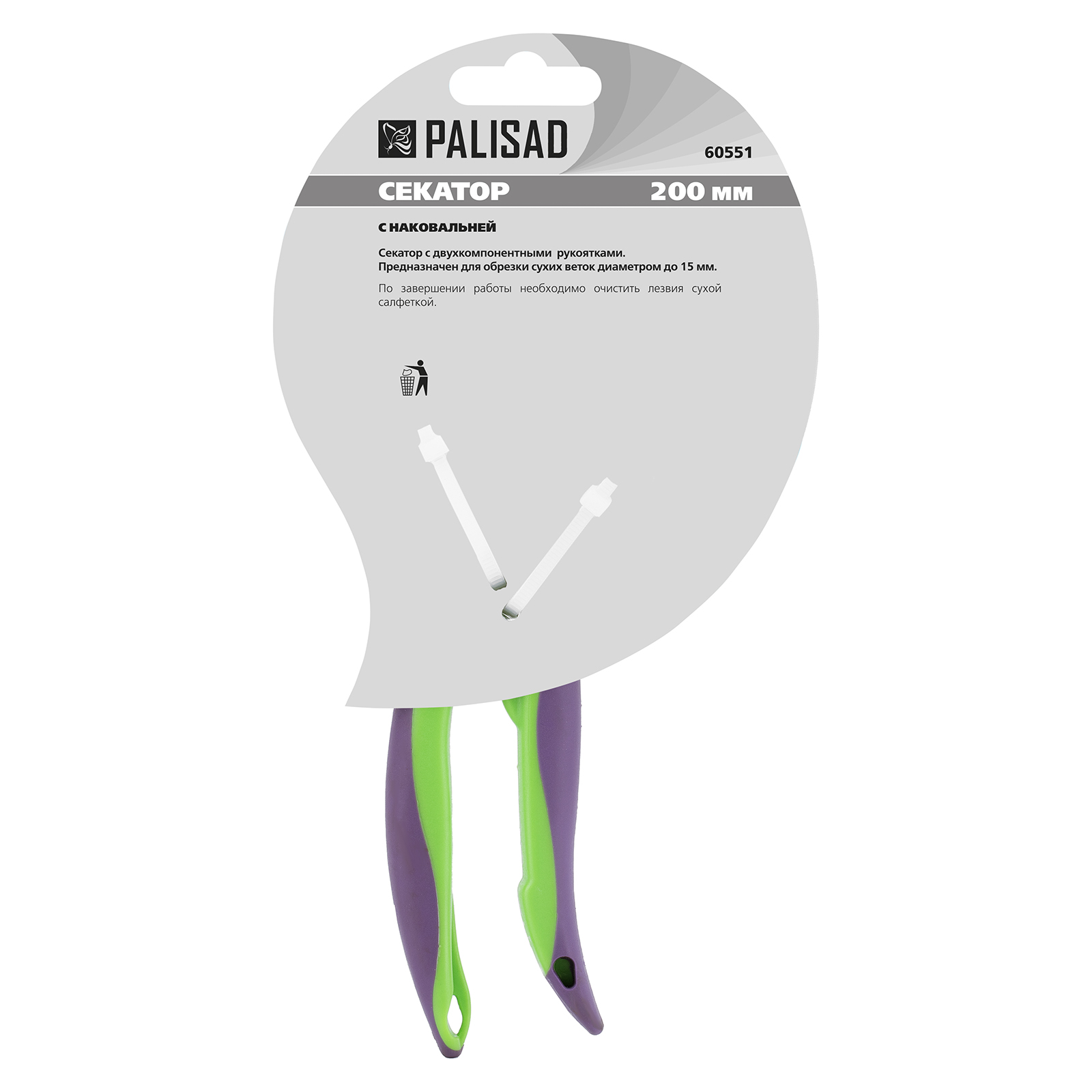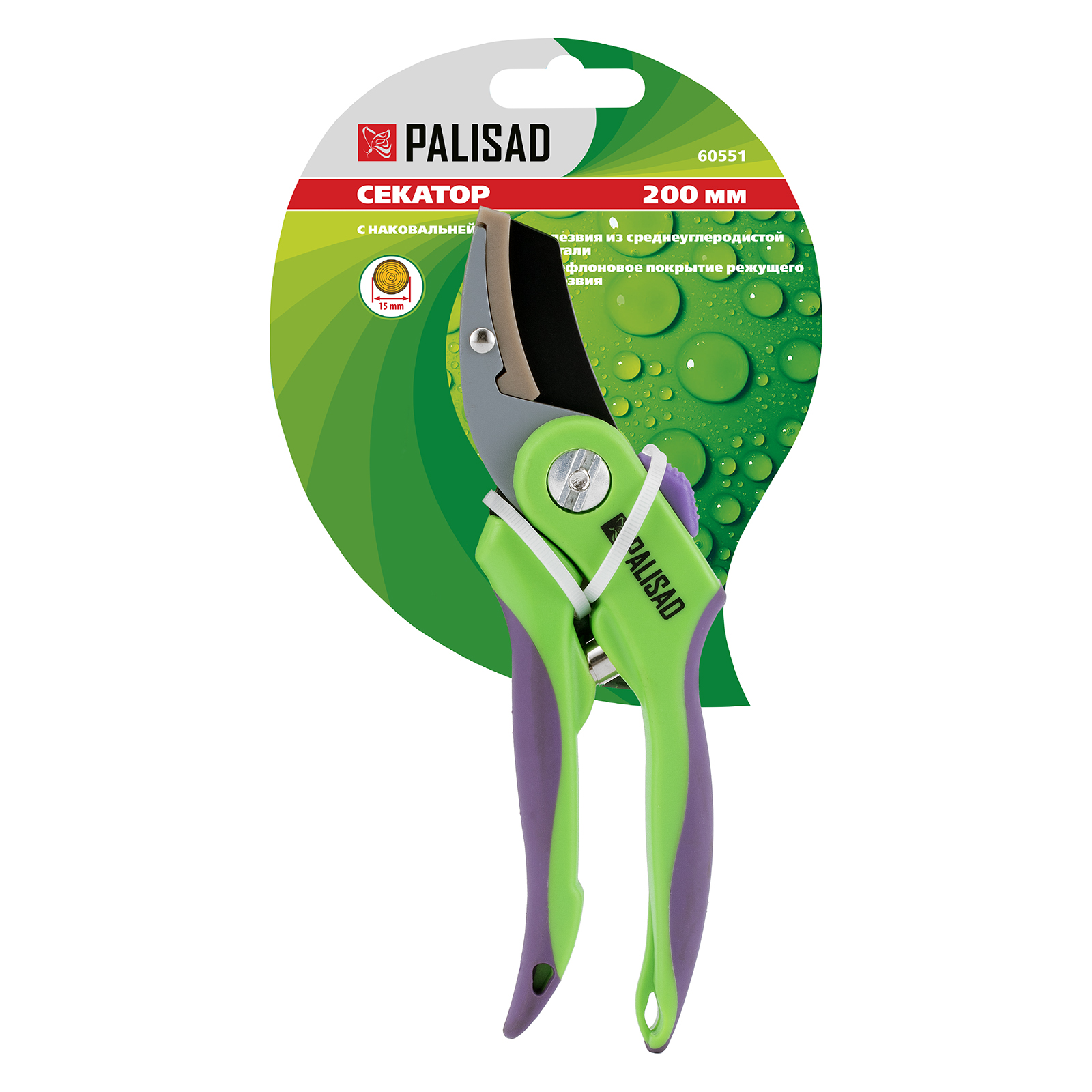 Секатор с наковальней Palisad 60551 длиной 200 мм, с двухкомпонентными рукоятками, — инструмент для срезания сухих и увядших веток толщиной до 15 мм. Благодаря тефлоновому покрытию лезвие легко и чисто отсекает ветку, при этом обрезка является максимально щадящей для растения. Опорная наковальня помогает фиксировать ветку, облегчая рез. Плотность смыкания лезвия и наковальни можно отрегулировать при помощи винта. Инструмент будет полезен для ухода за растительностью на даче и в саду.Преимущества Прочность и долговечность — рабочие части изготовлены из среднеуглеродистой стали, рукоятки — из полипропилена, устойчивого к воздействию ультрафиолета. Высокий ресурс — лезвие с индукционной закалкой и прецизионной заточкой долго сохраняет рабочие свойства. Защита от образования коррозии — на лезвие нанесено тефлоновое покрытие. Удобный захват — благодаря вставкам из термопластичной резины рукоятки не выскальзывают из ладони. Безопасное хранение и транспортировка — надежный фиксатор удерживает лезвия в сомкнутом положении.