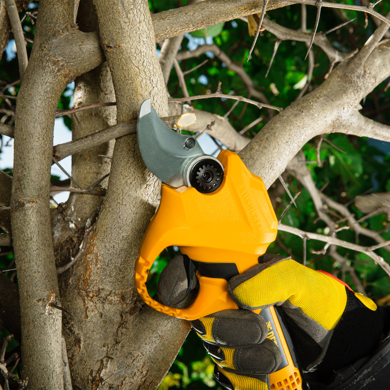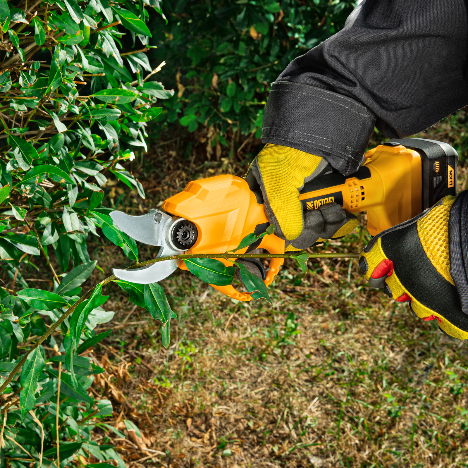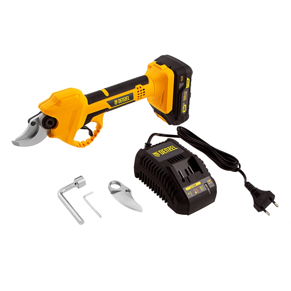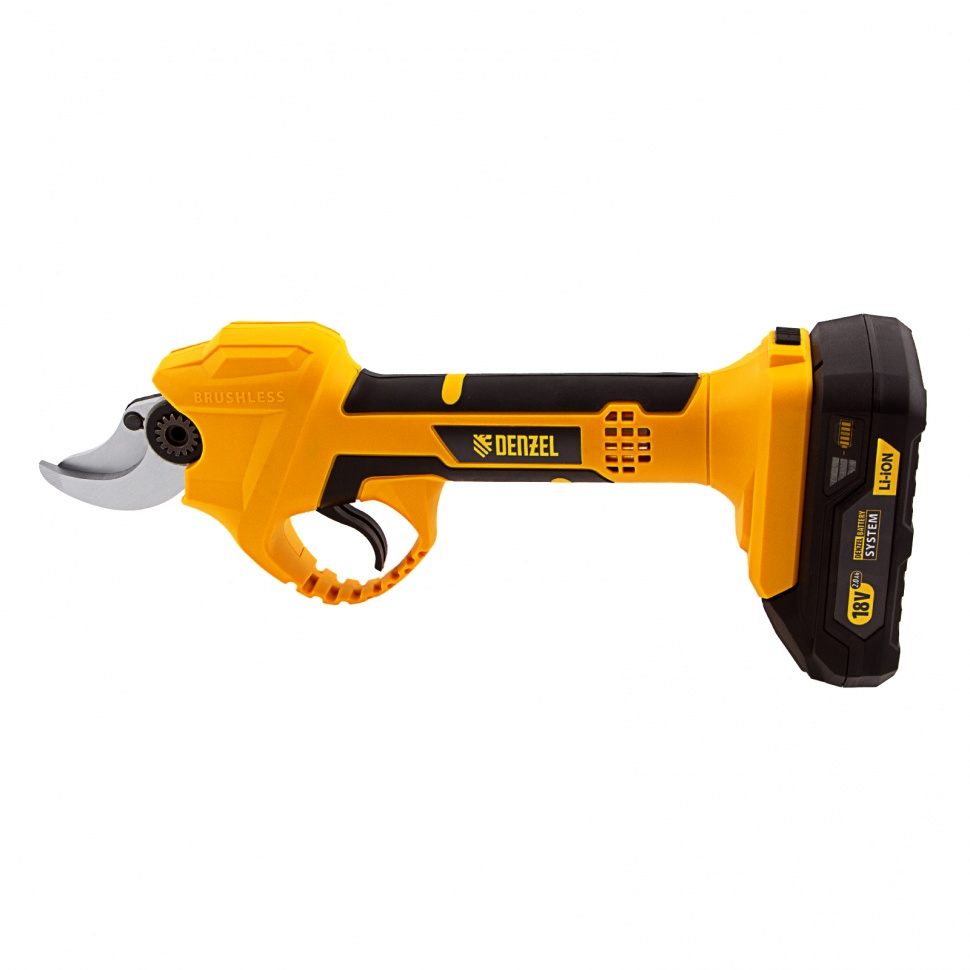 Аккумуляторный секатор Denzel CP-30 с батареей 18В Li-Ion предназначен для срезания ветвей толщиной до 30 мм. Станет незаменимым помощником для владельцев загородных домов, дач и плодовых питомников. Компактный бесщеточный электродвигатель обеспечивает эффективную работу инструмента. Секатор работает от аккумулятора, поэтому будет полезен при работе в труднодоступных местах и отдаленных участках сада. Преимущества Универсальность — аккумулятор 2Ач Li-ion совместим с любым инструментом 18V Denzel battery system серии IB. Прочность и долговечность — стальные лезвия закалены до твердости 55-60 HRC, благодаря чему долго остаются острыми. Защита от случайного пуска — блокировка куркового выключателя не допускает начало работы по неосторожности. Предотвращение случайного повторного включения — в случае, если отключение произошло по причине разрядки, секатор не запустится после установки заряженного аккумулятора, а перейдет в защищенный режим. Функция автоотключения — инструмент выключается примерно через 10 минут, такое решение повышает безопасность рабочего процесса. Быстрая подготовка к работе — полная зарядка аккумулятора занимает всего 1 час. Работа без простоев — LED индикатор на корпусе позволяет оценить оставшееся до подзарядки время. Комфортная эксплуатация — эргономичная форма инструмента обеспечивает надежный и удобный захват. Запасное подвижное лезвие в комплекте — возможность замены ножа позволяет избежать выход секатора из строя при поломке оснастки и оперативно заменить ее. Безопасное хранение и транспортировка — после выключения режущий узел переводится в сомкнутое положение, в комплекте имеется защитный чехол. Полный комплект поставки — аккумулятор и зарядное устройство прилагаются к секатору. Гарантия 3 года — качество инструмента подтверждено производителем.