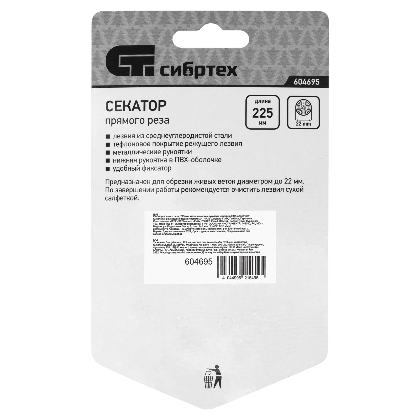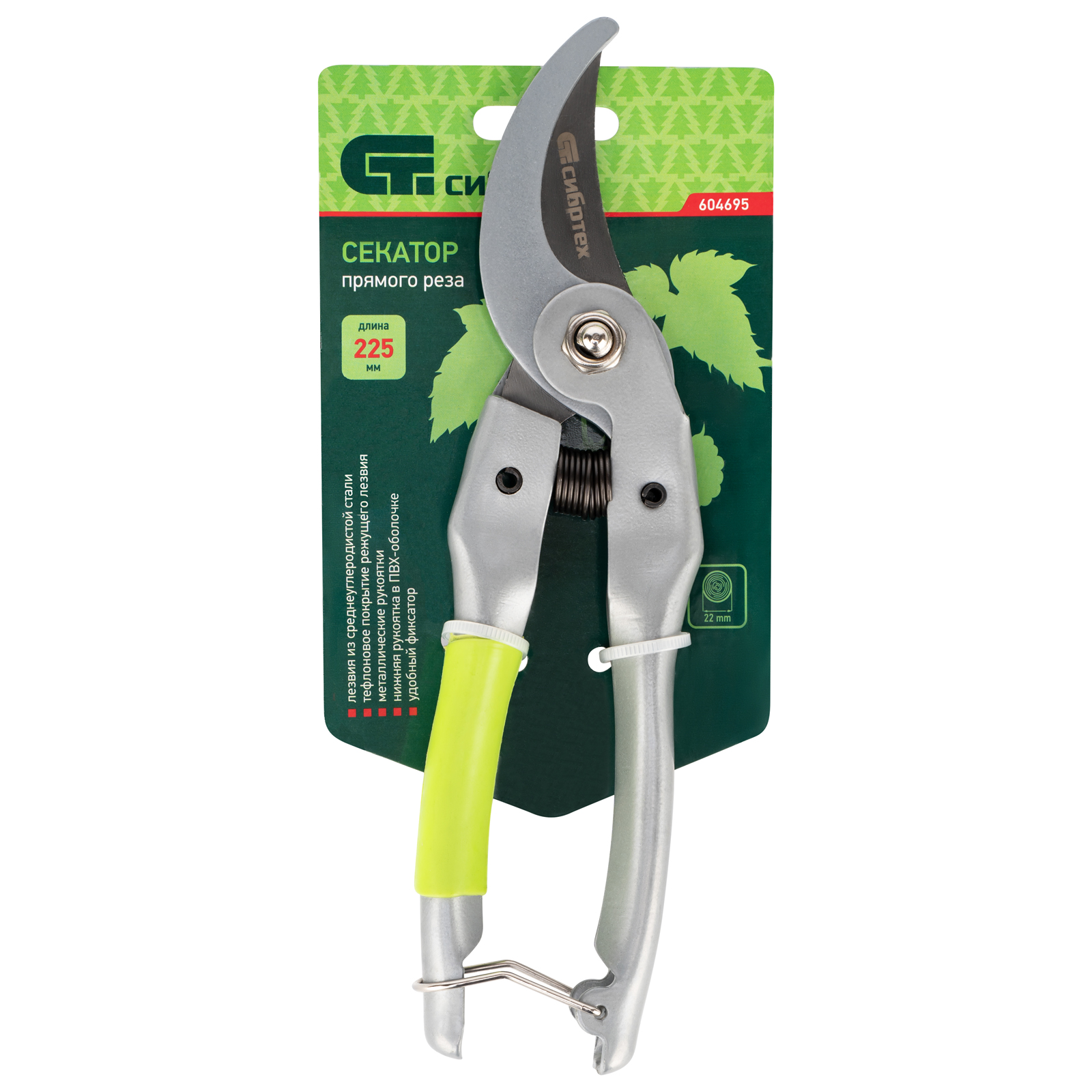 Секатор прямого реза Сибртех 604695 длиной 225 мм, с металлическими рукоятками (нижняя в ПВХ-оболочке), используется для обрезки живых веток толщиной до 22 мм. Срез получается гладким и аккуратным, поскольку лезвия перемещаются в параллельных плоскостях. Растению причиняется минимальный ущерб. Плотность примыкания лезвий можно регулировать при помощи винта. Секатор пригодится для ухода за растительностью на даче и в саду.ПреимуществаДолговечность — лезвия из прочной среднеуглеродистой стали устойчивы к износу.Высокий ресурс — режущее лезвие прошло индукционную закалку, а кромка имеет прецизионную заточку, поэтому секатор долго сохраняет рабочие свойства.Антикоррозионная защита — покрытие порошковой эмалью предохраняет рабочую часть от разрушения.Надежная конструкция — стальные профилированные рукоятки выдерживают значительные нагрузки на изгиб и излом.Безопасность пользователя — металлическая скоба фиксирует рукоятки в сжатом состоянии, что исключает риск случайного раскрытия лезвий во время хранения или транспортировки.Комфортная работа — ПВХ-накладка на нижней рукоятке обеспечивает удобный хват, препятствуя выскальзыванию инструмента.