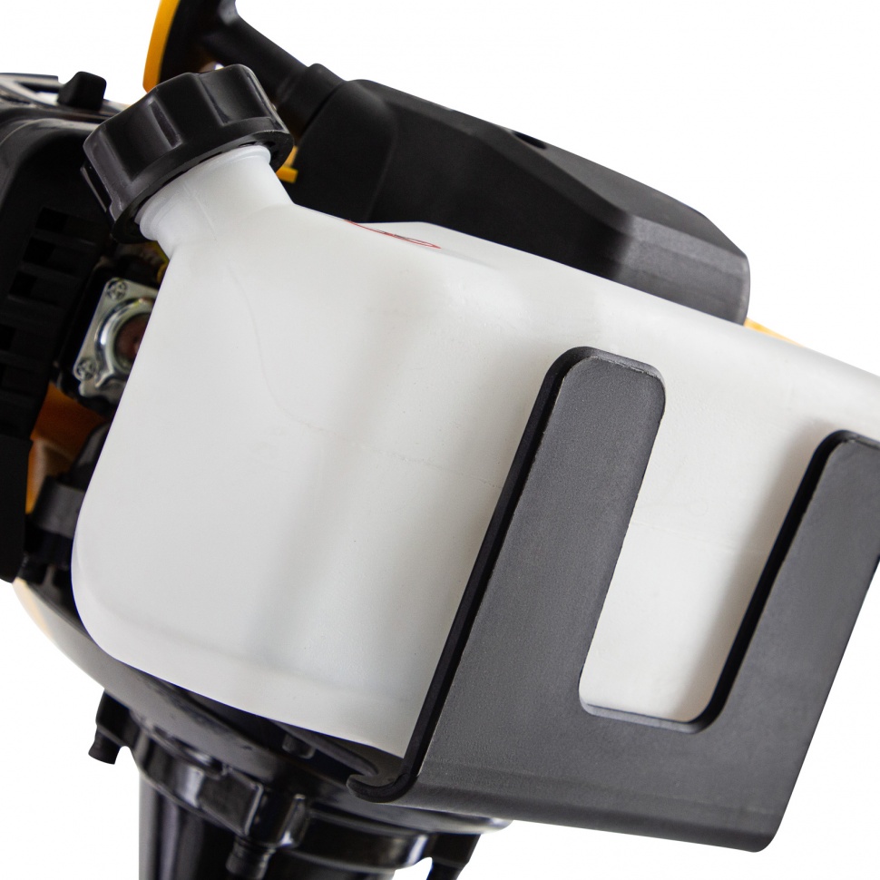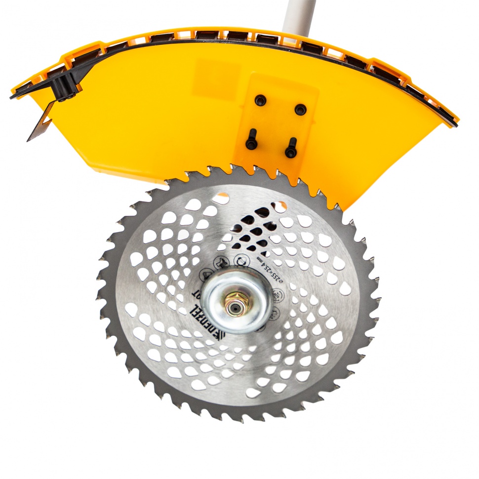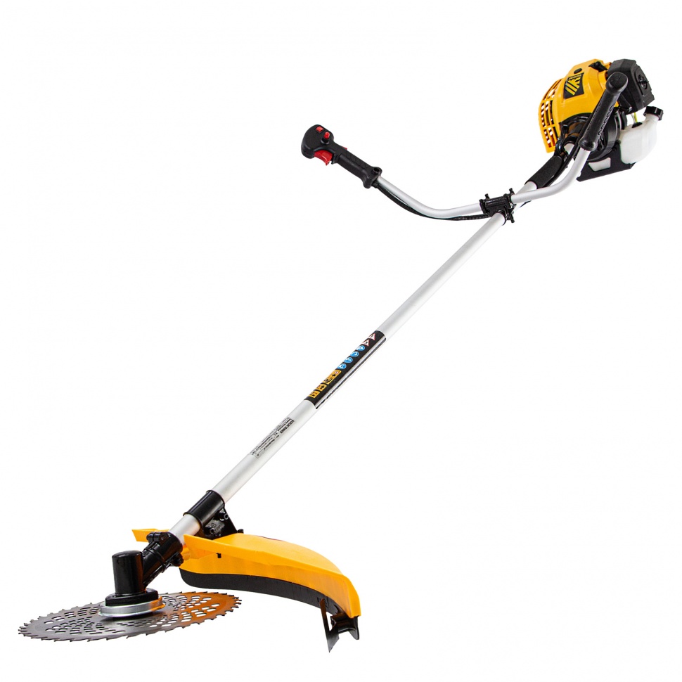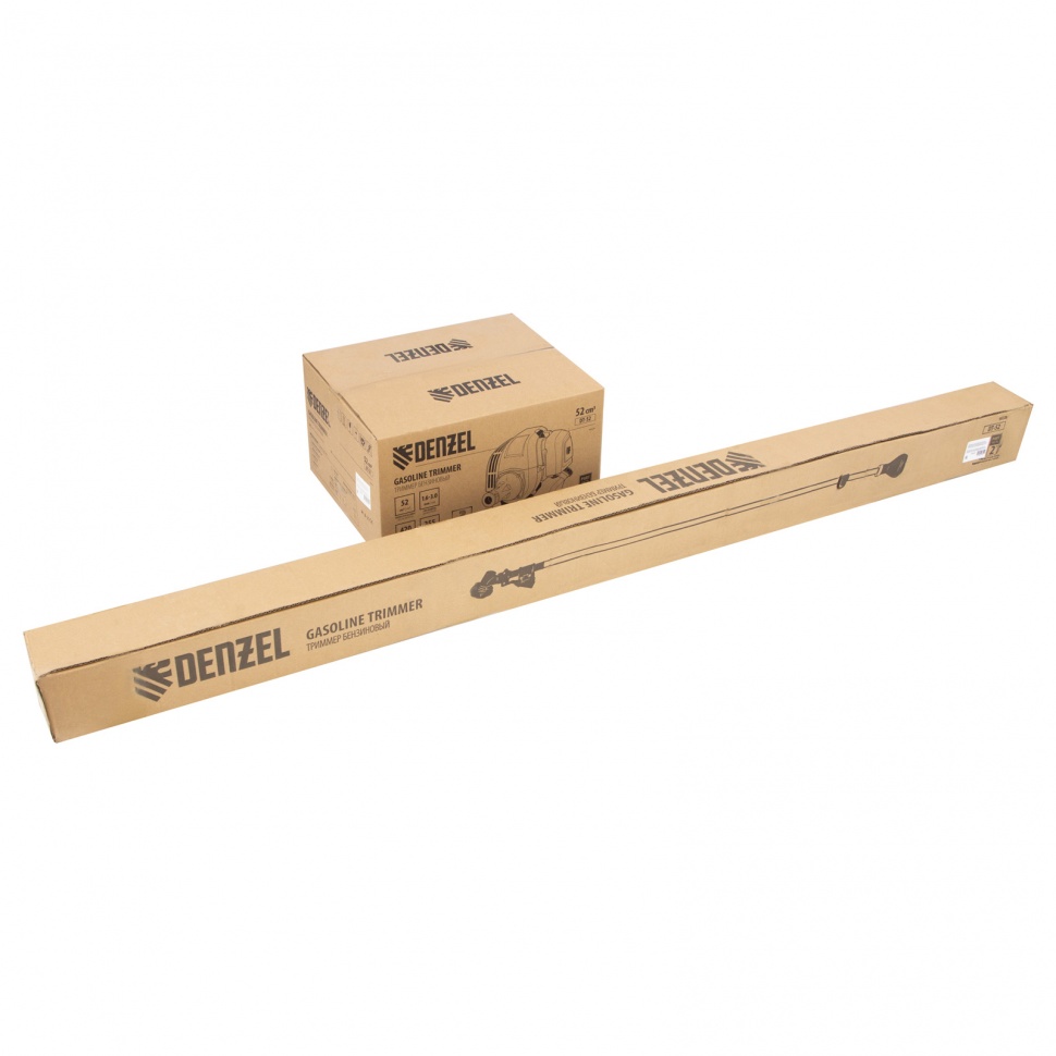 Бензиновый триммер Denzel DT-52 96226 оснащен экономичным, надежным и простым в эксплуатации двигателем мощностью 3 л.с. и объемом 52 см3, имеет неразъемную штангу и поставляется комплектом из 2 частей. Оптимален для подравнивания газона, избавления от травы с жесткими древовидными стеблями (полыни, крапивы, лебеды, борщевика), а также срезания кустарника и молодых побегов деревьев со стволами диаметром до 10 мм. Эффективно скашивает траву в труднодоступных местах: вдоль кромок дорожек, стен строений и вокруг деревьев. В комплект поставки входит катушка с леской для невысокой травы любой густоты, а также пильный диск для высокой сухой травы, лопухов, крапивы и борщевика. Испытаниями подтверждена возможность безотказной работы на протяжении не менее 80 часов.ПреимуществаВысокий ресурс — хромированный цилиндр двигателя, закаленный коленвал и поршень оптимизированной конструкции в несколько раз продлевают срок службы техники.Полуавтоматическая система подачи лески — достаточно слегка ударить катушкой о землю, не останавливая двигатель.Быстрый старт — благодаря усиленному классическому стартеру и праймеру (топливному насосу) двигатель легко запускается даже после долгого простоя.Низкий расход топлива — полного бака на 0,85 л хватает почти на 45 мин работы.Удобный контроль уровня топлива — бак изготовлен из полупрозрачного пластика.Надежность — прочная штанга выполнена из алюминия толщиной 1,5 мм.Удобное управление — все кнопки находятся на правой рукоятке под ладонью.Безопасность — пластиковый кожух защищает пользователя от вылетающей травы, камней, веток и мелких частиц.Продуманная конструкция — благодаря винтовому креплению крышки фильтр не выпадает во время работы, при необходимости его легко можно заменить.Эргономичность — велосипедные асимметричные ручки с прорезиненными рукоятками удобно лежат в руках.Комфортная работа — инструмент хорошо сбалансирован и оснащен системой гашения вибраций.Уменьшенная нагрузка на плечи и спину — триммер весит 7,6 кг и комплектуется наплечным ремнем.Дополнительные возможности — можно приобрести и установить на триммер диски Denzel 96323, 96325 для быстрого удаления растительности с жесткими стеблями, 96328 для скашивания молодых побегов кустарника диаметром до 3 мм.Подтвержденное качество — производитель предоставляет расширенную 3-летнюю гарантию на заводской брак.
