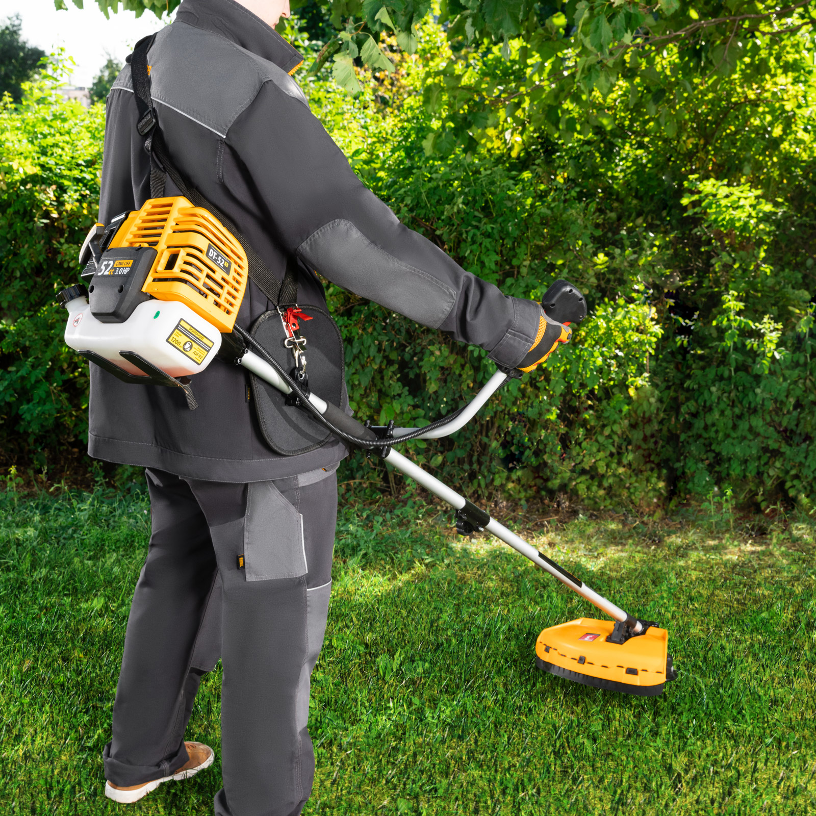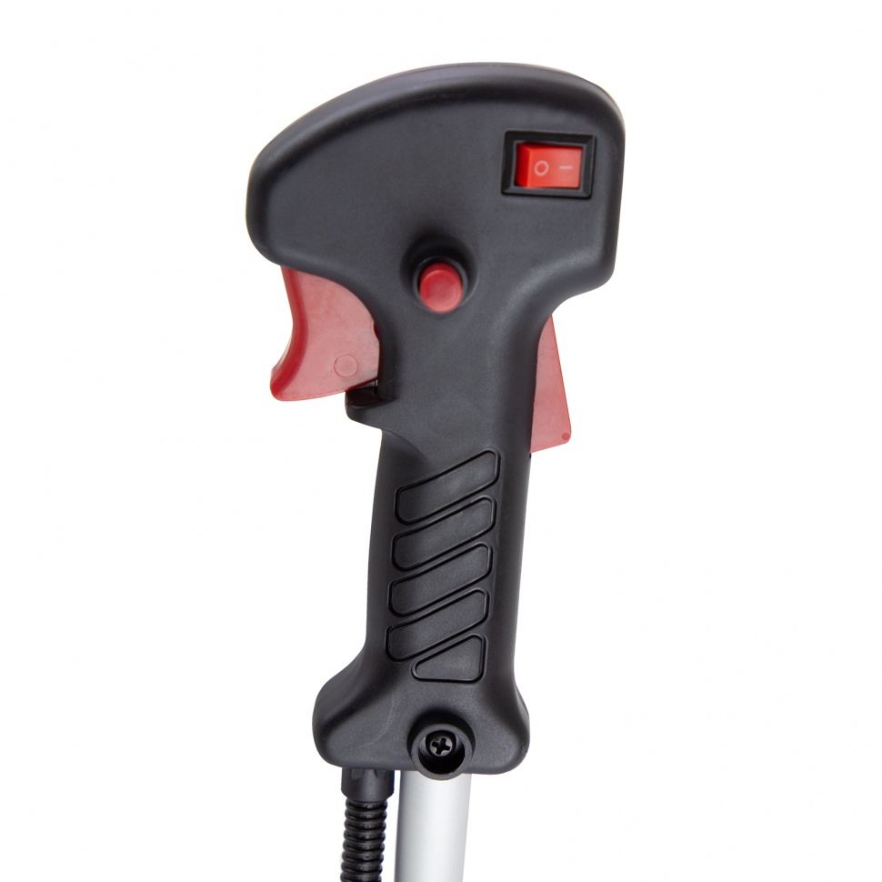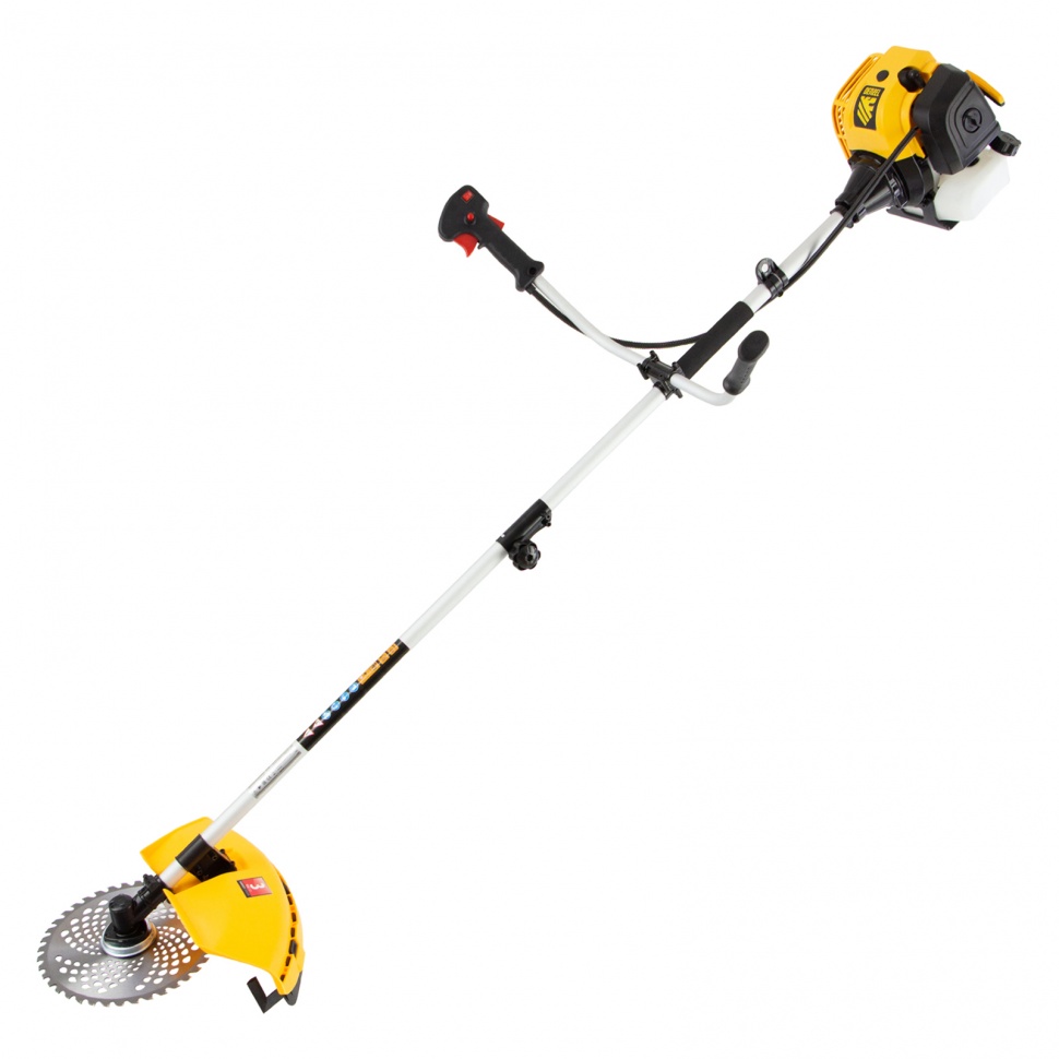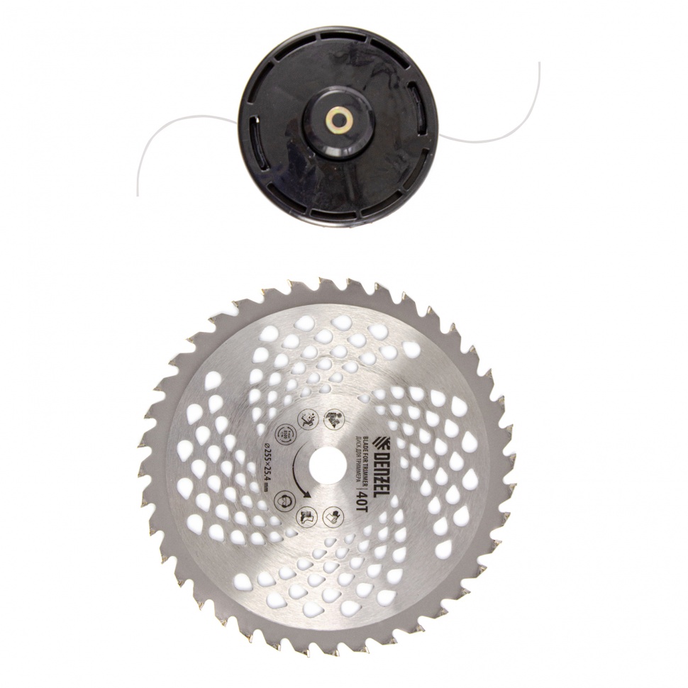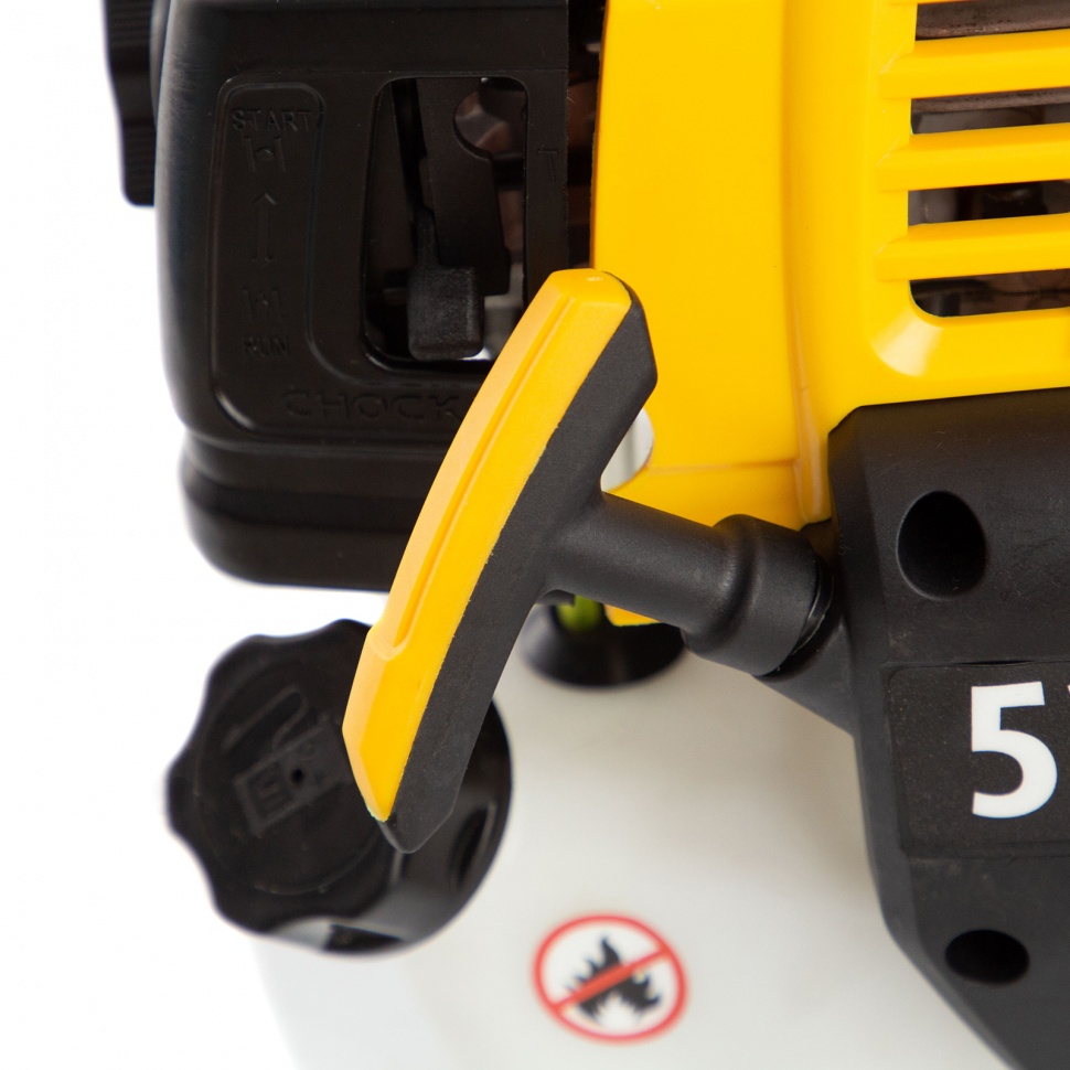 Бензиновый триммер Denzel DT-52S 96227 с двигателем мощностью 3 л.с. и объемом 52 см3, с разъемной штангой, поставляется комплектом из 2 частей и предназначен для скашивания травы всех типов, в том числе с жесткими древовидными стеблями — полыни, крапивы, лебеды, борщевика. Справляется также со срезанием кустарника и молодых побегов деревьев с диаметром стволов до 10 мм. Удобен для работы с мокрой травой и в труднодоступных местах. Ширина скашивания катушкой с леской составляет 420 мм, пильным диском — 255 мм. Испытаниями подтверждено — триммер способен работать до отказа 80 часов подряд.ПреимуществаВысокий ресурс — все детали двигателя хромированы, что значительно увеличивает его износостойкость.Быстрое обновление лески — достаточно слегка ударить катушкой о землю прямо во время работы, после чего корд вытянется, а специальный нож обрежет его до нужной длины.Легкий старт — благодаря топливному насосу двигатель быстро запускается даже после долгого простоя.Надежность — усиленный классический стартер рассчитан на длительное использование.Экономичность — полного бака объемом 0,85 л хватает почти на 45 мин. работы.Простой контроль уровня топлива — стенки бака полупрозрачные, поэтому его наполненность легко отслеживать.Удобное и простое управление — все кнопки собраны на правой рукоятке: выключатель, клавиша газа и блокиратор случайного пуска.Защита пользователя — пластиковый кожух предотвращает вылет травы, попадающих под нож камней и веток.Прочная конструкция — благодаря винтовому креплению фильтр не вываливается во время работы, стальной коннектор штанги выдерживает высокие нагрузки.Дополнительные возможности — можно приобрести и установить на триммер диски Denzel 96323, 96325 для быстрого удаления растительности с жесткими стеблями (полыни, крапивы, лебеды), 96328 для скашивания молодых побегов кустарника диаметром до 3 мм.Эргономичность — велосипедная асимметричная рукоятка с прорезиненными ручками обеспечивает оптимальное положение рук.Комфортное использование — благодаря небольшому весу триммера 7,8 кг, системе гашения вибраций, сбалансированности и удобному управлению даже длительная работа не вызывает дискомфорт.Удобное хранение и транспортировка — штанга легко разбирается на 2 части, поэтому триммер не занимает много места.Расширенная 3-летняя гарантия — высокое качество инструмента подтверждено производителем.