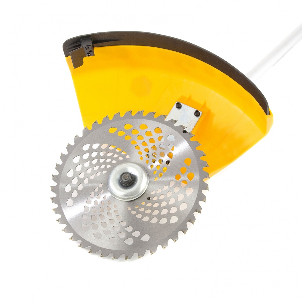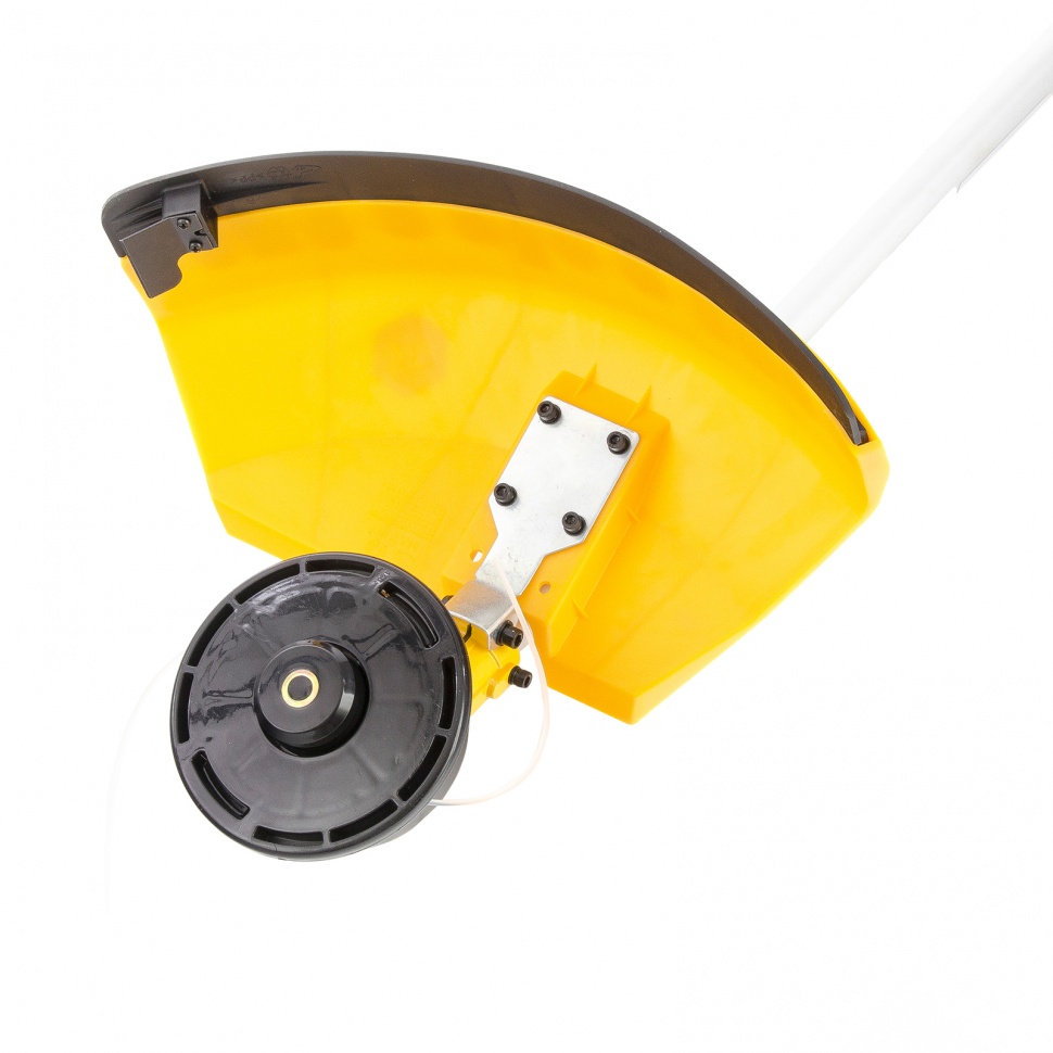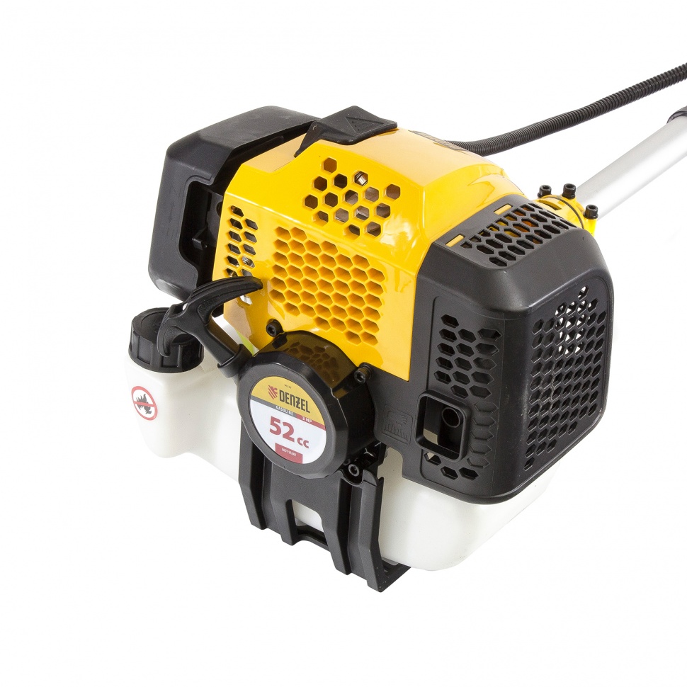 Бензиновый триммер Denzel DGT-520S 96239 с двигателем объемом 52 см3 мощностью 3 л. с., с разъемной штангой, состоит из 2 частей. Скашивает газонную траву, растительность с жесткими и древовидными стеблями (полынь, крапиву, лебеду, борщевик), подходит для срезания кустарника и молодых побегов деревьев с диаметром стволов до 10 мм. Бензиновый двигатель последнего поколения объемом 52 куб. см обеспечивает маневренность и уверенную работу даже в самых труднодоступных местах. Скорость вращения оснастки составляет 9500 об/мин. Ширина прохода диском составляет 255 см, а леской — 420 см, что позволяет обработать большой участок за короткое время.Триммер работает на смеси бензина с маслом, а потому использовать его можно вдали от дома, независимо от источников электроэнергии. В комплект поставки входит удобный дозатор для приготовления топливной смеси.ПреимуществаИзносостойкость — катушка из прочного полиамида и диск с твердосплавными напайками выдерживают высокие нагрузки и удары о препятствия.Безопасность — специальный кожух, прочно закрепленный на штанге, защищает пользователя от разлетающихся камней и веток.Легкий старт — пусковая система Easy Start упрощает включение бензинового двигателя даже после долгого перерыва.Высокий ресурс поршневой группы — покрытый пористым хромом и хонингованный цилиндр обеспечивает стабильную и долгосрочную работу двигателя.Разборная штанга — триммер удобен в хранении и транспортировке.Прочность — усиленная штанга с толщиной стенок 1,5 мм не боится ударов о препятствия.Удобное управление — асимметричная U-образная рукоятка отлично лежит в руках, а прорезиненные наконечники поглощают вибрации.Дополнительные возможности — можно приобрести и установить на триммер диск Denzel 96323 с шириной скашивания 230 мм для быстрого удаления растительности с жесткими стеблями (полыни, крапивы, лебеды) или 96328 для скашивания молодых побегов кустарника диаметром до 3 мм.Комфортная работа — плечевой ремень с защитой бедра снимает нагрузку с рук оператора, регулировка ремня по росту снимает проблему удержания триммера для высоких людей.Гарантия 3 года — высокое качество техники подтверждено производителем.
