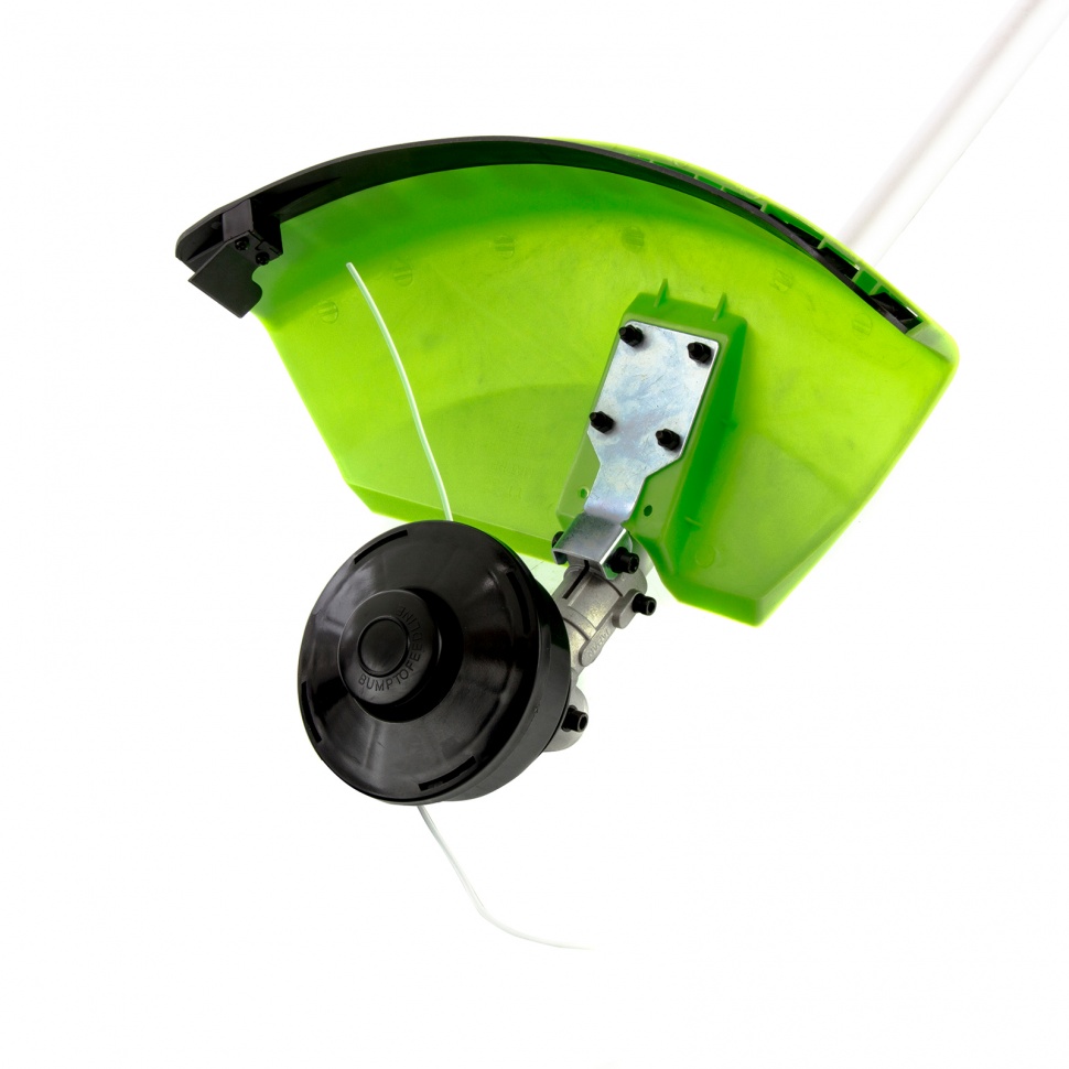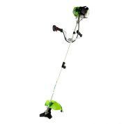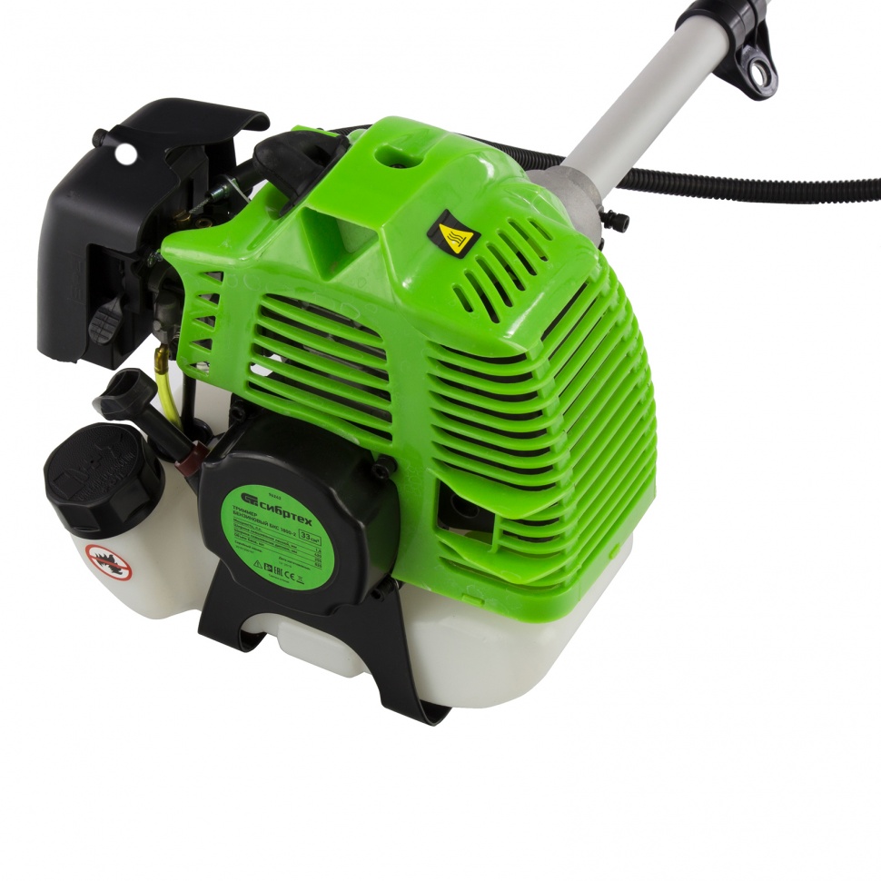Бензиновый триммер Сибртех БКС-1800-2 предназначен для подравнивания газонной травы, скашивания сорняков и небольших кустарников. Мощность двухтактного двигателя 1,8 л.с. обеспечивает высокую скорость вращения оснастки &mdash, 9500 об/мин. Триммер оснащен 2 насадками: трехлопастным ножом и катушкой с леской. Ширина скашивания ножом составляет 25,5 см, а леской &mdash, 42 см.Поскольку бензотриммер не зависит от источников электроэнергии, его можно эксплуатировать вдали от дома.Преимущества:Высокий ресурс поршневой группы обеспечивают качественные детали, т.к. цилиндр двигателя покрыт пористым хромом и хонингован.Усиленная конструкция стартера имеет высокую износоустойчивость.Кожух, закрывающий двигатель, отлит единой деталью. Он отличается повышенной прочностью и стойкостью к деформациям.Ограничительный нож на пластиковом кожухе при необходимости автоматически укорачивает леску, это это позволяет избежать перегрева и перегрузки двигателя.Защитный кожух предотвращает отскакивание от оснастки камней и веток на оператора.Эргономичная U-образная рукоятка сделана асимметричной, поэтому очень хорошо ложится в руки и обеспечивает маневренность даже на труднодоступных участках.Наплечный ремень снимает часть нагрузки с рук оператора, позволяет работать даже долгое время без усталости.Штанга сделана разъемной для легкой транспортировки и удобного хранения.Точная балансировка триммера обеспечивает возможность длительной эксплуатации без риска возникновения неисправностей.Прозрачный топливный бак помогает отслеживать уровень топлива и вовремя заправлять триммер.Топливная смесь готовится из бензина и масла, удобный дозатор входит в комплект поставки.Триммер весит всего 7.2 кг, поэтому его легко удерживать и перемещать до нужного места.Гарантийный срок составляет 12 месяцев
