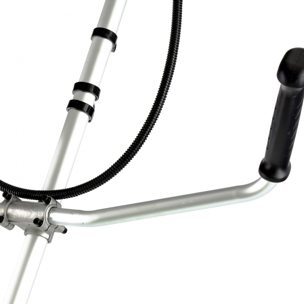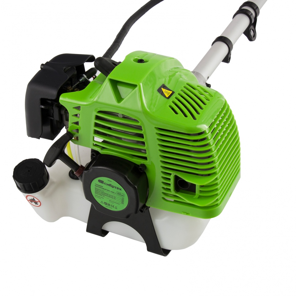 Бензиновый триммер Сибртех БКС-2500-2 96244 с разъемной штангой из 2 частей, с двигателем объемом 43 куб. см и мощностью 2,5 л. с., предназначен для бытового и сельскохозяйственного использования. С его помощью легко можно подстричь газон, избавиться от сорняков и бурьяна или заготовить сено. В комплекте леска и трехлопастный нож, поэтому триммер подходит как для ухода за дачным участком, так и для облагораживания запущенных территорий. Мощный бензиновый двигатель обеспечивает высокую скорость вращения шпинделя 9500 об/мин, что позволяет эффективно справляться даже с густыми зарослями. Ширина скашивания леской составляет 42 см, ножом — 25,5 см, что позволяет быстро обрабатывать участки большой площади. ПреимуществаДолговечность — хонингованный и хромированный цилиндр двигателя, усиленное сцепление и карбюратор высокой точности сборки обеспечивают длительную стабильную работу триммера.Безопасность пользователя — прочно закрепленный кожух надежно защищает от летящей травы и веток.Экономичность — расход топлива составляет 1,2 л/ч, а значит, полного бака объемом 0,85 л хватит на 40 минут работы.Контроль уровня топлива — бак с прозрачными стенками позволяет легко отслеживать количество топливной смеси в нем.Легкий старт — усиленный стартер и праймер (ручная подкачка топлива) обеспечивают быстрый запуск даже после долгого простоя.Быстрая подача лески — для выпуска корда достаточно слегка ударить катушкой по земле, останавливать двигатель для этого не требуется.Удобное управление — благодаря фиксатору не нужно постоянно удерживать клавишу газа, а с помощью выключателя зажигания можно быстро остановить двигатель при необходимости.Простое обслуживание — крышка воздушного фильтра с винтовым креплением легко снимается без специальных инструментов.Антивибрационная система — за счет эффективного поглощения колебаний даже длительная работа не вызывает дискомфорт.Комфортная работа — ручки велосипедного типа позволяют легко удерживать и направлять триммер, а плечевой ремень снижает нагрузку на спину.Удобная транспортировка и хранение — благодаря разборной штанге триммер не занимает много места.