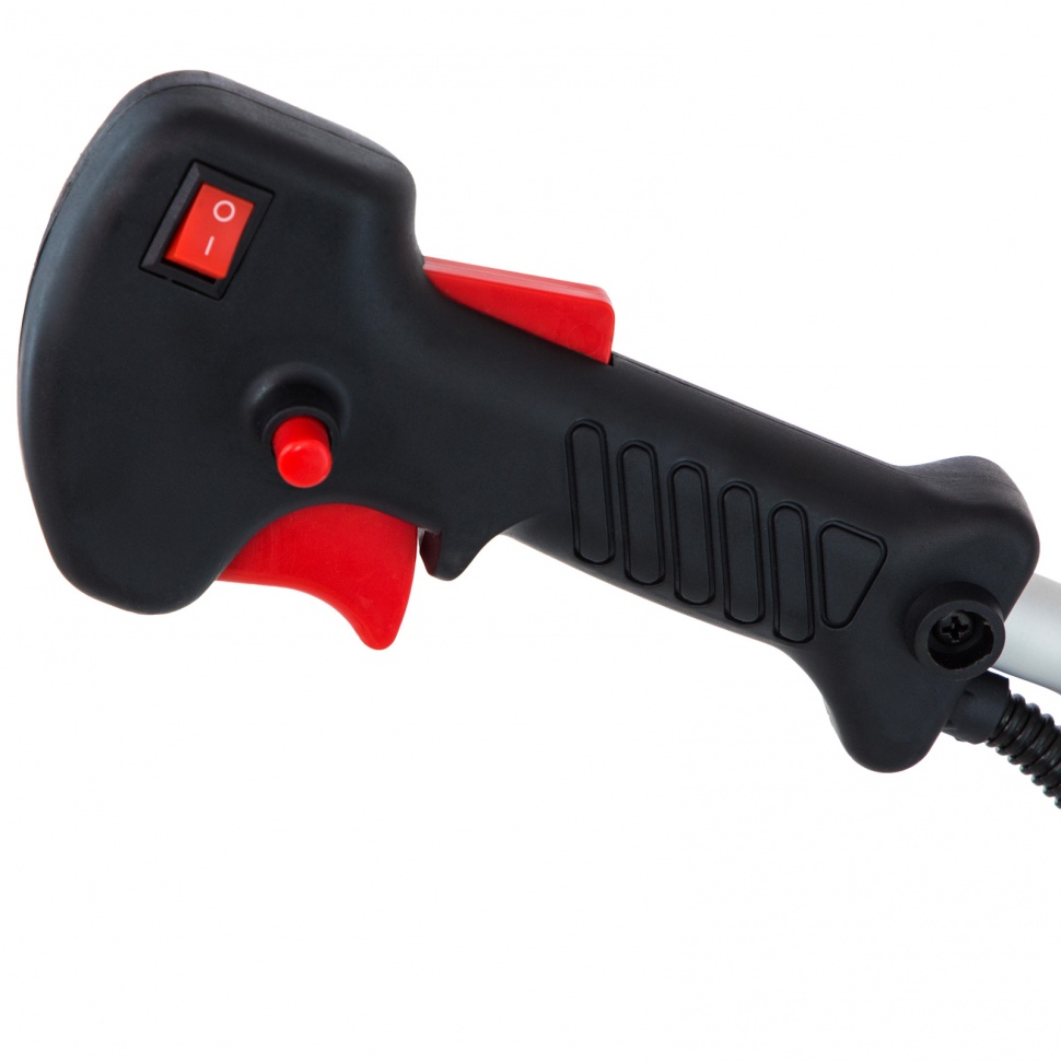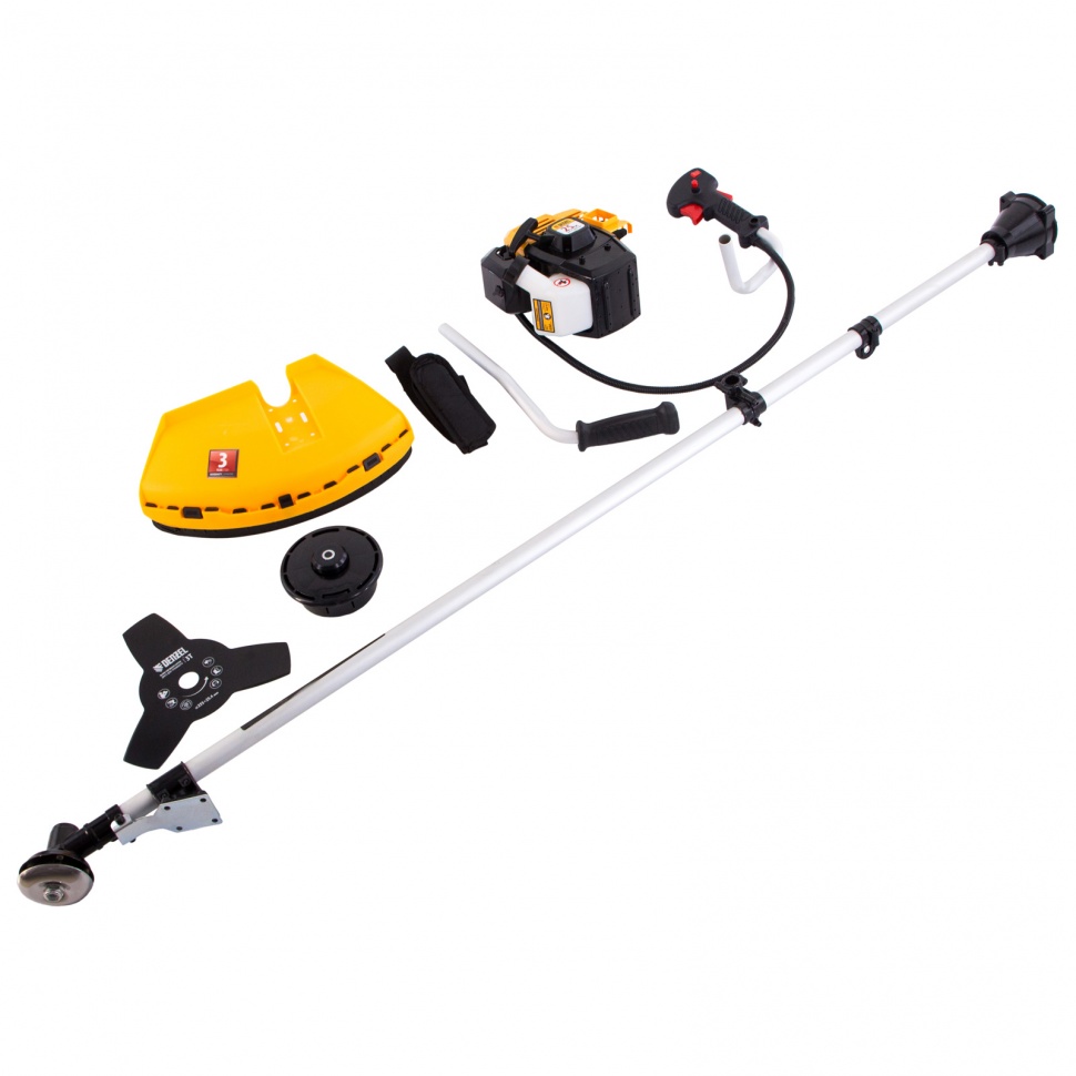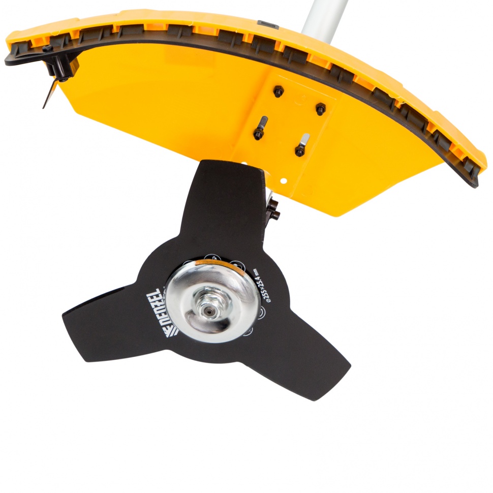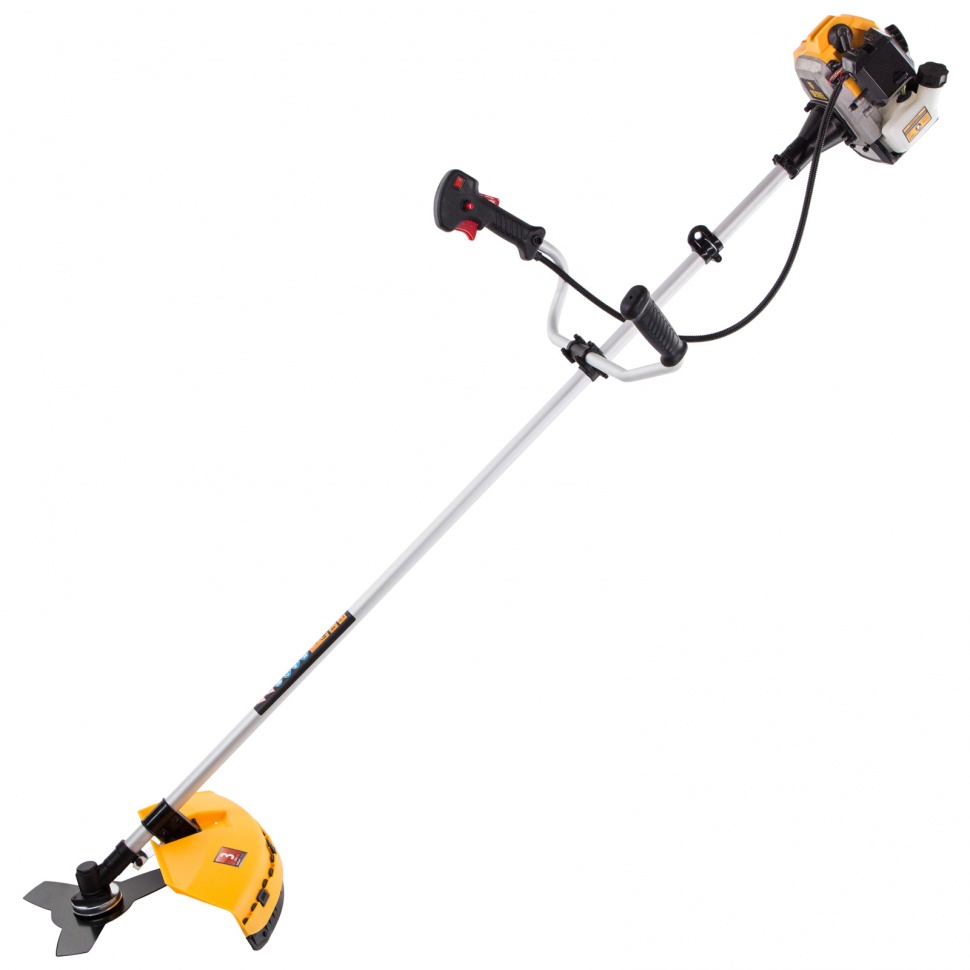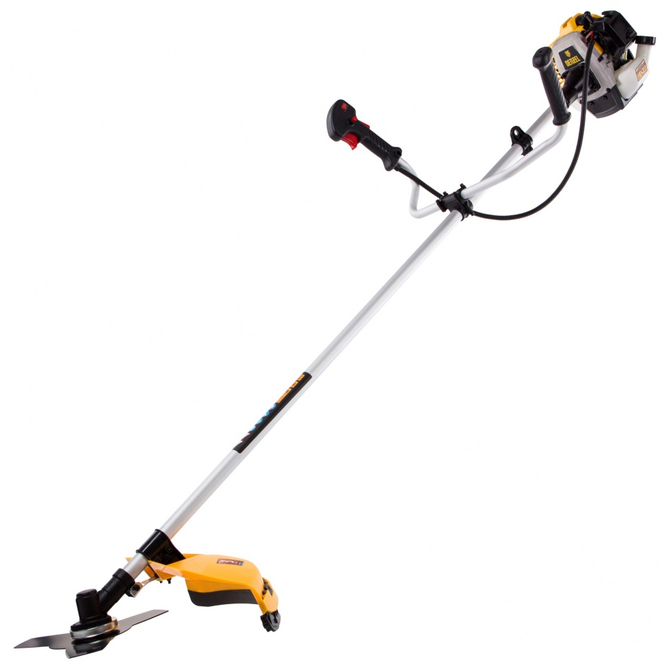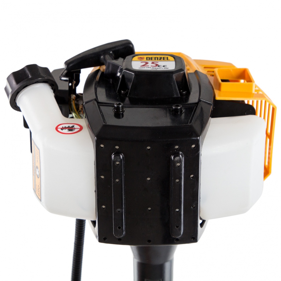 Бензиновый триммер Denzel DR-25 96270 с двигателем объемом 25 см3 и неразъемной штангой состоит из 2 частей. Срезает траву и растительность с жесткими стеблями (полынь, крапиву, лебеду) на обширной территории, включая труднодоступные места вдоль стен дома, заборов, вокруг насаждений. В качестве режущей оснастки используется стальной трехлопастный нож и усиленная катушка из полиамида с леской. Скорость их вращения составляет 9500 об/мин, а ширина скашивания — 25,5 см и 42 см. Одноцилиндровый двухтактный двигатель мощностью 1,3 л.с. работает на смеси бензина с маслом. В комплект поставки входит удобный дозатор для приготовления топлива, что облегчает обслуживание триммера. Благодаря отсутствию сетевого кабеля триммер может использоваться вдали от дома.ПреимуществаДолговечность — покрытие цилиндра пористым хромом увеличивает ресурс, чугунные колодки сцепления отличаются высокой прочностью, двигатель защищен от внешних воздействий ударопрочным корпусом.Легкий запуск — усиленный стартер и праймер позволяют быстро приступить к работе даже после длительного перерыва.Оптимизированная антивибрационная система — амортизаторы эффективно гасят колебания, защищая здоровье пользователя во время длительной работы.Безопасная работа — защитный кожух предотвращает попадание грязи, камней и скошенной травы на пользователя.Устойчивость к нагрузкам — надежный редуктор обеспечивает эффективное скашивание на высоких оборотах двигателя.Низкий расход топлива — на одной заправке можно проработать до 1 часа.Усиленная полуавтоматическая катушка — увеличить длину лески можно в процессе скашивания, достаточно слегка ударить шпулей о землю.Автоматическое подравнивание лески — лишний корд отсекается ограничительным ножом, расположенным на защитном кожухе, что позволяет избежать перегрева и перегрузки двигателя.Комфортная эксплуатация — асимметричные велосипедные рукоятки обеспечивают широкий захват, одноплечевой ремень с защитой бедра равномерно распределяет нагрузку на опорно-двигательный аппарат и предотвращает удары штанги о ногу.Небольшой вес 5,8 кг — триммер легко удерживать и направлять.Дополнительные возможности — можно приобрести диск Denzel 96323 с шириной скашивания 230 мм для быстрого удаления растительности с жесткими стеблями, 96328 для скашивания молодых побегов кустарника диаметром до 3 мм, 96340 для срезания борщевика, кустарника и молодых побегов деревьев с диаметром стволов до 10 мм.Гарантия 3 года — высокое качество техники подтверждено производителем.