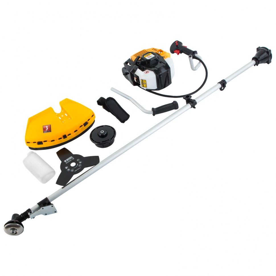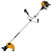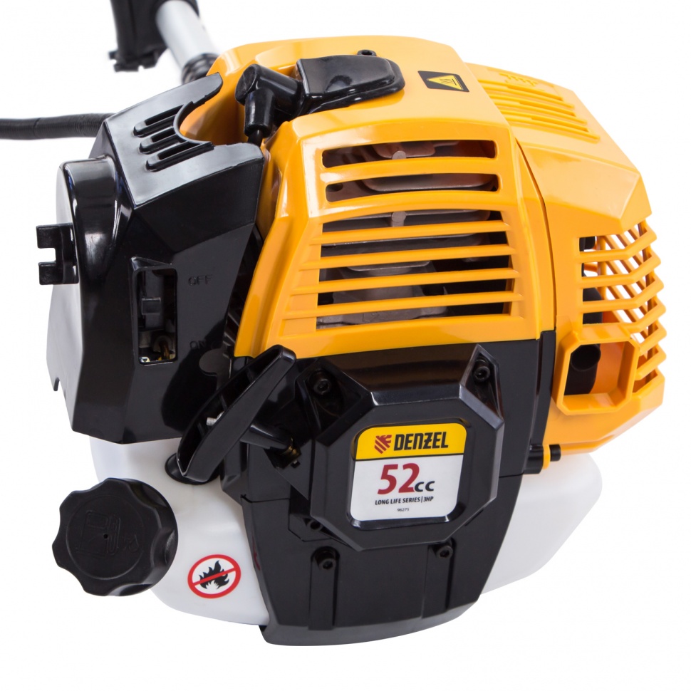 Бензиновый триммер Denzel DR-52 96275 с двигателем объемом 52 см3 и неразъемной штангой состоит из 2 частей и предназначен для ухода за газоном и формирования у него ровных границ, скашивания травы различных типов, в том числе с жесткими стеблями (полынь, крапива, лебеда). Эффективное решение этих задач обеспечивают режущие насадки — трехлопастный нож из стали и усиленная катушка из полиамида с леской. Они вращаются со скоростью 9500 об/мин, ширина скашивания составляет 25,5 и 42 см. Данная модель является самой производительной из линейки DR. Двигатель мощностью 3 л.с. обеспечивает уверенную работу даже на сложном рельефе.ПреимуществаВысокий ресурс — хонингованный, покрытый пористым хромом цилиндр обеспечивает стабильную работу поршневой группы, а надежный редуктор уверенно передает крутящий момент режущему элементу, исключая заклинивание.Легкий запуск — усиленный стартер и праймер позволяют быстро приступить к работе даже после длительного перерыва.Снижение вибраций — оптимизированная антивибрационная система поглощает колебания и обеспечивает удобную работу без вреда для здоровья.Безопасность пользователя — благодаря клавише блокировки газа триммер невозможно запустить случайно.Прочность — штанга с толщиной стенок 1,5 мм выдерживает высокие нагрузки.Защита пользователя от разлетающейся травы и камней — производитель предусмотрел надежный кожух из противоударного пластика.Экономичный расход топлива — одной заправки хватает более чем на 40 мин работы.Своевременная заправка — стенки бака прозрачные, что облегчает контроль уровня топлива.Удобное приготовление топливной смеси — специальный дозатор входит в комплект поставки.Легкое переключение между задачами — установка оснастки не занимает много времени.Полуавтоматическая подача лески — обновление лески происходит при легком ударе катушкой о землю, отключать двигатель для этого не нужно.Ограничительный нож — лишние «хвосты» лески подрезаются, чтобы они не мешали работе и не приводили к перегреву двигателя.Удобное управление — асимметричный велосипедный руль с пластиковыми рукоятками обеспечивает надежный захват и естественное положение рук.Работа без ощущения усталости — плечевой ремень равномерно распределяет нагрузку.Вес 6,9 кг — триммер легко удерживать и перемещать.Дополнительные возможности — можно приобрести диск Denzel 96323 с шириной скашивания 230 мм для быстрого удаления растительности с жесткими стеблями, 96328 для скашивания молодых побегов кустарника диаметром до 3 мм, 96340 для срезания борщевика, кустарника и молодых побегов деревьев с диаметром стволов до 10 мм.Гарантия 3 года — надежность инструмента подтверждена производителем.