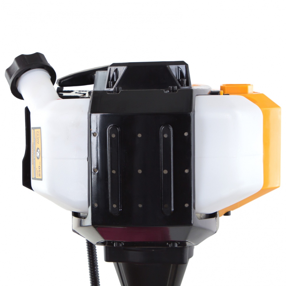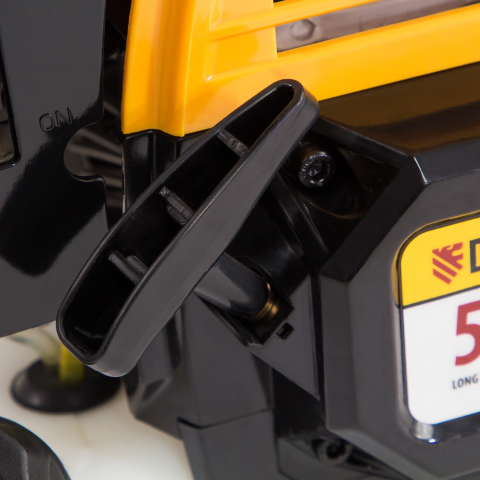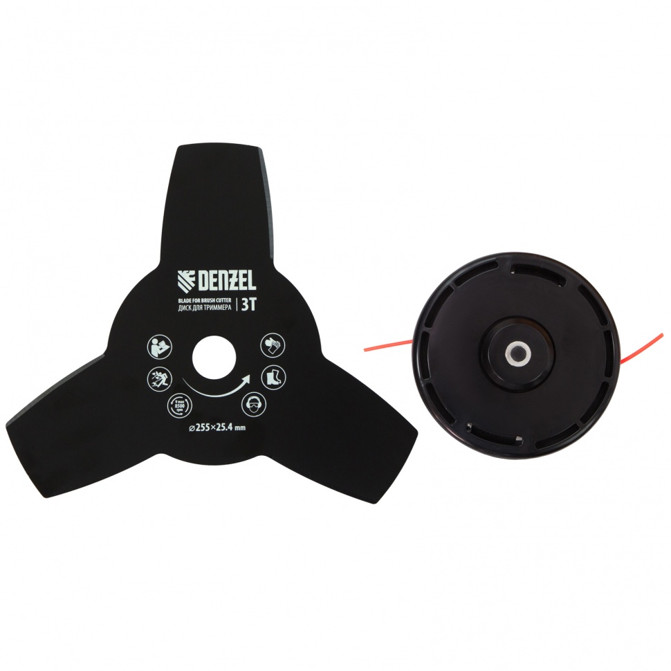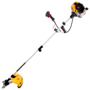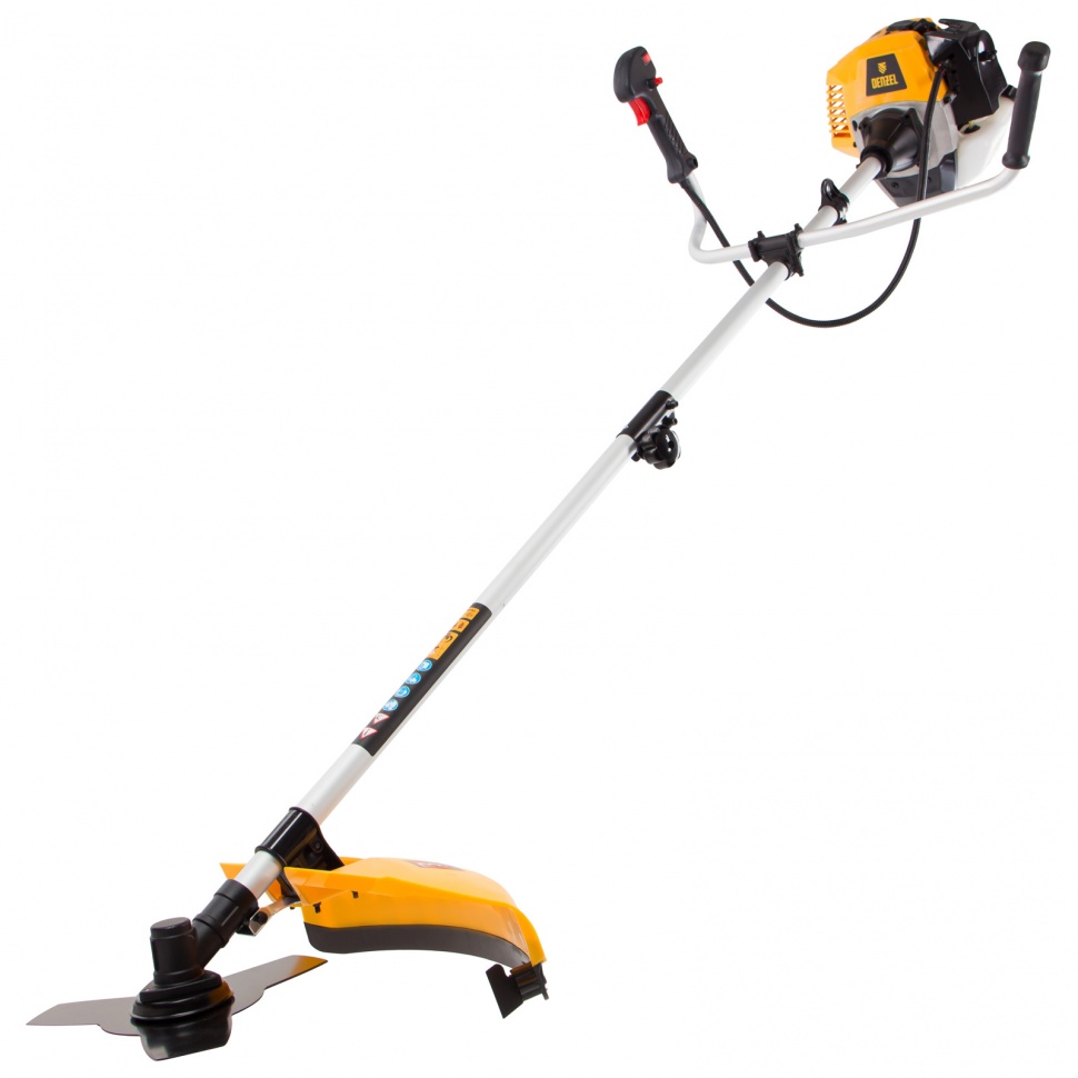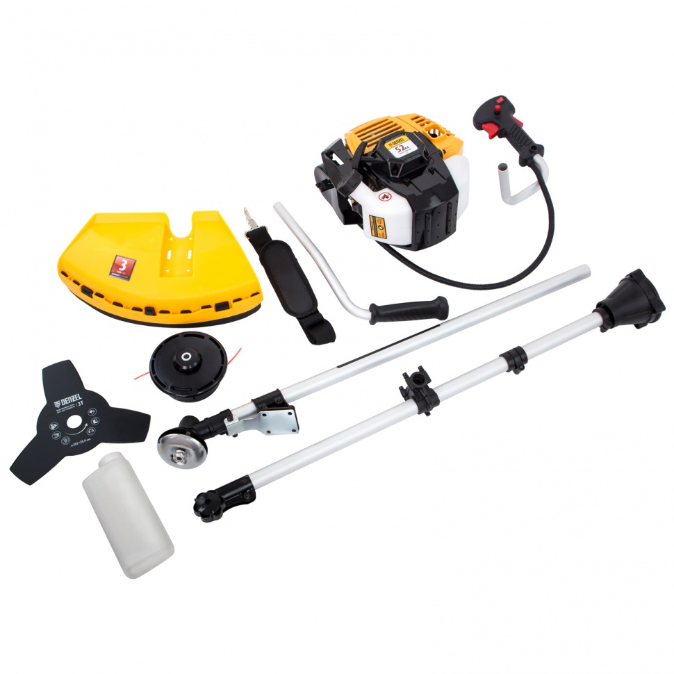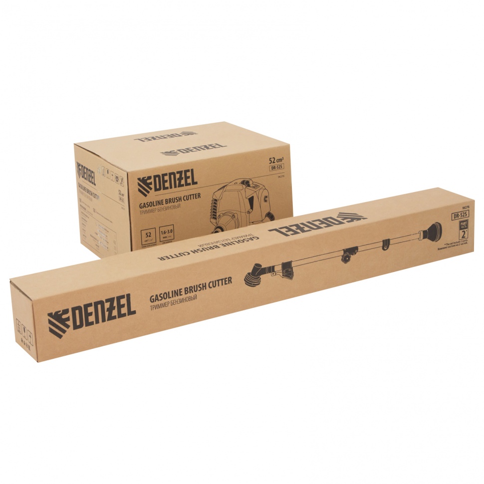 Бензиновый триммер Denzel DR-52S 96276 с двигателем объемом 52 см3 и разъемной штангой, состоит из 2 частей. Используется для ухода за газоном, скашивания травы различных типов, в том числе с жесткими стеблями (полынь, крапива, лебеда). Триммер эффективен на сложных участках: вдоль стен, в ямках и на возвышенностях, вокруг деревьев. Две режущие насадки — трехлопастный нож и катушка с леской — вращаются со скоростью 9500 об/мин, обеспечивая ширину скашивания 25,5 и 42 см. Эффективную работу инструмента обеспечивает двухтактный двигатель мощностью 3 л.с. При этом триммер экономично расходует топливо, поэтому часто заправлять его не придется.ПреимуществаВысокий ресурс — усиленный стартер изготовлен из металлических деталей, цилиндр двигателя покрыт пористым хромом и хонингован.Стабильная работа — шлицевое соединение вала с редуктором выполнено из высокопрочного металла и выдерживает значительные нагрузки.Противоударный корпус — двигатель надежно защищен от внешних воздействий и загрязнений.Прочность — толщина стенок штанги составляет 1,5 мм, поэтому триммер не боится ударных нагрузок при случайных встречах с препятствиями.Легкий запуск — стартер и праймер позволяют быстро приступить к работе даже после длительного перерыва.Оптимизированная антивибрационная система — амортизаторы предотвращают негативное воздействие колебаний на суставы и сосуды.Безопасность пользователя — блокиратор газа исключает случайный запуск триммера.Защитный кожух — трава, ветки и камни не отлетают в сторону пользователя.Контроль расхода топлива — стенки бензобака сделаны прозрачными, что позволяет вовремя производить заправку.Удобное приготовление топливной смеси — дозатор для смешивания бензина и масла входит в комплект поставки.Быстрая замена насадок — установка режущего элемента не требует усилий.Полуавтоматическая катушка — чтобы обновить леску, достаточно слегка ударить катушкой по земле, не снижая оборотов двигателя.Автоматическая подрезка лески до нужной длины — двигатель работает без перегрузки и перегрева.Удобное управление — асимметричные рукоятки обеспечивают оптимальное положение рук, благодаря весу 7 кг триммер легко удерживать и направлять.Длительная работа без ощущения усталости — плечевой ремень снижает нагрузку на руки.Разъемная штанга — триммер удобен в хранении и транспортировке.Дополнительные возможности — можно приобрести диск Denzel 96323 с шириной скашивания 230 мм для быстрого удаления растительности с жесткими стеблями, 96328 для скашивания молодых побегов кустарника диаметром до 3 мм, 96340 для срезания борщевика, кустарника и молодых побегов деревьев с диаметром стволов до 10 мм.Гарантия 3 года — надежность инструмента подтверждена производителем.