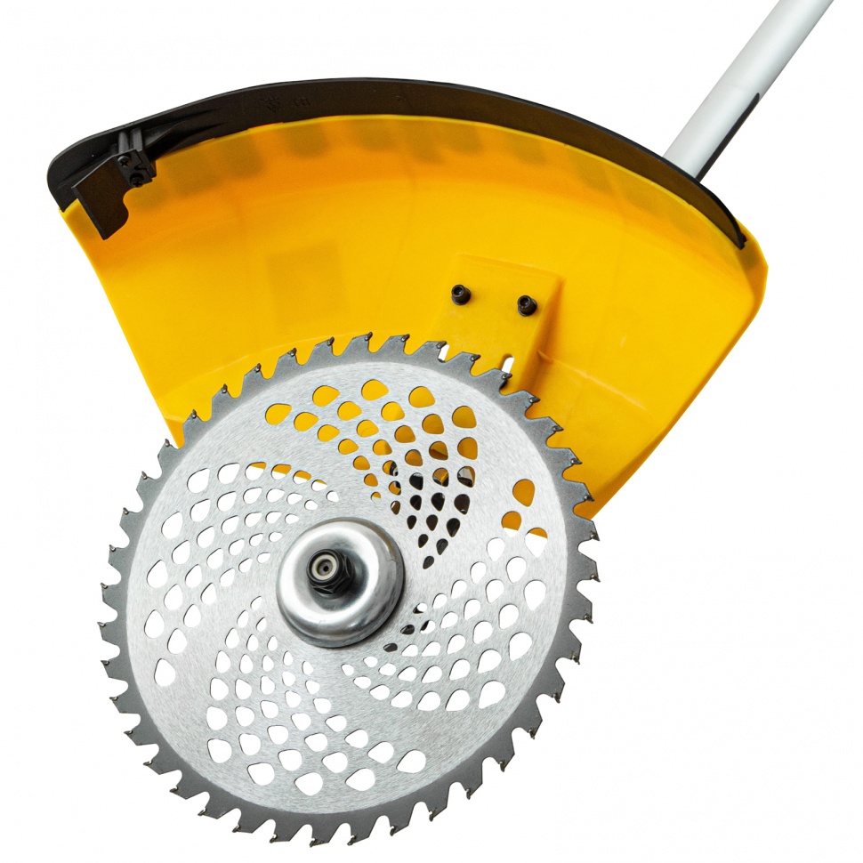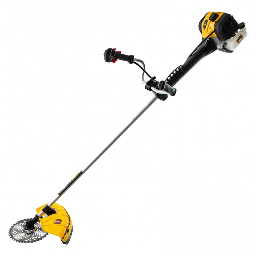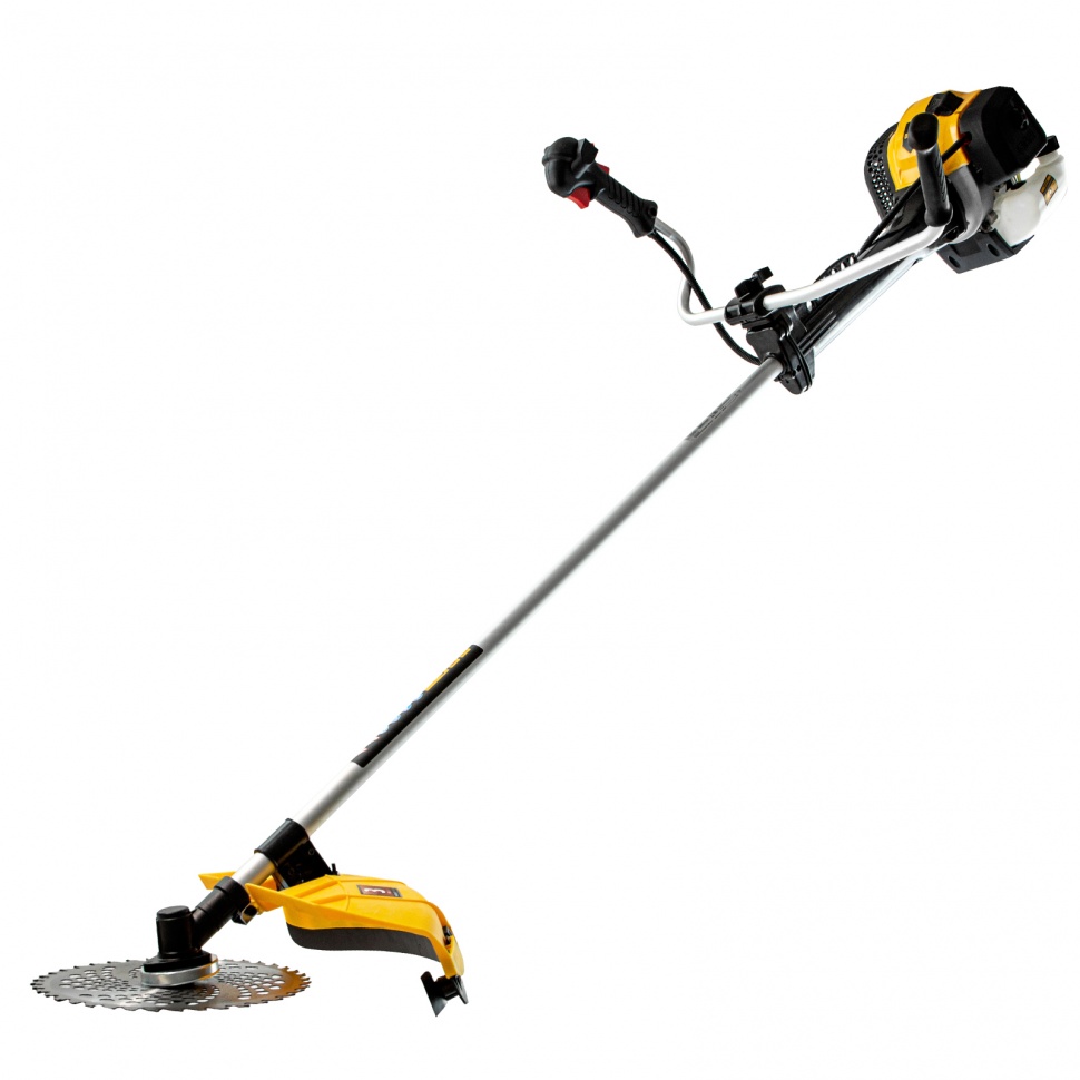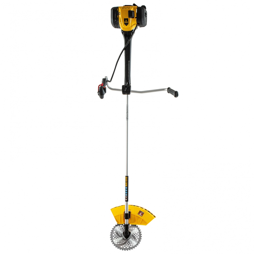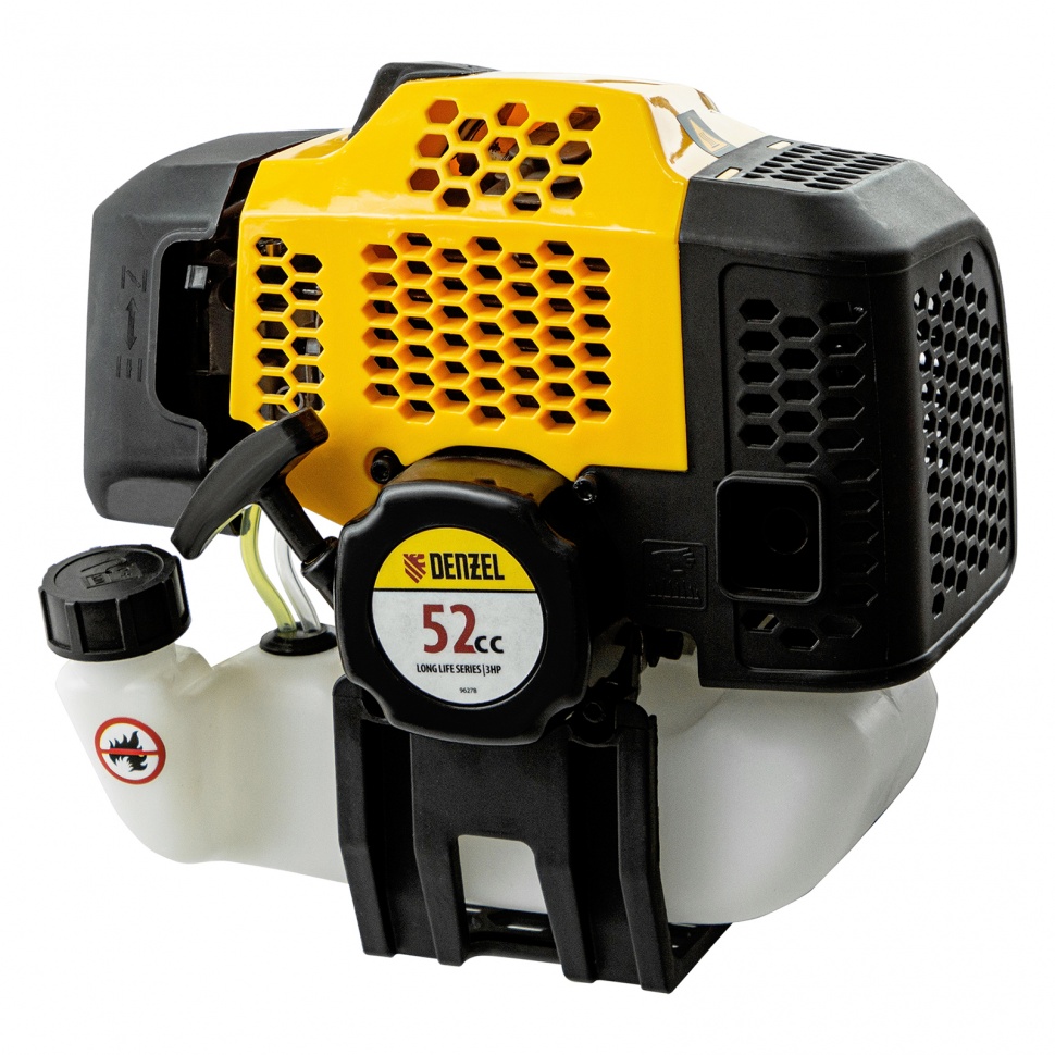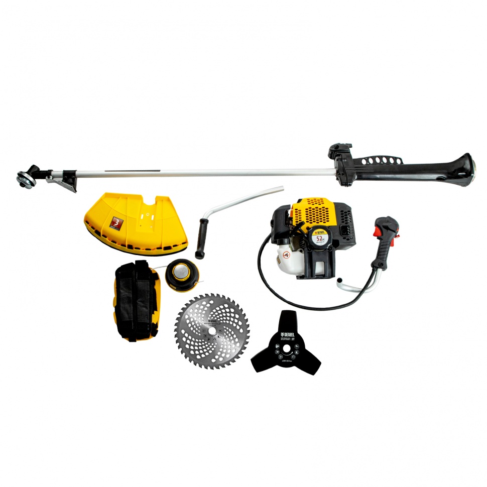 Бензиновый триммер Denzel DGT-52-PRO 96278 с системой анти-вибро и неразъемной штангой, состоит из 2 частей и оснащен мощным двигателем объемом 52 куб. см. Способен скашивать не только газонную траву, но и растительность с жесткими древовидными стеблями (полынь, крапиву, лебеду, борщевик) а также срезать кустарник и молодые побеги деревьев со стволами диаметром до 10 мм. Для этих целей предназначены полуавтоматическая катушка с леской, трехлопастный нож и пильный диск.Бензотриммер рассчитан на интенсивные нагрузки, поэтому его также можно использовать для заготовки сена в сельском хозяйстве или для ухода за придомовыми территориями в городе. Двигатель мощностью 3 л.с. и частота вращения оснастки 9500 об/мин позволяют эффективно справляться с большим объемом работ — за 1 час можно обработать участок площадью до 20 соток. Штанга неразъемная, на нее уже установлен редуктор и корпус сцепления, что упрощает финальную сборку инструмента.ПреимуществаДолговечность — хромированный цилиндр двигателя, стартер из металла и ударопрочного полиамида обеспечивают стабильную работу мотокосы.Надежная конструкция — усиленное сцепление и закаленные шлицы трансмиссионного вала уменьшают риск поломки.Экономичность — расход топлива составляет 1,2 л/ч, поэтому бензотриммер способен проработать при полной нагрузке 40 минут без дозаправки.Прочность и устойчивость к нагрузкам — штанга из алюминиевой трубы со стенками толщиной 1,5 мм не имеет уязвимых соединений.Легкий старт — система Easy Start и праймер обеспечивают быстрый запуск даже после долгого перерыва.Расширенный функционал — благодаря встроенному круиз-контролю с регулировкой оборотов легко подбирается оптимальный режим работы.Безопасность — защитный кожух из прочного пластика закрывает режущую часть, а блокиратор курка газа исключает случайный запуск двигателя.Быстрая установка и подача корда — благодаря системе Easy Load не нужно разбирать корпус катушки для заправки лески, а для ее обновления достаточно слегка ударить шпулей о землю.Удобное управление — все кнопки находятся на правой рукоятке, а клавиша выключения зажигания — под большим пальцем, поэтому можно моментально остановить работу при необходимости.Простое обслуживание — быстрый бесключевой доступ к фильтру облегчает его осмотр и замену.Виброзащита — профессиональная антивибрационная система гасит колебания, поэтому можно долго работать без усталости.Комфортная работа — двухплечевой ремень снижает нагрузку на позвоночник и плечи, а специальная пластина защищает бедро от ударов о штангу.Продуманная комплектация — к триммеру прилагается канистра для смешивания топлива и комплект ключей для сборки и обслуживания.Дополнительные возможности — можно приобрести и установить на триммер диск Denzel 96323 с шириной скашивания 230 мм для быстрого удаления растительности с жесткими стеблями, 96328 для скашивания молодых побегов кустарника диаметром до 3 мм.Гарантия 3 года — надежность бензотриммера подтверждена производителем.