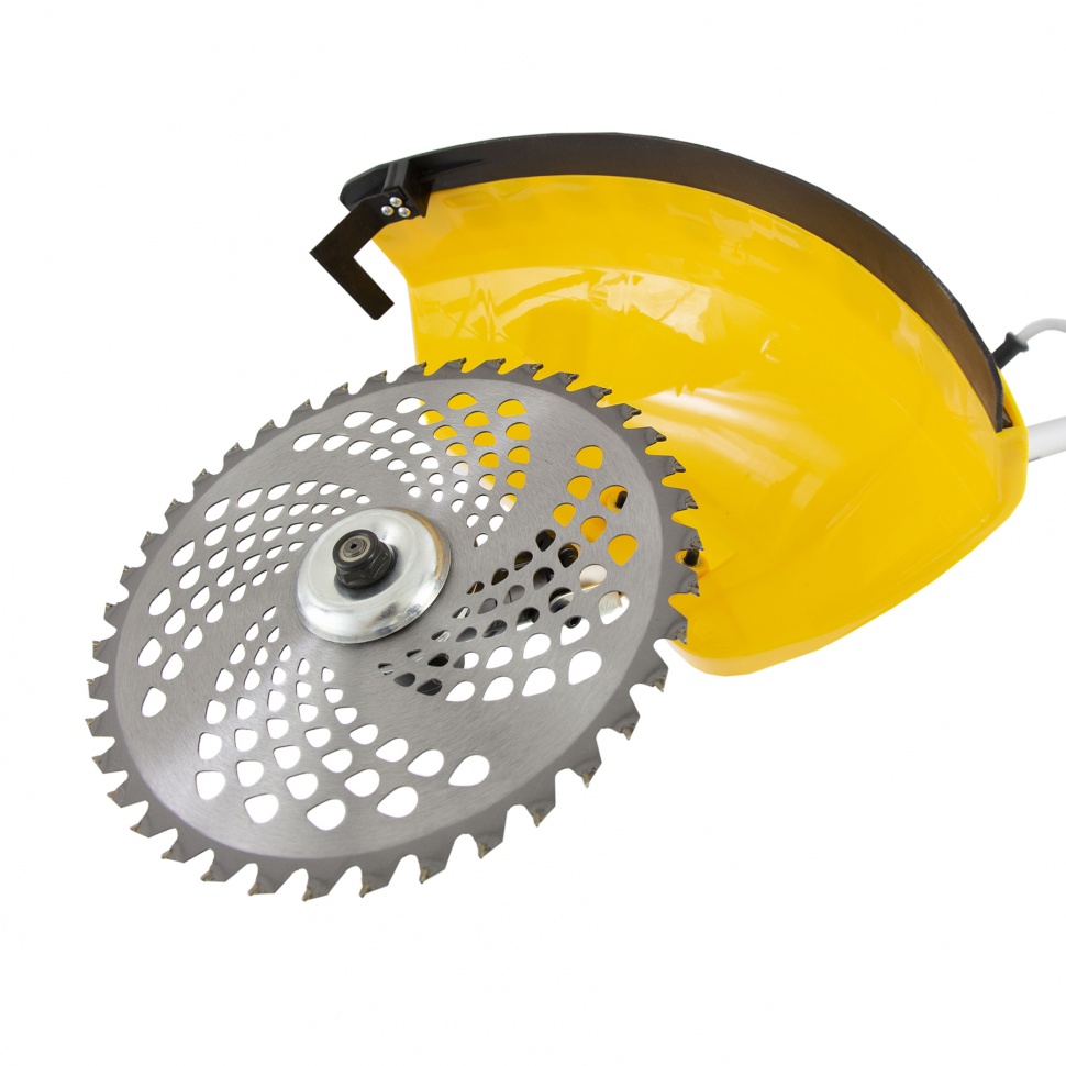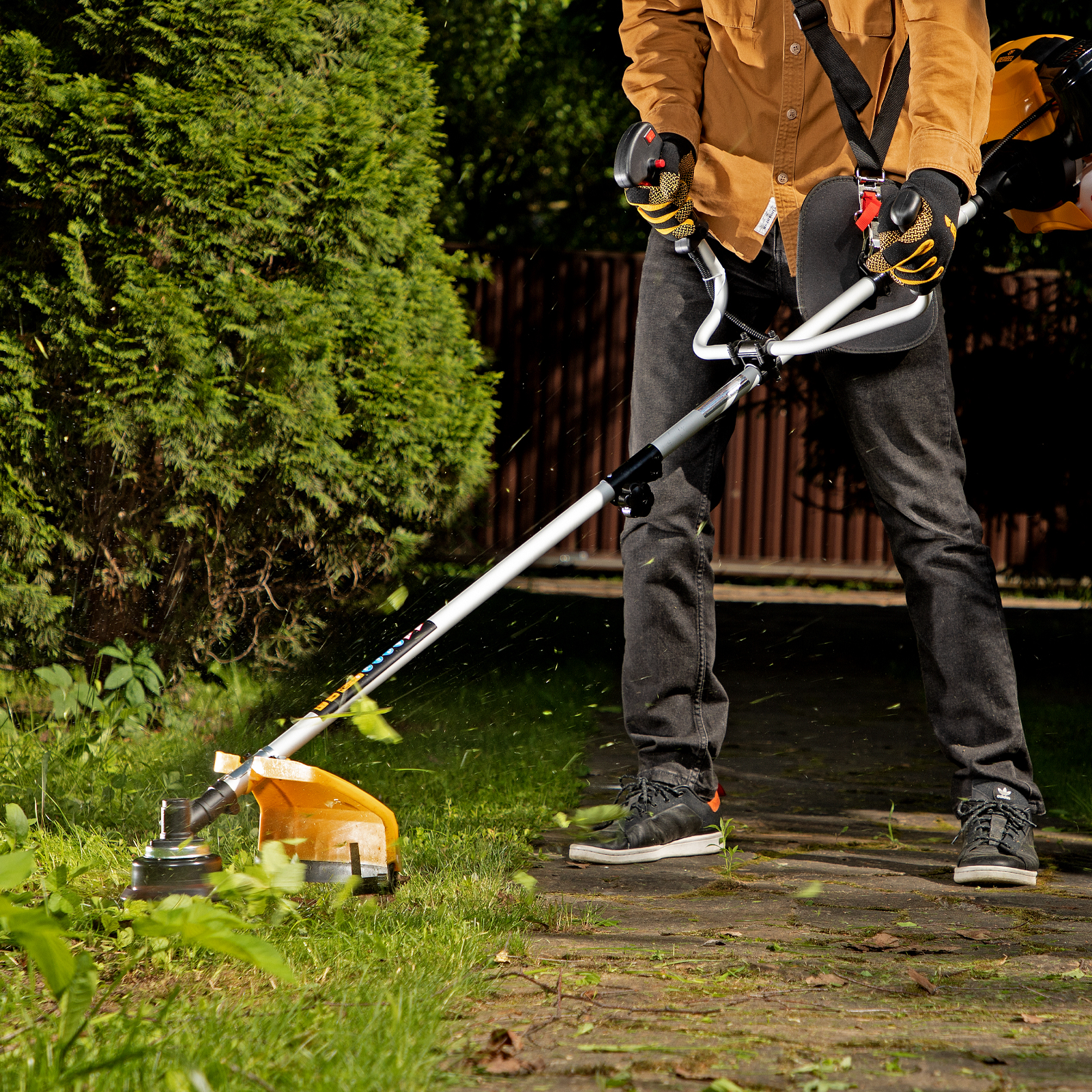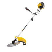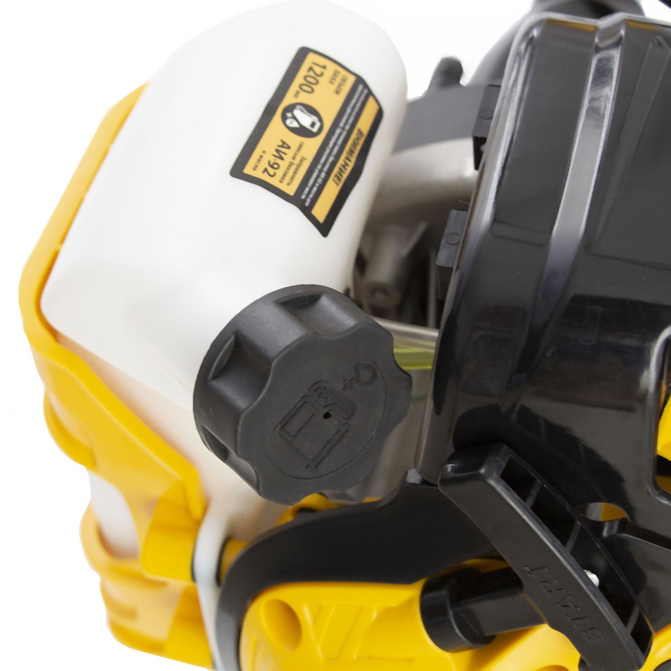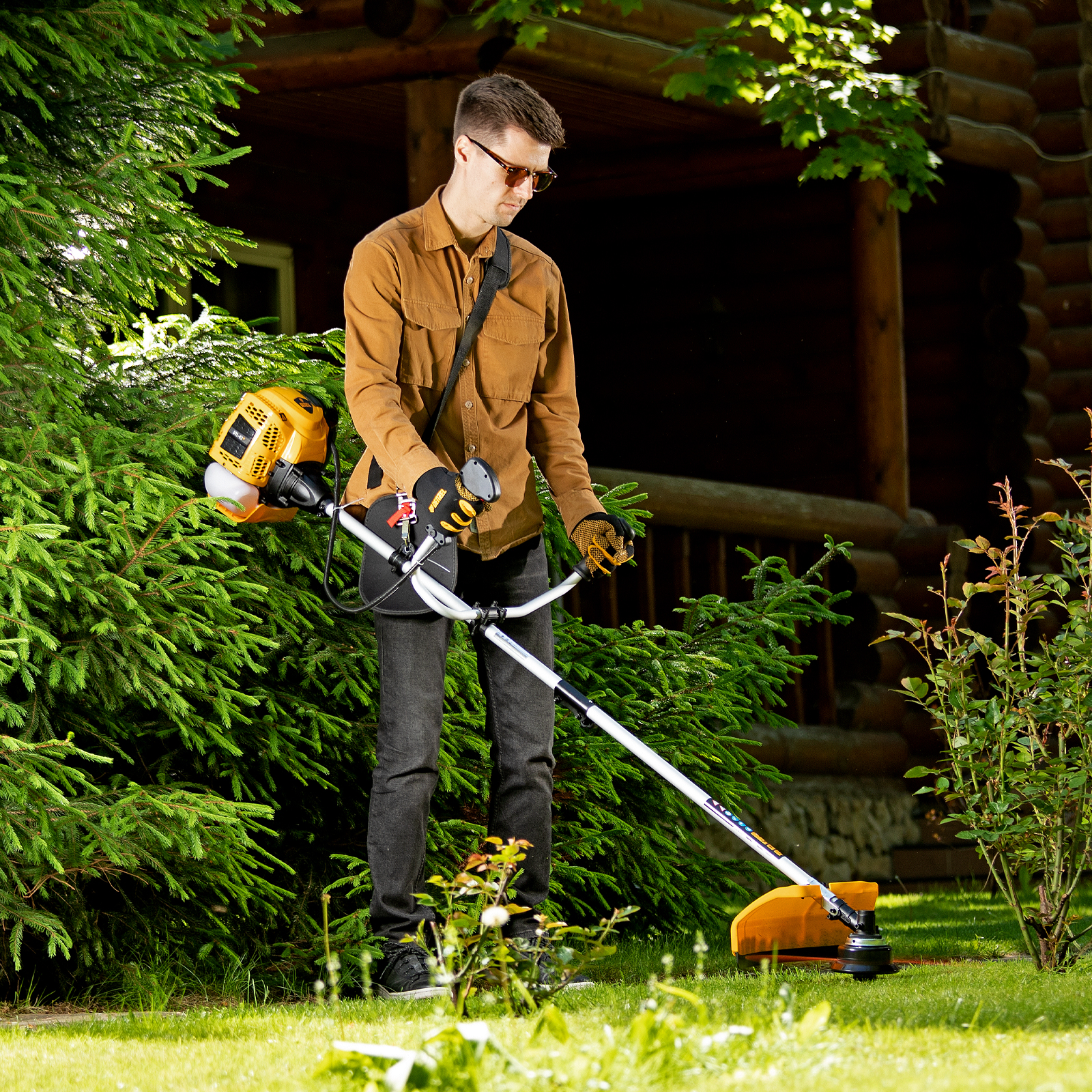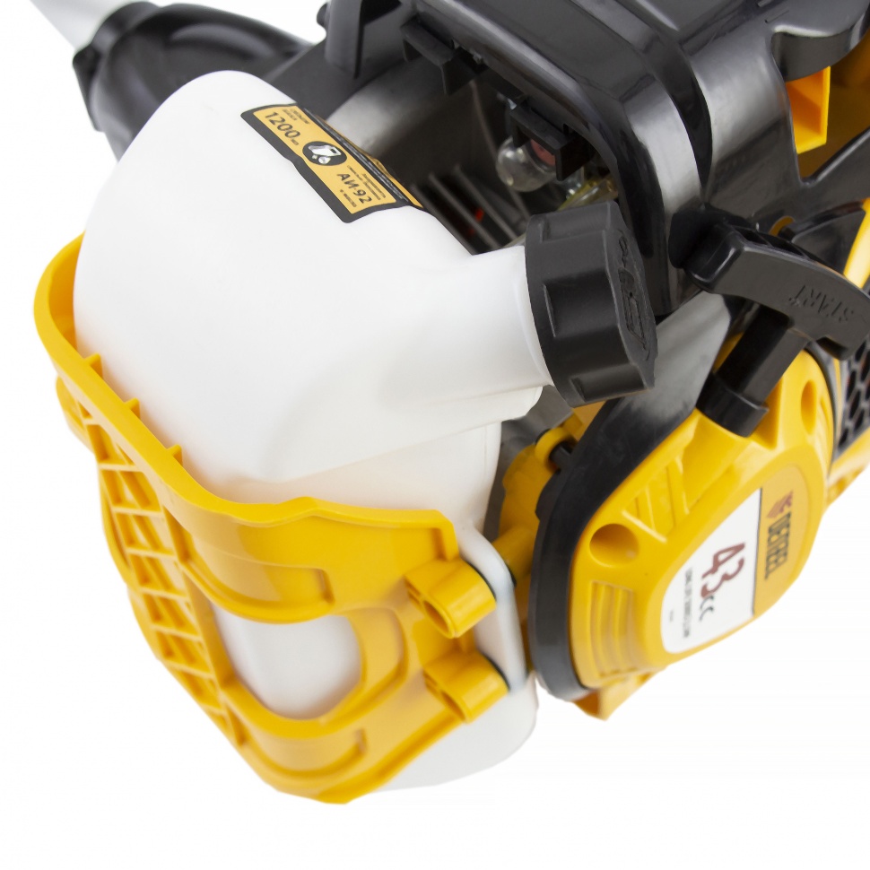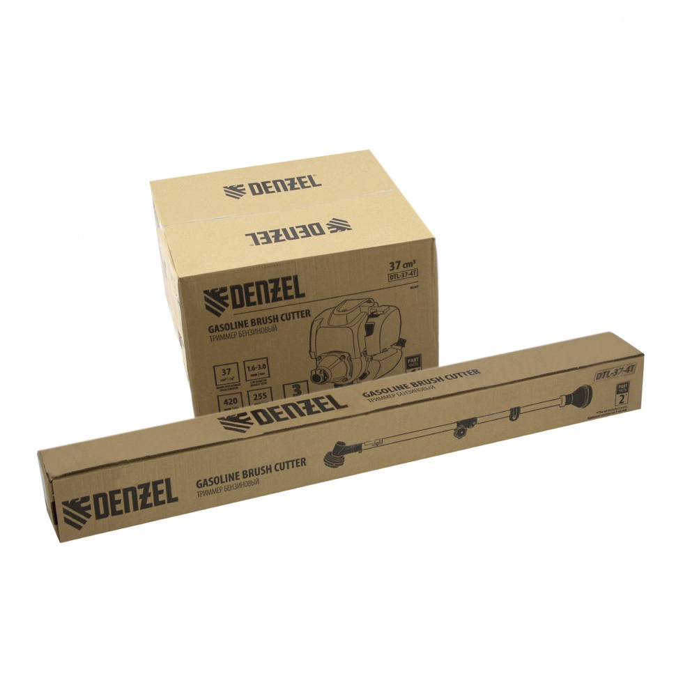 Бензиновый триммер Denzel DTL-43S 96264 с разъемной штангой, состоящей из 2 частей, оснащен 2-тактным двигателем объемом 43 см3 и предназначен для стрижки газона, скашивания травы всех типов, в том числе с жесткими древовидными стеблями (полыни, крапивы, лебеды, борщевика), а также срезания кустарника и молодых побегов деревьев с диаметром стволов до 10 мм. Усиленная катушка с леской и пильный диск, вращающиеся со скоростью 9500 об/мин, обеспечивают ширину скашивания 42 и 25,5 см. Инструмент не требует подключения к электросети, поэтому подходит для работы с влажной травой и может использоваться на отдаленных от дома участках.ПреимуществаДолговечность — хромированный цилиндр повышает ресурс двигателя в несколько раз.Экономичность — полной заправки бака хватает на 1 час работы.Удобное приготовление топливной смеси — бензин и смазочное масло смешиваются в дозаторе (входит в комплект) и заливаются в бак.Контроль уровня топлива — благодаря прозрачным стенкам топливного бака легко можно оценить степень его наполненности.Безопасность — клавиша блокировки газа предотвращает случайный запуск двигателя, прочный кожух исключает вылетание травы, веток и камней на пользователя.Быстрая подача режущей лески — длина корда увеличивается легким ударом шпули о землю прямо во время работы.Автоматическое укорачивание лески — специальный нож на защитном кожухе обрезает лишние «хвосты», предохраняя двигатель от перегрузки и перегрева.Легкая установка оснастки — триммер удобен для обработки участков с разным типом растительности.Виброзащита — оптимизированная антивибрационная система гасит колебания, поэтому даже длительная работа не вредит здоровью.Эргономичность — велосипедная рукоятка имеет асимметричную форму, поэтому триммер удобно удерживать и направлять.Комфортная работа — плечевой ремень с защитой бедра снижает нагрузку на руки и предохраняет от ударов ногу, с которой соприкасается штанга.Мобильность — небольшой вес 7,8 кг и качественная балансировка позволяют легко перемещать триммер и маневрировать даже на сложных участках.Удобное хранение и транспортировка — благодаря разборной штанге триммер не занимает много места.Дополнительные возможности — можно приобрести и установить на триммер диски Denzel 96323, 96325 для быстрого удаления растительности с жесткими стеблями (полыни, крапивы, лебеды), 96328 для скашивания молодых побегов кустарника диаметром до 3 мм.Гарантия 3 года — высокое качество техники подтверждено производителем.