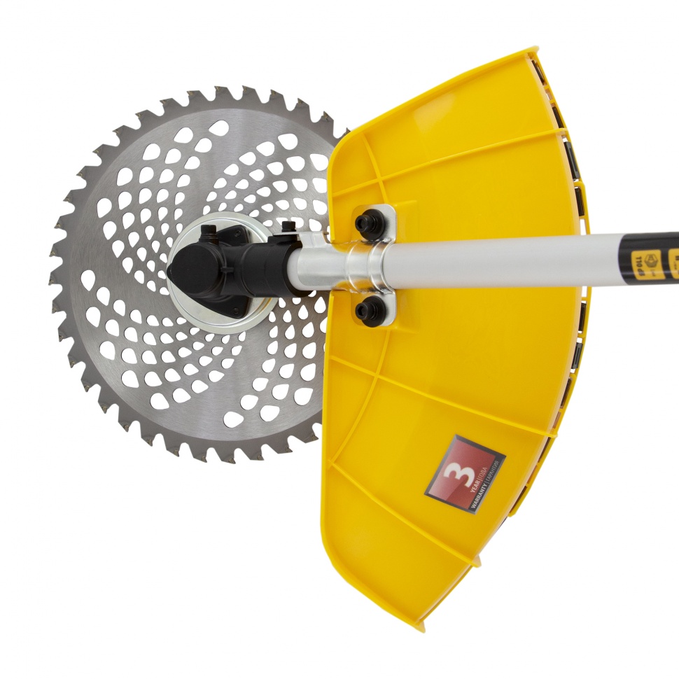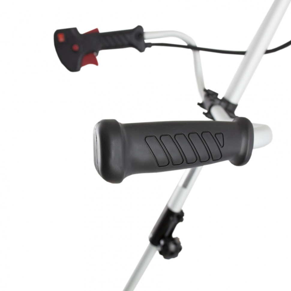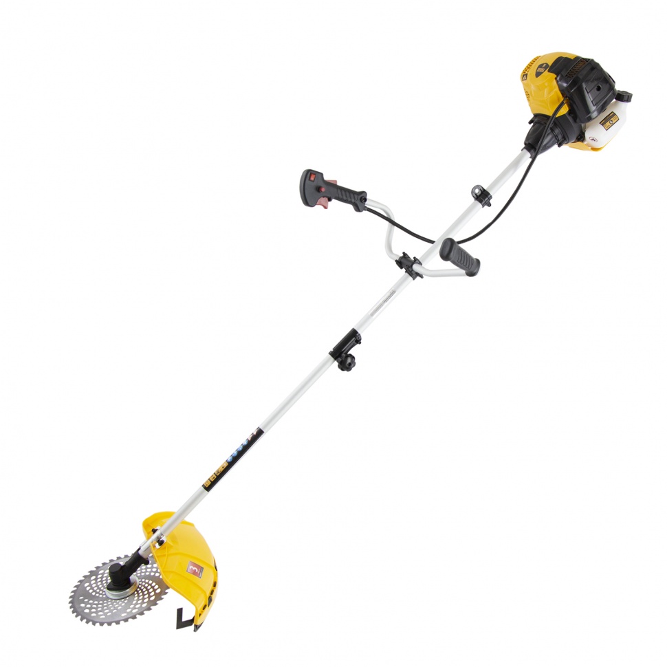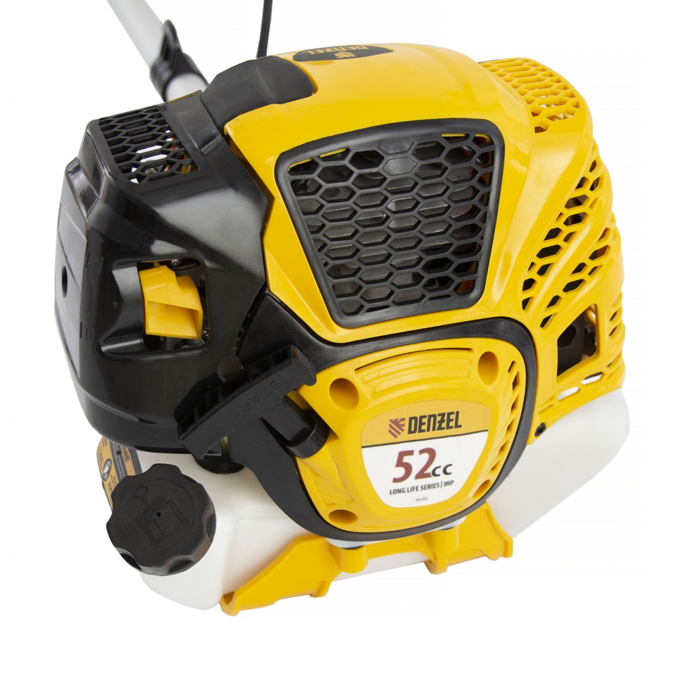 Бензиновый триммер Denzel DTL-52S 96266 с разъемной штангой, состоящей из 2 частей, оснащен 2-тактным двигателем объемом 52 см3 и предназначен для стрижки газона, скашивания травы всех типов, в том числе с жесткими древовидными стеблями (полыни, крапивы, лебеды, борщевика), а также срезания кустарника и молодых побегов деревьев с диаметром стволов до 10 мм. Усиленная катушка с леской и пильный диск обеспечивают ширину скашивания 42 и 25,5 см. Инструмент не требует подключения к электросети, поэтому подходит для работы с влажной травой и может использоваться на отдаленных от дома участках.ПреимуществаДолговечность — хромированный цилиндр повышает ресурс двигателя в несколько раз.Экономичность — полной заправки бака хватает на 1 час работы.Удобное приготовление топливной смеси — бензин и смазочное масло смешиваются в дозаторе (входит в комплект) и заливаются в бак.Контроль уровня топлива — благодаря прозрачным стенкам топливного бака легко можно оценить степень его наполненности.Безопасность — клавиша блокировки газа предотвращает случайный запуск двигателя, прочный кожух предотвращает вылетание травы, веток и камней на пользователя.Быстрая подача режущей лески — длина корда увеличивается легким ударом шпули о землю прямо во время работы.Автоматическое укорачивание лески — специальный нож на защитном кожухе обрезает лишние «хвосты», предохраняя двигатель от перегрузки и перегрева.Легкая установка оснастки — триммер удобен для обработки участков с разным типом растительности.Виброзащита — оптимизированная антивибрационная система гасит колебания, поэтому даже длительная работа не вредит здоровью.Эргономичность — велосипедная рукоятка имеет асимметричную форму, поэтому триммер удобно удерживать и направлять.Комфортная работа — плечевой ремень с защитой бедра снижает нагрузку на руки и предохраняет от ударов ногу, с которой соприкасается штанга.Мобильность — небольшой вес 7,8 кг и качественная балансировка позволяют легко перемещать триммер и маневрировать даже на сложных участках.Удобное хранение и транспортировка — благодаря разборной штанге триммер не занимает много места.Дополнительные возможности — можно приобрести и установить на триммер диски Denzel 96323, 96325 для быстрого удаления растительности с жесткими стеблями (полыни, крапивы, лебеды), 96328 для скашивания молодых побегов кустарника диаметром до 3 мм.Гарантия 3 года — высокое качество техники подтверждено производителем.