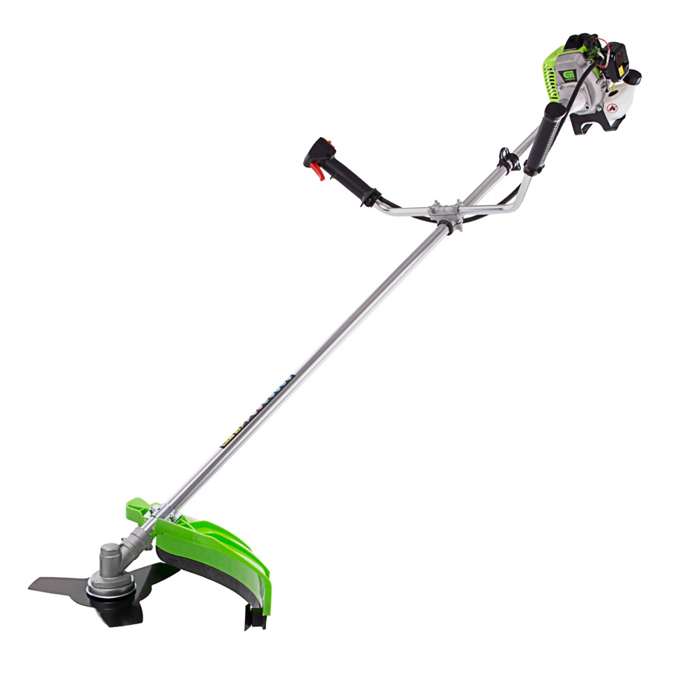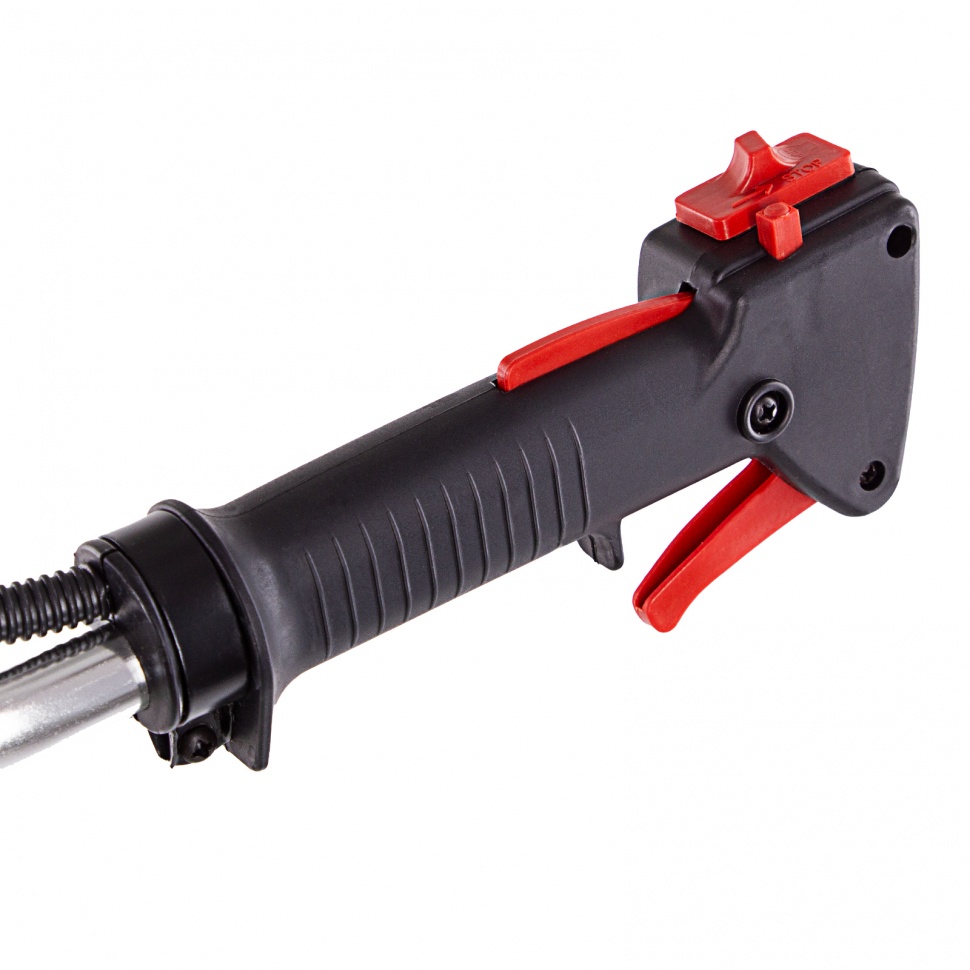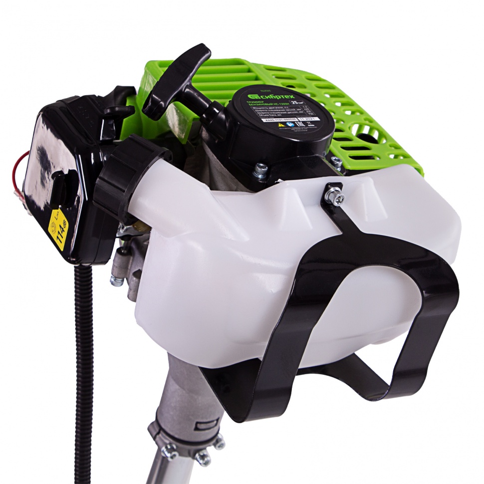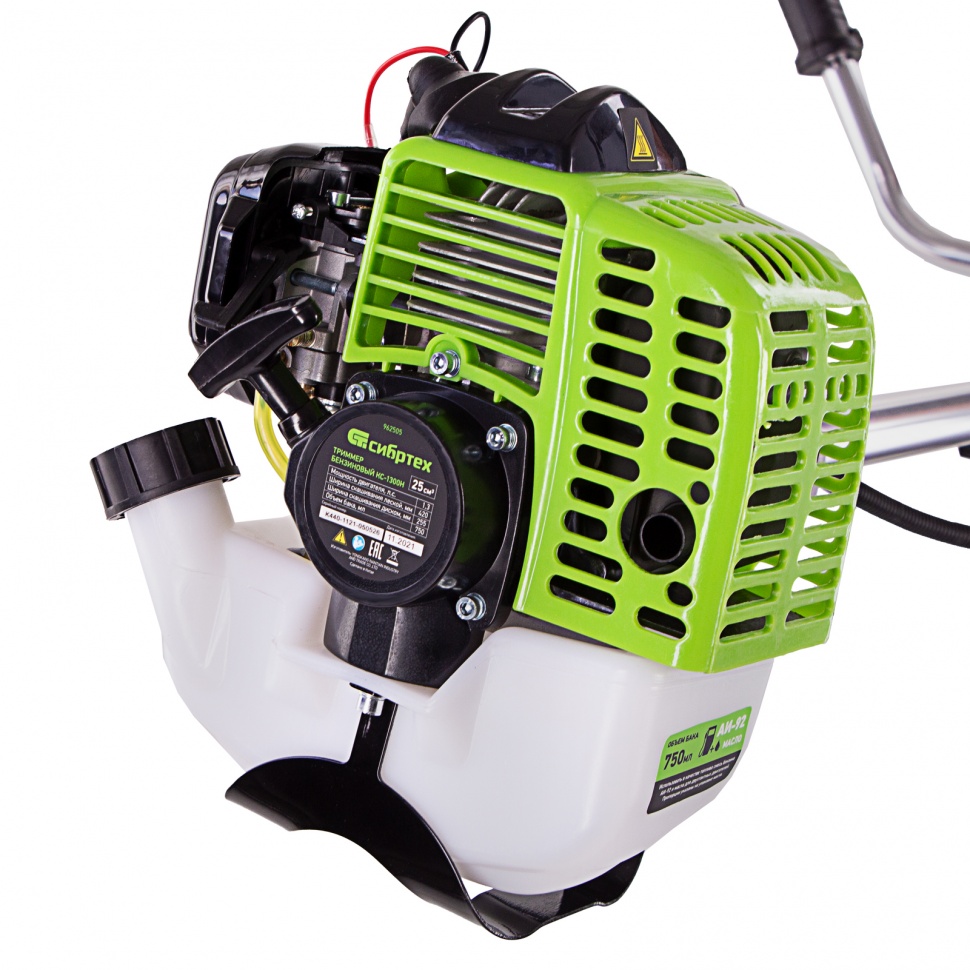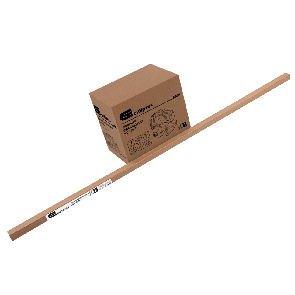 Бензиновый триммер Сибртех КС-1300Н 962505 с неразъемной штангой имеет двигатель объемом 25 куб. см, поставляется 2 частями и предназначен для ухода за дачным участком. Используется для стрижки и скашивания травы, обработки границ газонов и борьбы с сорняками. Для эффективного решения этих задач предусмотрены катушка с леской и трехлопастный нож, легко срезающий густую траву и толстые стебли. Ширина скашивания леской составляет 42 см, ножом — 25,5 см, что в сочетании с мощностью двигателя 1,3 л. с. обеспечивает высокую производительность триммера.ПреимуществаРедуктор рассчитан на высокие нагрузки, поэтому бензотриммер прослужит долго.Корпус двигателя изготовлен из ударопрочного пластика, устойчивого к механическим повреждениям.Блокиратор курка газа предотвращает случайный запуск триммера, обеспечивая безопасность пользователя.Прочный пластиковый кожух препятствует вылету травы, веток и мелких камней.Благодаря праймеру подкачки топлива двигатель легко запустится даже после долгого простоя.Полного бака хватает на 45 минут работы, а значит, часто доливать топливо не требуется.В комплекте имеется дозатор, поэтому не нужно искать емкость для приготовления топливной смеси.Благодаря полуавтоматической системе подачи можно обновить леску прямо во время работы, слегка ударив катушкой о землю.Специальный нож на кожухе обрезает леску до нужной длины, предотвращая излишнюю нагрузку на двигатель.Конструкцией предусмотрена улучшенная антивибрационная система, позволяющая долгое время работать без усталости.Ручки велосипедного типа обеспечивают оптимальное положение рук, поэтому мотокосу удобно удерживать и направлять.Плечевой ремень равномерно распределяет вес инструмента, что позволяет снизить нагрузку на спину.