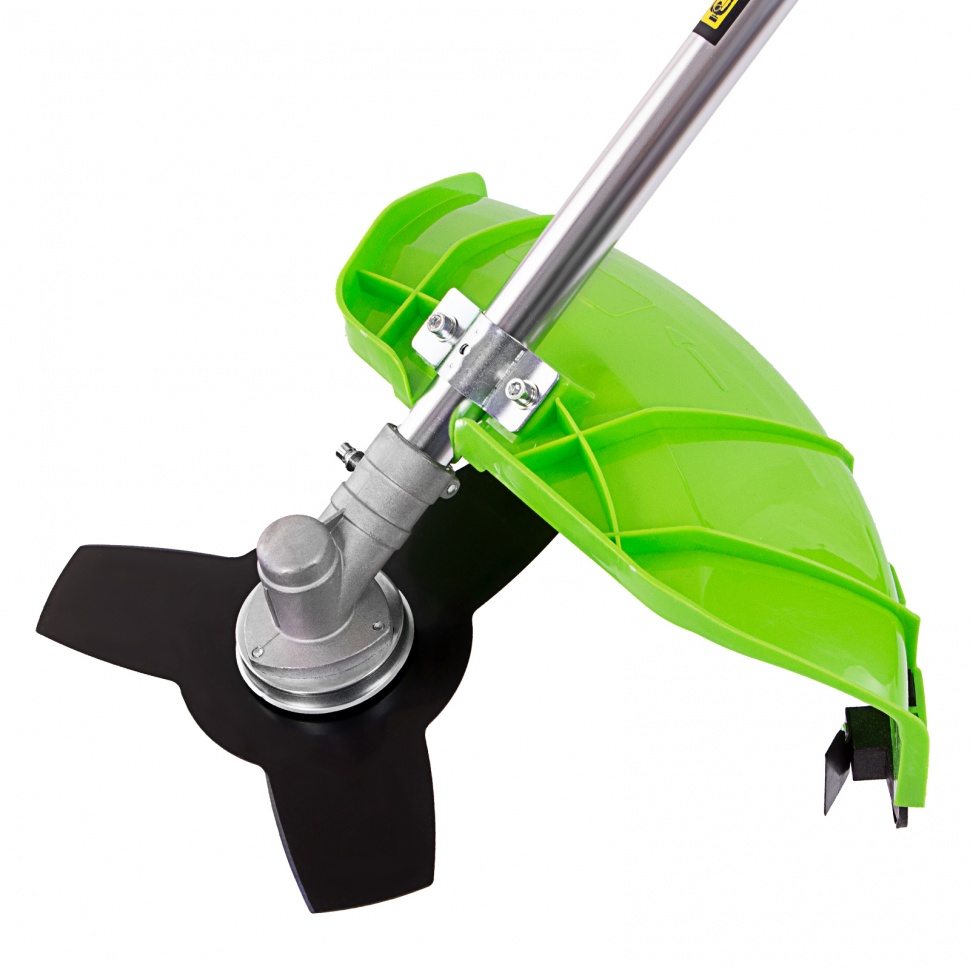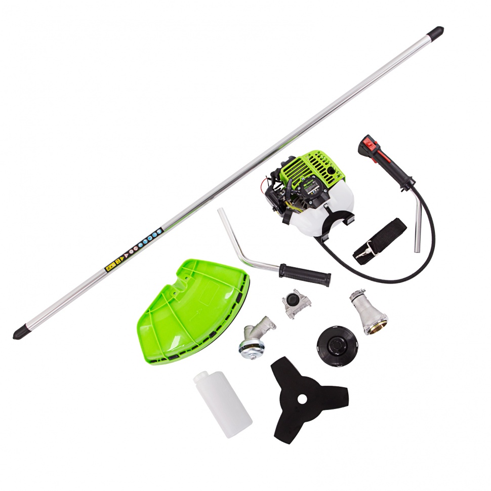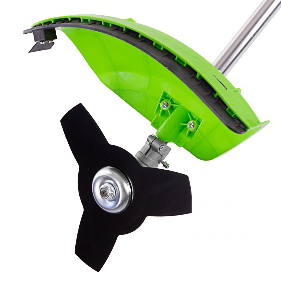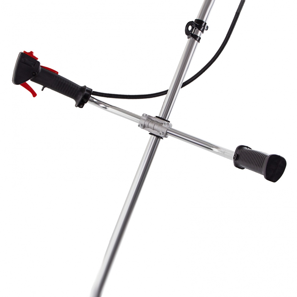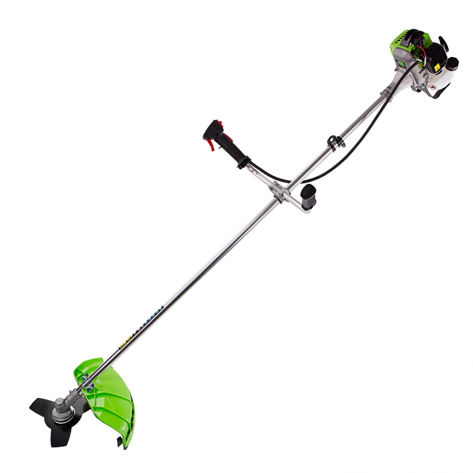 Бензиновый триммер Сибртех КС-1300Н 962505 с неразъемной штангой имеет двигатель объемом 25 куб. см, поставляется 2 частями и предназначен для ухода за дачным участком. Используется для стрижки и скашивания травы, обработки границ газонов и борьбы с сорняками. Для эффективного решения этих задач предусмотрены катушка с леской и трехлопастный нож, легко срезающий густую траву и толстые стебли. Ширина скашивания леской составляет 42 см, ножом — 25,5 см, что в сочетании с мощностью двигателя 1,3 л. с. обеспечивает высокую производительность триммера.ПреимуществаРедуктор рассчитан на высокие нагрузки, поэтому бензотриммер прослужит долго.Корпус двигателя изготовлен из ударопрочного пластика, устойчивого к механическим повреждениям.Блокиратор курка газа предотвращает случайный запуск триммера, обеспечивая безопасность пользователя.Прочный пластиковый кожух препятствует вылету травы, веток и мелких камней.Благодаря праймеру подкачки топлива двигатель легко запустится даже после долгого простоя.Полного бака хватает на 45 минут работы, а значит, часто доливать топливо не требуется.В комплекте имеется дозатор, поэтому не нужно искать емкость для приготовления топливной смеси.Благодаря полуавтоматической системе подачи можно обновить леску прямо во время работы, слегка ударив катушкой о землю.Специальный нож на кожухе обрезает леску до нужной длины, предотвращая излишнюю нагрузку на двигатель.Конструкцией предусмотрена улучшенная антивибрационная система, позволяющая долгое время работать без усталости.Ручки велосипедного типа обеспечивают оптимальное положение рук, поэтому мотокосу удобно удерживать и направлять.Плечевой ремень равномерно распределяет вес инструмента, что позволяет снизить нагрузку на спину.