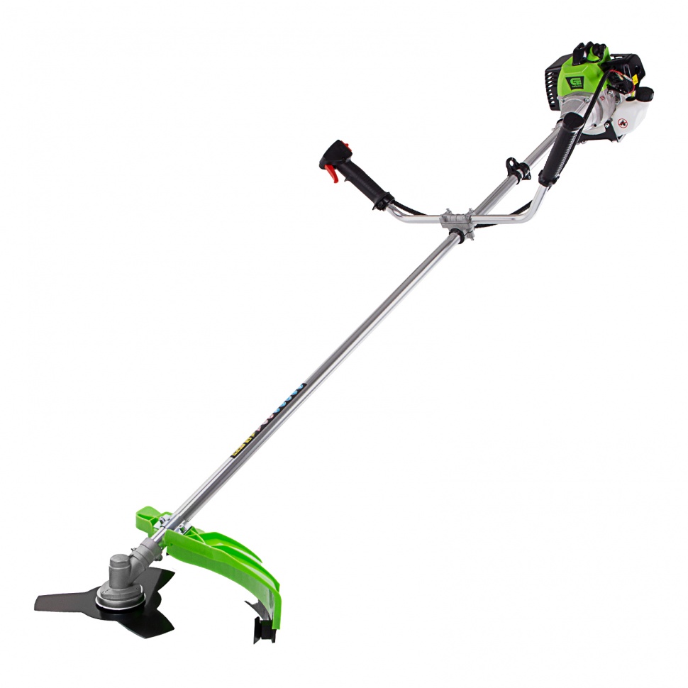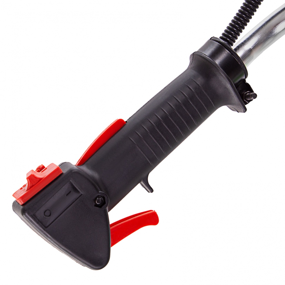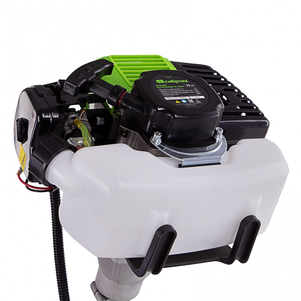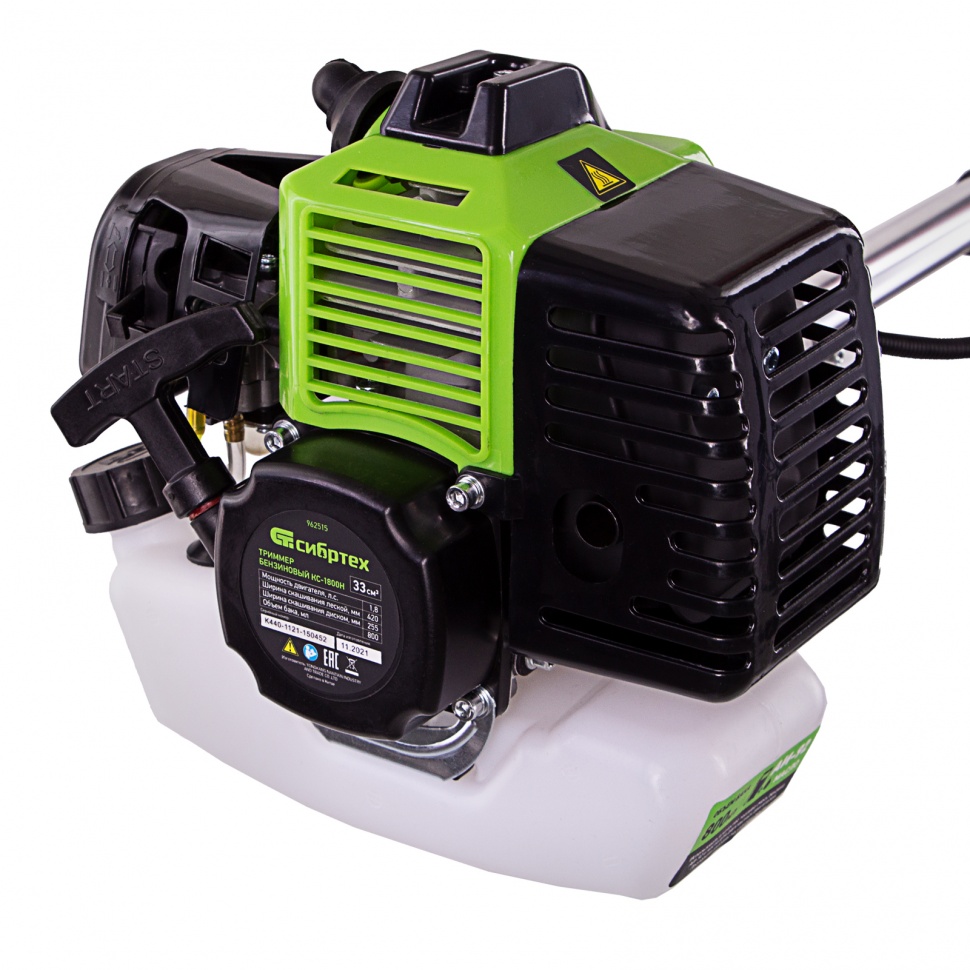 Бензиновый триммер Сибртех КС-1800Н 962515 с неразъемной штангой имеет двигатель объемом 33 куб. см, поставляется 2 частями и предназначен для ухода за дачным участком. Используется для стрижки и скашивания травы, обработки границ газонов и борьбы с сорняками. Для эффективного решения этих задач предусмотрены катушка с леской и трехлопастный нож, легко срезающий густую траву и толстые стебли. Ширина скашивания леской составляет 42 см, ножом — 25,5 см, что в сочетании с мощностью двигателя 1,8 л. с. обеспечивает высокую производительность триммера.ПреимуществаРедуктор рассчитан на высокие нагрузки, поэтому бензотриммер прослужит долго.Корпус двигателя изготовлен из ударопрочного пластика, устойчивого к механическим повреждениям.Блокиратор курка газа предотвращает случайный запуск триммера, обеспечивая безопасность пользователя.Прочный пластиковый кожух препятствует вылету травы, веток и мелких камней.Благодаря праймеру подкачки топлива двигатель легко запустится даже после долгого простоя.Полного бака хватает почти на 45 минут работы, а значит, часто доливать топливо не требуется.В комплекте имеется дозатор, поэтому не нужно искать емкость для приготовления топливной смеси.Благодаря полуавтоматической системе подачи можно обновить леску прямо во время работы, слегка ударив катушкой о землю.Специальный нож на кожухе обрезает леску до нужной длины, предотвращая излишнюю нагрузку на двигатель.Конструкцией предусмотрена улучшенная антивибрационная система, позволяющая долгое время работать без усталости.Ручки велосипедного типа обеспечивают оптимальное положение рук, поэтому мотокосу удобно удерживать и направлять.Плечевой ремень равномерно распределяет вес инструмента, что позволяет снизить нагрузку на спину.