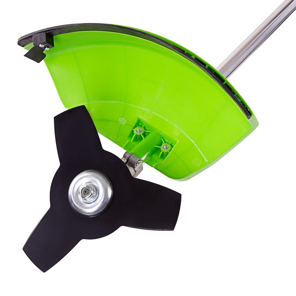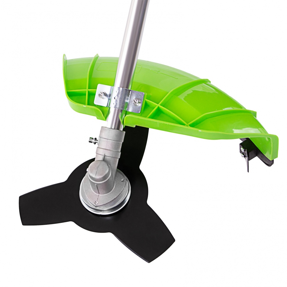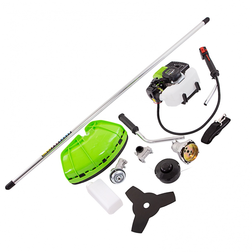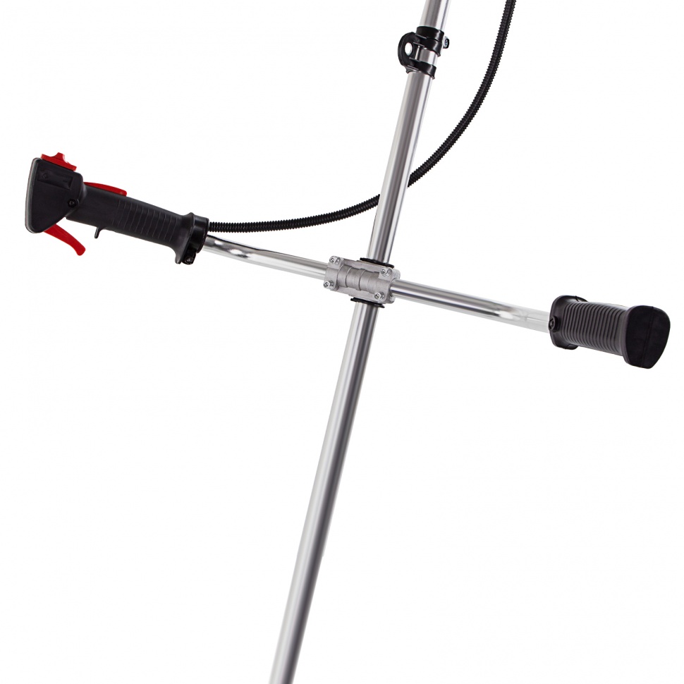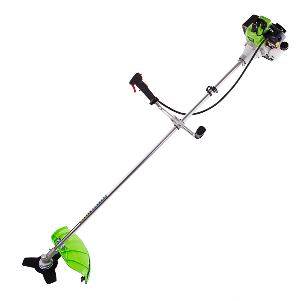 Бензиновый триммер Сибртех КС-1800Н 962515 с неразъемной штангой имеет двигатель объемом 33 куб. см, поставляется 2 частями и предназначен для ухода за дачным участком. Используется для стрижки и скашивания травы, обработки границ газонов и борьбы с сорняками. Для эффективного решения этих задач предусмотрены катушка с леской и трехлопастный нож, легко срезающий густую траву и толстые стебли. Ширина скашивания леской составляет 42 см, ножом — 25,5 см, что в сочетании с мощностью двигателя 1,8 л. с. обеспечивает высокую производительность триммера.ПреимуществаРедуктор рассчитан на высокие нагрузки, поэтому бензотриммер прослужит долго.Корпус двигателя изготовлен из ударопрочного пластика, устойчивого к механическим повреждениям.Блокиратор курка газа предотвращает случайный запуск триммера, обеспечивая безопасность пользователя.Прочный пластиковый кожух препятствует вылету травы, веток и мелких камней.Благодаря праймеру подкачки топлива двигатель легко запустится даже после долгого простоя.Полного бака хватает почти на 45 минут работы, а значит, часто доливать топливо не требуется.В комплекте имеется дозатор, поэтому не нужно искать емкость для приготовления топливной смеси.Благодаря полуавтоматической системе подачи можно обновить леску прямо во время работы, слегка ударив катушкой о землю.Специальный нож на кожухе обрезает леску до нужной длины, предотвращая излишнюю нагрузку на двигатель.Конструкцией предусмотрена улучшенная антивибрационная система, позволяющая долгое время работать без усталости.Ручки велосипедного типа обеспечивают оптимальное положение рук, поэтому мотокосу удобно удерживать и направлять.Плечевой ремень равномерно распределяет вес инструмента, что позволяет снизить нагрузку на спину.
