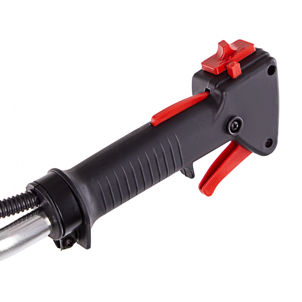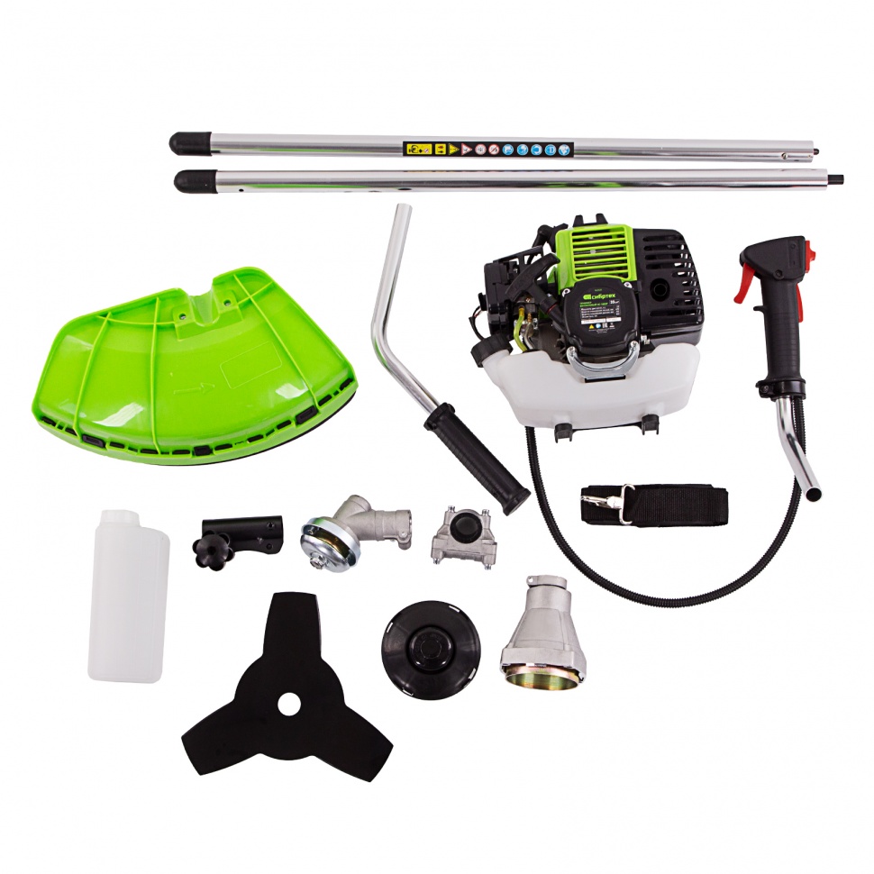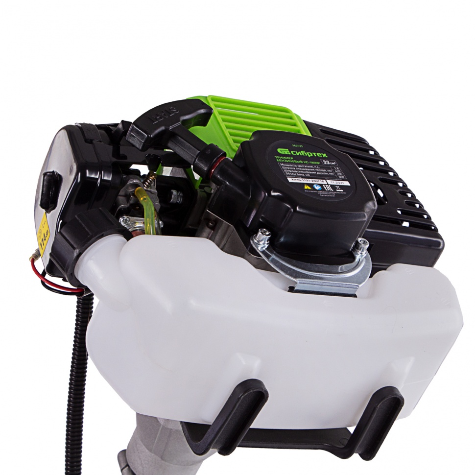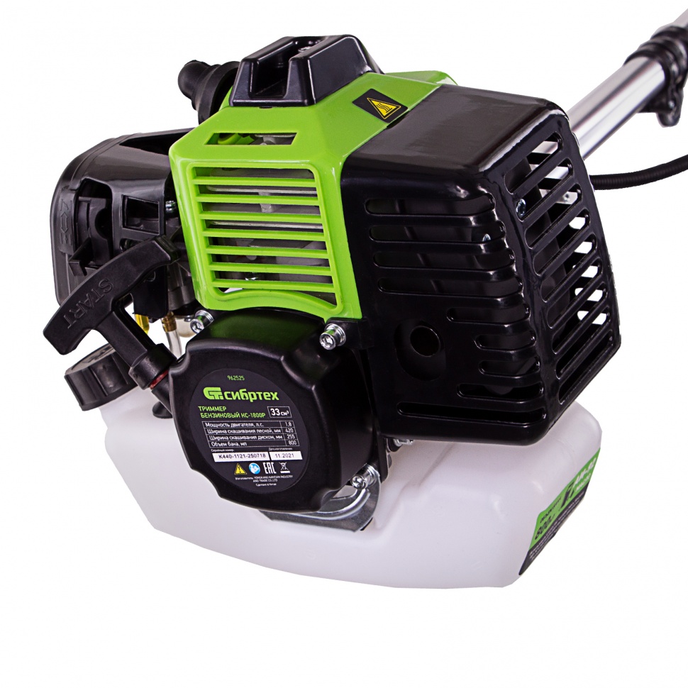 Бензиновый триммер Сибртех КС-1800Р 962525 с разъемной штангой, поставляющийся комплектом из 2 частей, имеет двигатель объемом 33 куб. см и мощностью 1,8 л.с., благодаря чему успешно справляется с подравниванием газона, скашиванием травы на лужайке и уничтожением сорняков. Выполнение этих задач облегчают режущие элементы — катушка с леской и трехлопастный нож. Леской триммер скашивает 42 см за один проход, а ножом — 25,5 см, поэтому можно за короткое время привести дачный участок в порядок. Благодаря разборной штанге мотокоса не занимает много места во время хранения и транспортировки.ПреимуществаДолговечность — редуктор бензотриммера выдерживает значительные нагрузки.Надежность — корпус двигателя выполнен из ударопрочного пластика и устойчив к повреждениям.Безопасность — блокиратор курка газа предотвращает случайное включение инструмента.Защита от летящей травы и камней — режущий элемент со стороны пользователя закрыт прочным пластиковым кожухом.Быстрый старт — праймер подкачки топлива облегчает пуск холодного двигателя.Низкий расход топлива — полного бака хватает почти на 45 минут работы, и его не нужно часто заправлять.Удобное приготовление топливной смеси — дозатор с крышкой уже входит в комплект поставки.Быстрое обновление лески — ее подача происходит при легком ударе катушкой о землю.Автоматическая обрезка корда — специальный нож укорачивает леску, предотвращая рост нагрузки на двигатель.Снижение вибраций — защитная система гасит колебания, что уменьшает усталость при длительной работе.Комфорт во время работы — велосипедные рукоятки и плечевой ремень обеспечивают оптимальное положение тела и правильное распределение нагрузки.