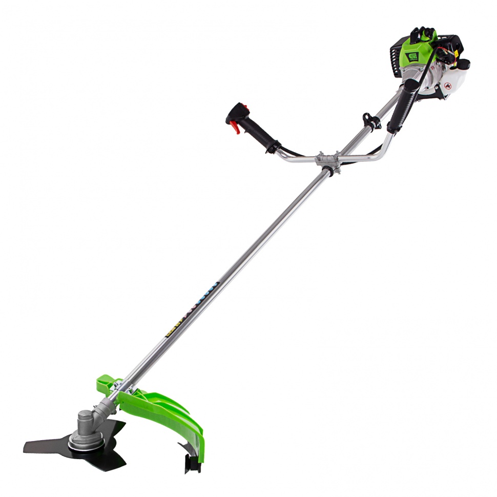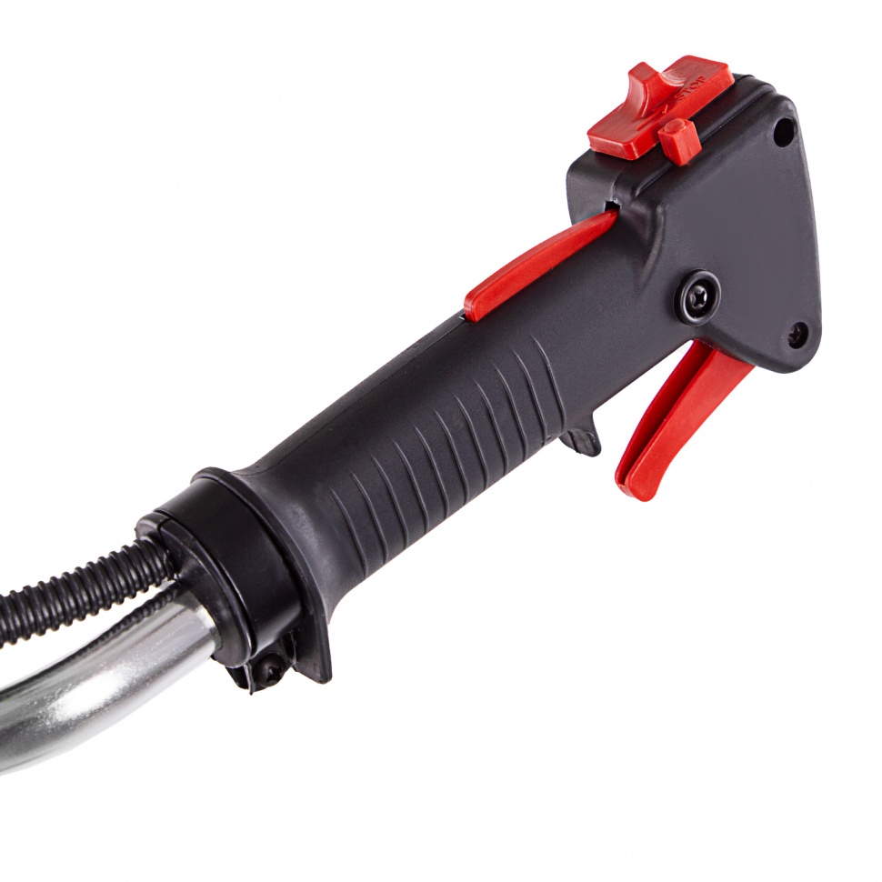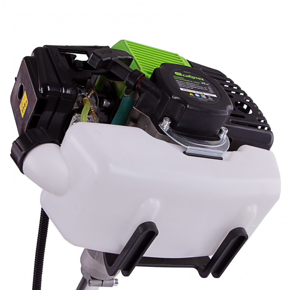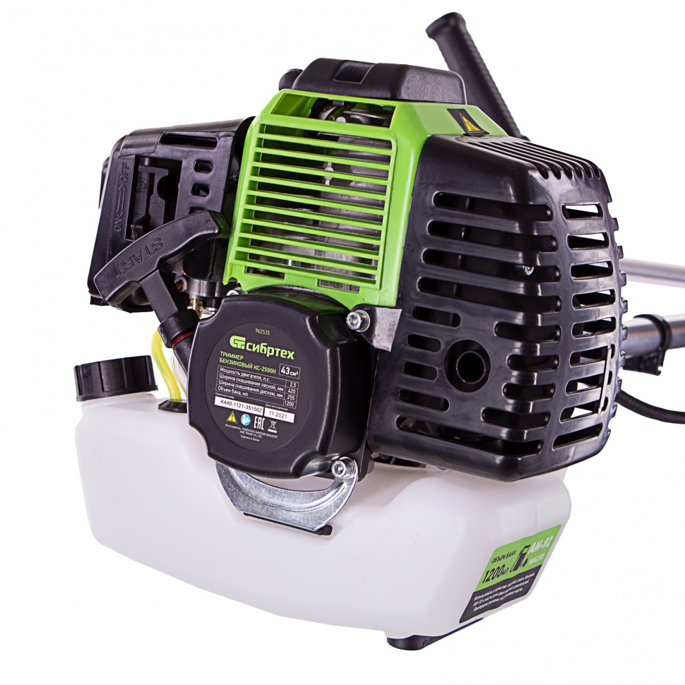 Бензиновый триммер Сибртех КС-2500Н 962535 с неразъемной штангой имеет двигатель объемом 43 куб. см, поставляется 2 частями и предназначен для ухода за дачным участком. Используется для стрижки и скашивания травы, обработки границ газонов и борьбы с сорняками. Для эффективного решения этих задач предусмотрены катушка с леской и трехлопастный нож, легко срезающий густую траву и толстые стебли. Ширина скашивания леской составляет 42 см, ножом — 25,5 см, что в сочетании с мощностью двигателя 2,5 л. с. обеспечивает высокую производительность триммера.ПреимуществаРедуктор рассчитан на высокие нагрузки, поэтому бензотриммер прослужит долго.Корпус двигателя изготовлен из ударопрочного пластика, устойчивого к механическим повреждениям.Блокиратор курка газа предотвращает случайный запуск триммера, обеспечивая безопасность пользователя.Прочный пластиковый кожух препятствует вылету травы, веток и мелких камней.Благодаря праймеру подкачки топлива двигатель легко запустится даже после долгого простоя.Полного бака хватает на 1 час работы, а значит, часто доливать топливо не требуется.В комплекте имеется дозатор, поэтому не нужно искать емкость для приготовления топливной смеси.Благодаря полуавтоматической системе подачи можно обновить леску прямо во время работы, слегка ударив катушкой о землю.Специальный нож на кожухе обрезает леску до нужной длины, предотвращая излишнюю нагрузку на двигатель.Конструкцией предусмотрена улучшенная антивибрационная система, позволяющая долгое время работать без усталости.Ручки велосипедного типа обеспечивают оптимальное положение рук, поэтому мотокосу удобно удерживать и направлять.Плечевой ремень равномерно распределяет вес инструмента, что позволяет снизить нагрузку на спину.