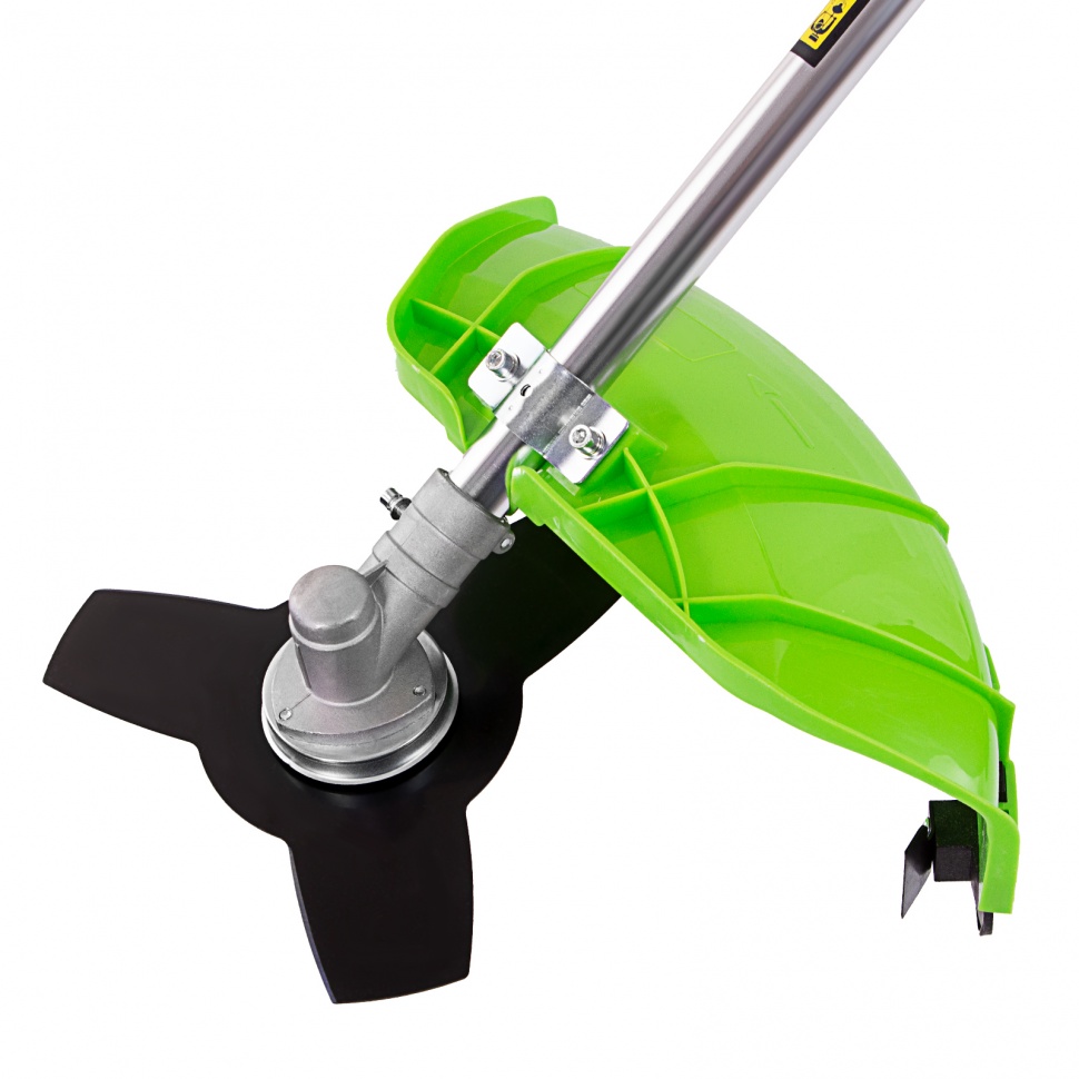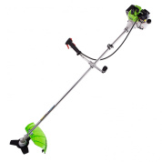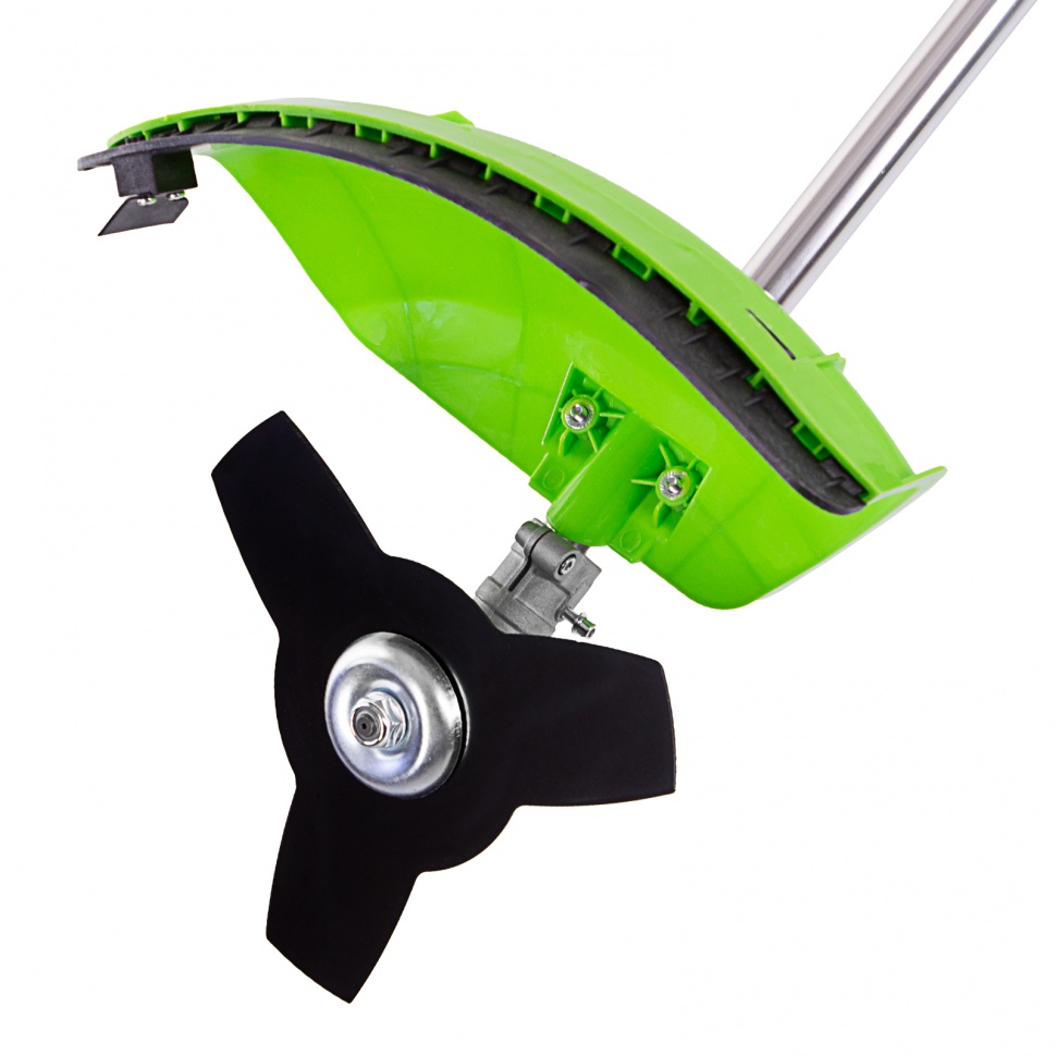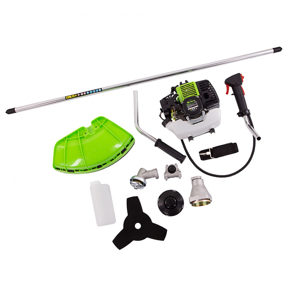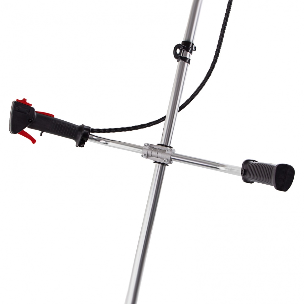 Бензиновый триммер Сибртех КС-2500Н 962535 с неразъемной штангой имеет двигатель объемом 43 куб. см, поставляется 2 частями и предназначен для ухода за дачным участком. Используется для стрижки и скашивания травы, обработки границ газонов и борьбы с сорняками. Для эффективного решения этих задач предусмотрены катушка с леской и трехлопастный нож, легко срезающий густую траву и толстые стебли. Ширина скашивания леской составляет 42 см, ножом — 25,5 см, что в сочетании с мощностью двигателя 2,5 л. с. обеспечивает высокую производительность триммера.ПреимуществаРедуктор рассчитан на высокие нагрузки, поэтому бензотриммер прослужит долго.Корпус двигателя изготовлен из ударопрочного пластика, устойчивого к механическим повреждениям.Блокиратор курка газа предотвращает случайный запуск триммера, обеспечивая безопасность пользователя.Прочный пластиковый кожух препятствует вылету травы, веток и мелких камней.Благодаря праймеру подкачки топлива двигатель легко запустится даже после долгого простоя.Полного бака хватает на 1 час работы, а значит, часто доливать топливо не требуется.В комплекте имеется дозатор, поэтому не нужно искать емкость для приготовления топливной смеси.Благодаря полуавтоматической системе подачи можно обновить леску прямо во время работы, слегка ударив катушкой о землю.Специальный нож на кожухе обрезает леску до нужной длины, предотвращая излишнюю нагрузку на двигатель.Конструкцией предусмотрена улучшенная антивибрационная система, позволяющая долгое время работать без усталости.Ручки велосипедного типа обеспечивают оптимальное положение рук, поэтому мотокосу удобно удерживать и направлять.Плечевой ремень равномерно распределяет вес инструмента, что позволяет снизить нагрузку на спину.
