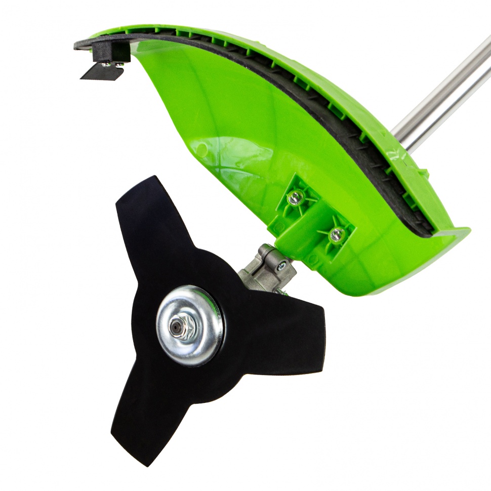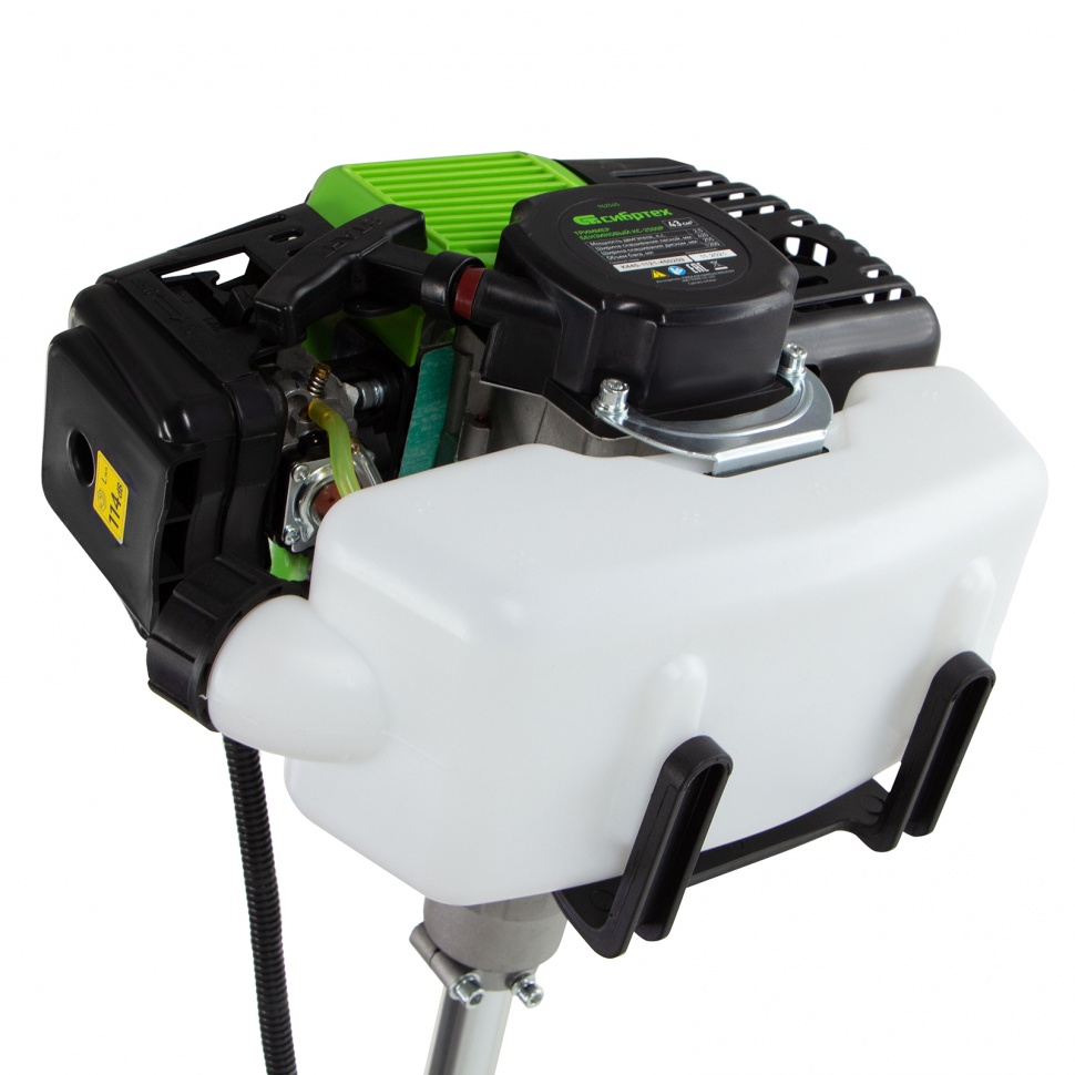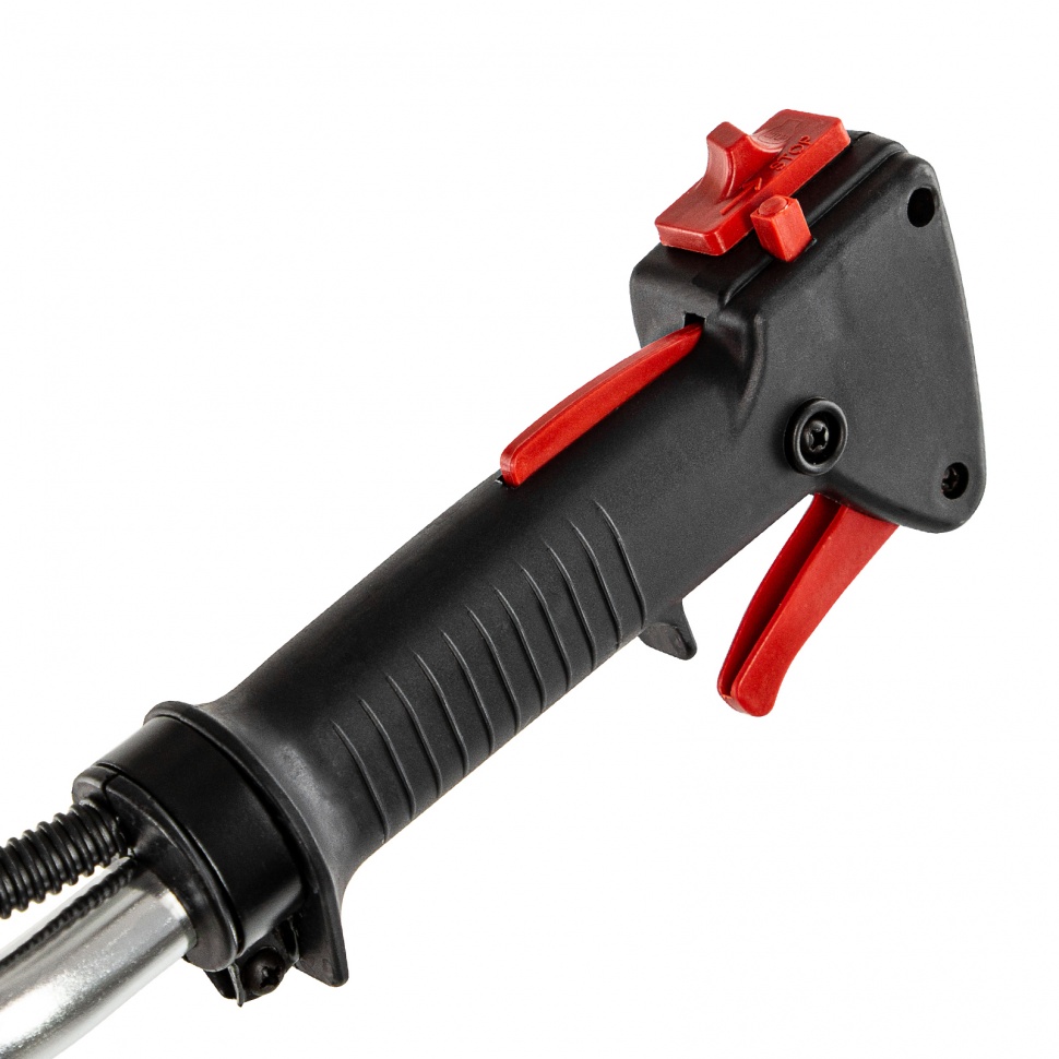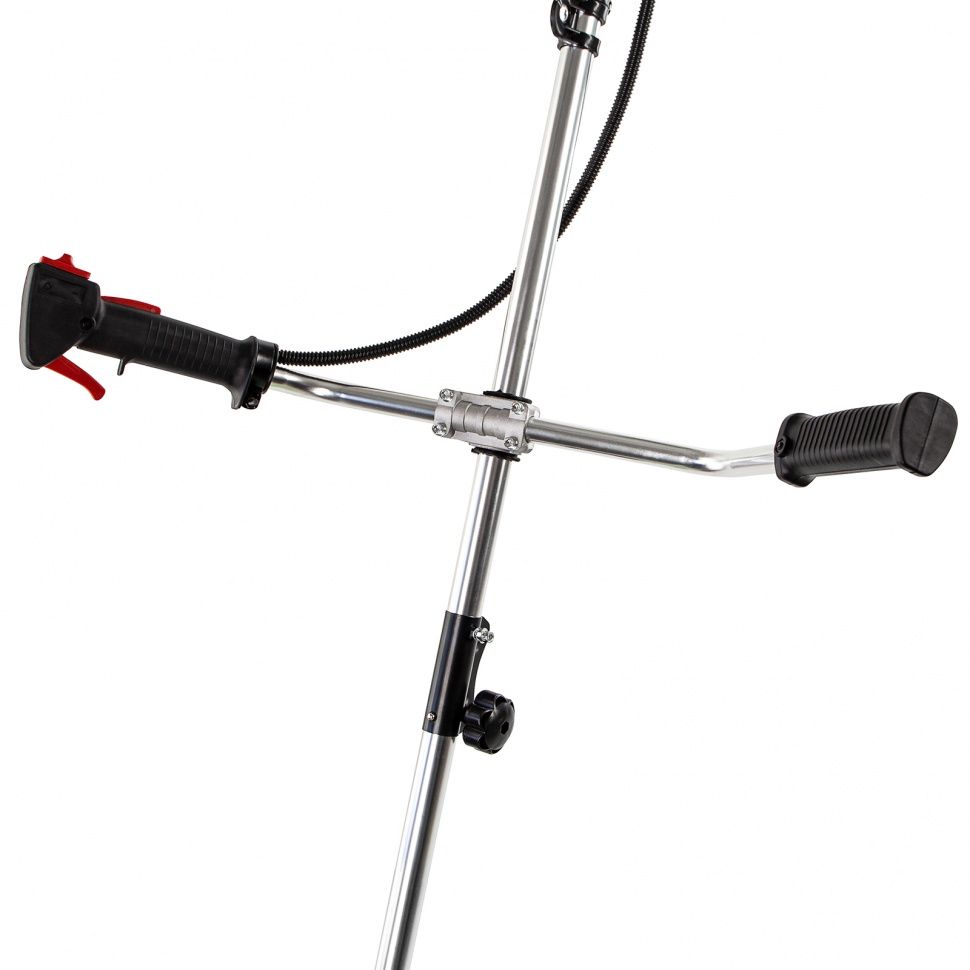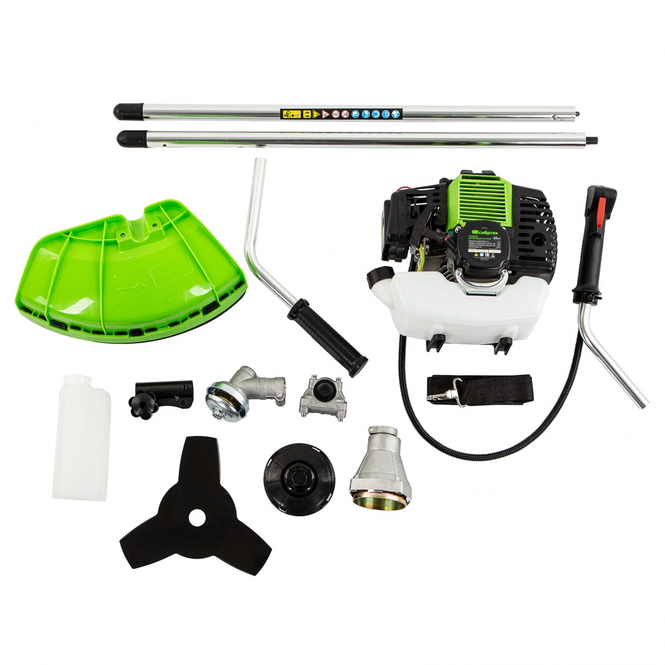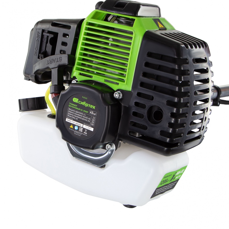 Бензиновый триммер Сибртех КС-2500Р 962545 с разъемной штангой, поставляющийся комплектом из 2 частей, имеет двигатель объемом 43 куб. см и мощностью 2,5 л.с., благодаря чему успешно справляется с подравниванием газона, скашиванием травы на лужайке и уничтожением сорняков. Выполнение этих задач облегчают режущие элементы — катушка с леской и трехлопастный нож. Леской триммер скашивает 42 см за один проход, а ножом — 25,5 см, поэтому можно за короткое время привести дачный участок в порядок. Благодаря разборной штанге мотокоса не занимает много места во время хранения и транспортировки.ПреимуществаДолговечность — редуктор бензотриммера выдерживает значительные нагрузки.Надежность — корпус двигателя выполнен из ударопрочного пластика и устойчив к повреждениям.Безопасность — блокиратор курка газа предотвращает случайное включение инструмента.Защита от летящей травы и камней — режущий элемент со стороны пользователя закрыт прочным пластиковым кожухом.Быстрый старт — праймер подкачки топлива облегчает пуск холодного двигателя.Низкий расход топлива — полного бака хватает на 1 час работы, и его не нужно часто заправлять.Удобное приготовление топливной смеси — дозатор с крышкой уже входит в комплект поставки.Быстрое обновление лески — ее подача происходит при легком ударе катушкой о землю.Автоматическая обрезка корда — специальный нож укорачивает леску, предотвращая рост нагрузки на двигатель.Снижение вибраций — защитная система гасит колебания, что уменьшает усталость при длительной работе.Комфорт во время работы — велосипедные рукоятки и плечевой ремень обеспечивают оптимальное положение тела и правильное распределение нагрузки.