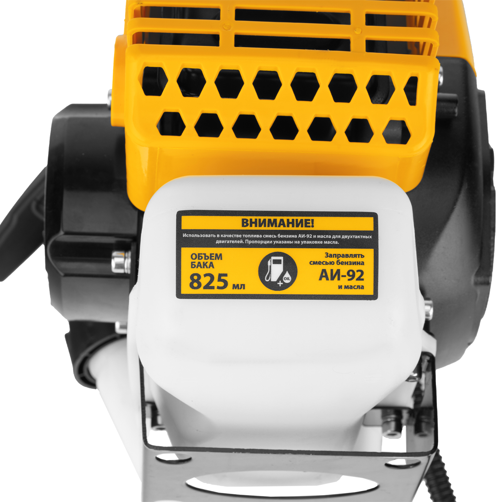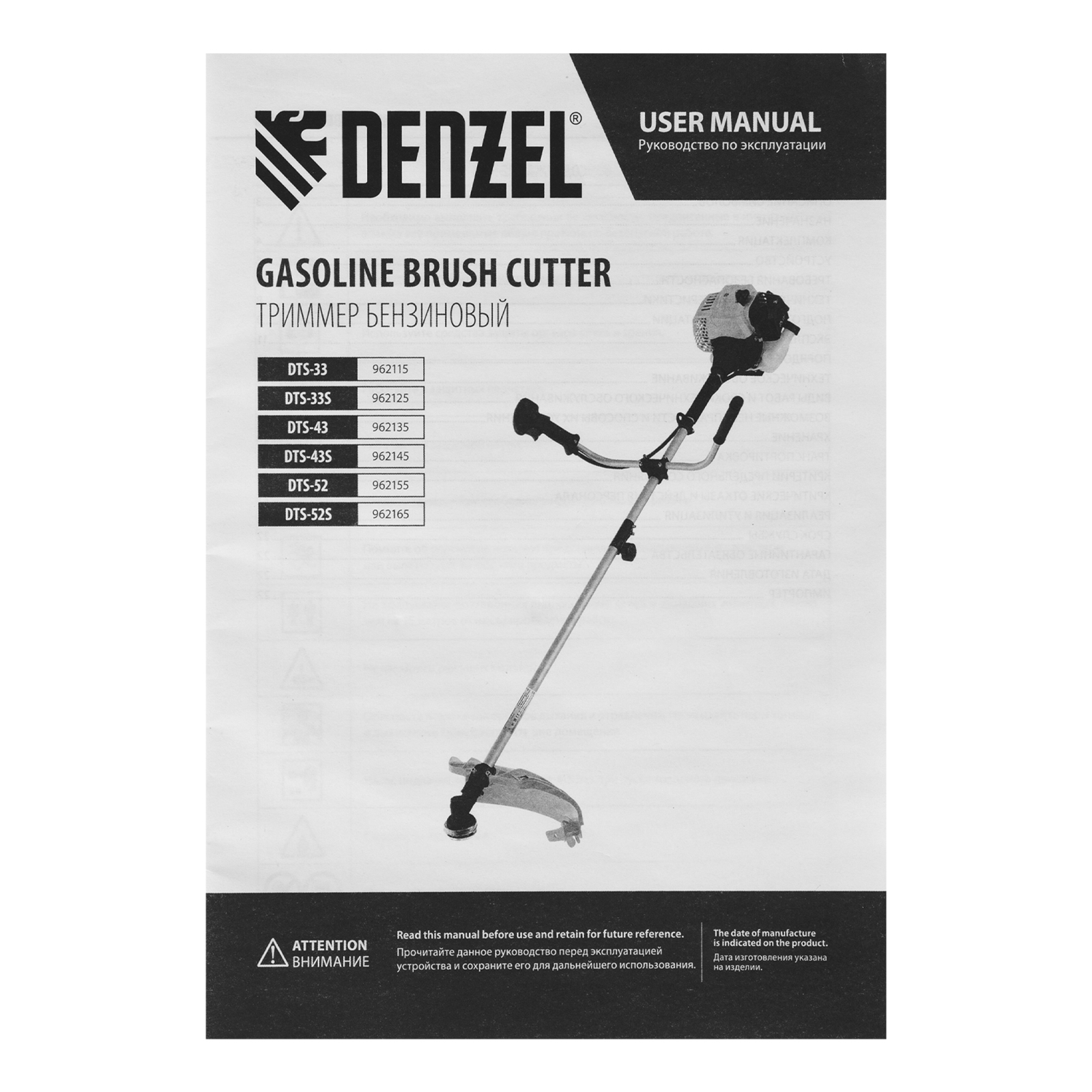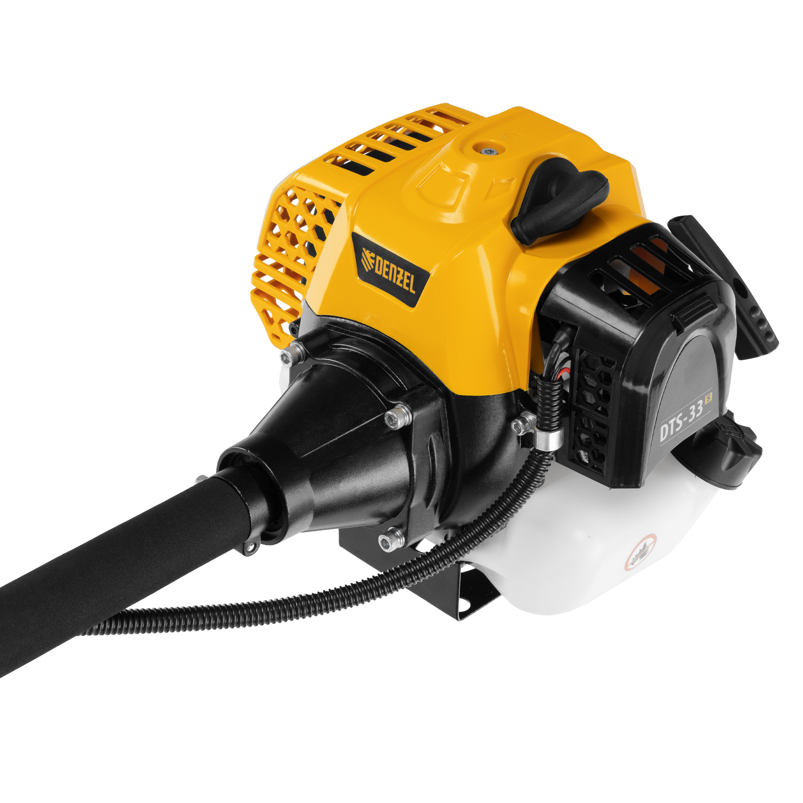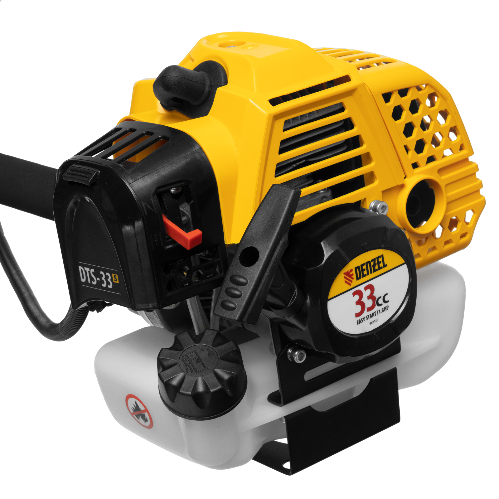 Бензиновый триммер Denzel DTS-33S 962125 с двигателем объемом 33 куб. см и разъемной штангой (состоит из 2 частей), используется для скашивания травы различных типов, в том числе с жесткими стеблями (полыни, крапивы, лебеды). Комплектуется двумя режущими оснастками — усиленной катушкой с леской и трехлопастным стальным ножом. Ширина скашивания леской составляет 42 см, а ножом — 25,5 см.,Двухтактный бензиновый двигатель мощностью 1,8 л.с. обеспечивает эффективное решение поставленных задач и полную автономность. Работать можно даже в самых отдаленных участках сада, не заботясь о наличии сети электропитания.ПреимуществаВысококачественное исполнение — надежный редуктор, двигатель с хромированным цилиндром и прочные чугунные колодки сцепления обеспечивают стабильную работу триммера.Система Easy Start — трос стартера вытягивается легко и без рывков, что упрощает начало работы.Легкое включение — праймер для подкачки топлива упрощает запуск двигателя даже после долгого простоя.Защита от случайного пуска — блокиратор курка газа предотвращает включение триммера по неосторожности, обеспечивая безопасность пользователя.Безопасная эксплуатация — прочный кожух, закрывающий оснастку, защищает пользователя от летящей травы, грязи и мелких камней.Быстрое обновление лески — достаточно слегка ударить полуавтоматической катушкой по земле, не снижая оборотов двигателя.Специальный нож на фартуке кожуха — концы лески подрезаются до нужной длины, это позволяет предотвратить перегрузку двигателя.Эргономичность — рукоятки велосипедного типа обеспечивают правильное положение рук.Удобная работа без усталости — одноплечевая подвесная система перераспределяет вес техники, а мягкая защита бедра позволяет снизить уровень вибраций и избежать ударов.Быстрая подготовка к работе — бензотриммер поставляется с уже установленным на штангу редуктором и корпусом сцепления.Дозатор в комплекте — емкость для приготовления топливной смеси не придется приобретать отдельно.Разборная штанга — триммер удобен в хранении и транспортировке.Дополнительные возможности — можно приобрести диск Denzel 96323 с шириной скашивания 230 мм для быстрого удаления растительности с жесткими стеблями, 96328 для скашивания молодых побегов кустарника диаметром до 3 мм, 96340 для срезания борщевика, кустарника и молодых побегов деревьев с диаметром стволов до 10 мм.Гарантия 3 года — высокое качество техники подтверждено производителем.