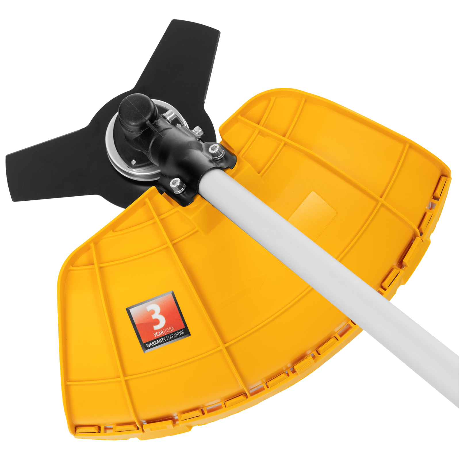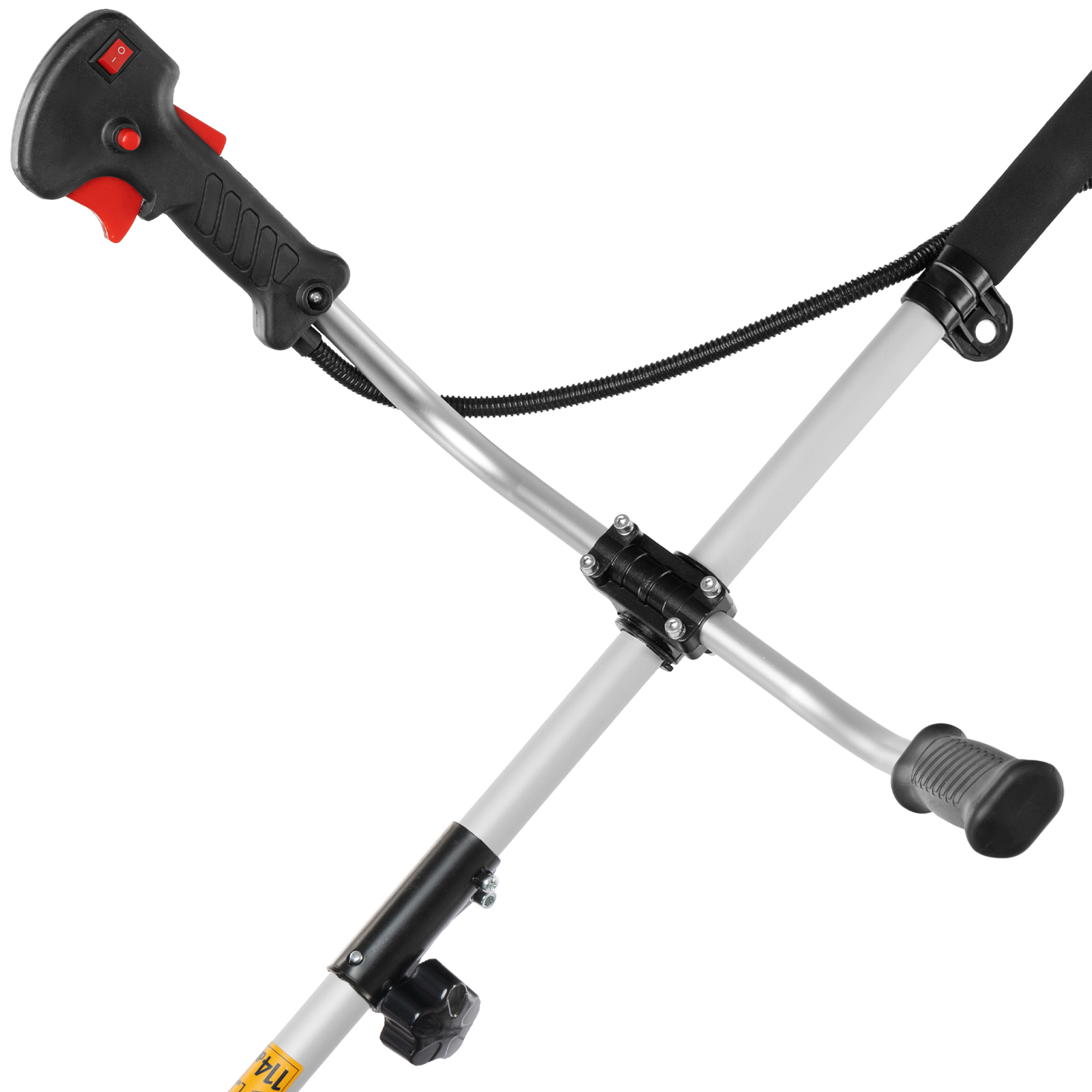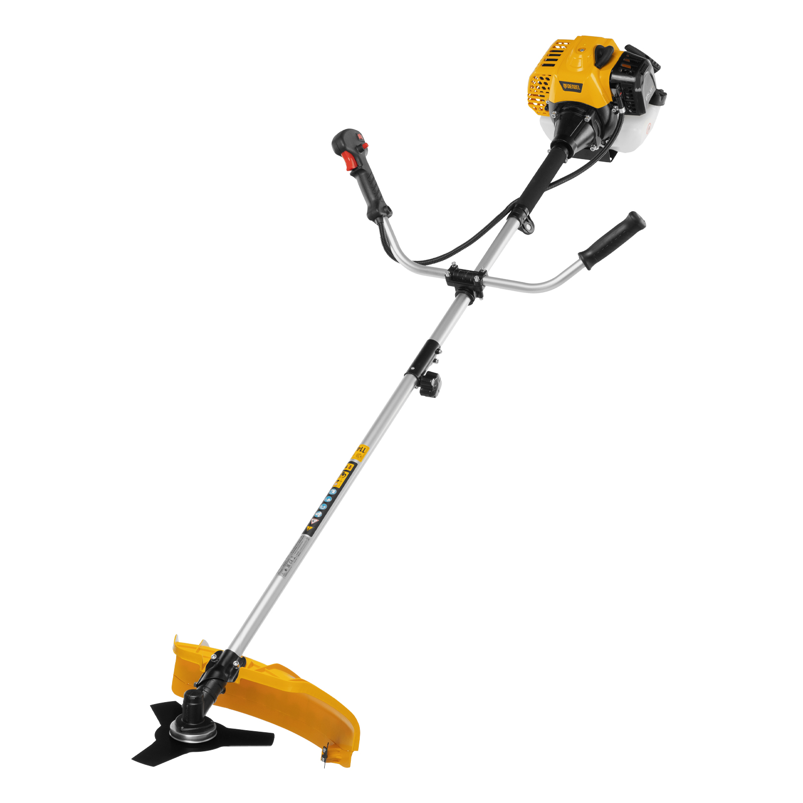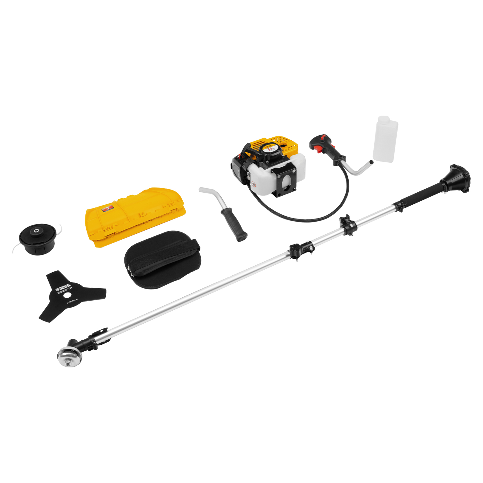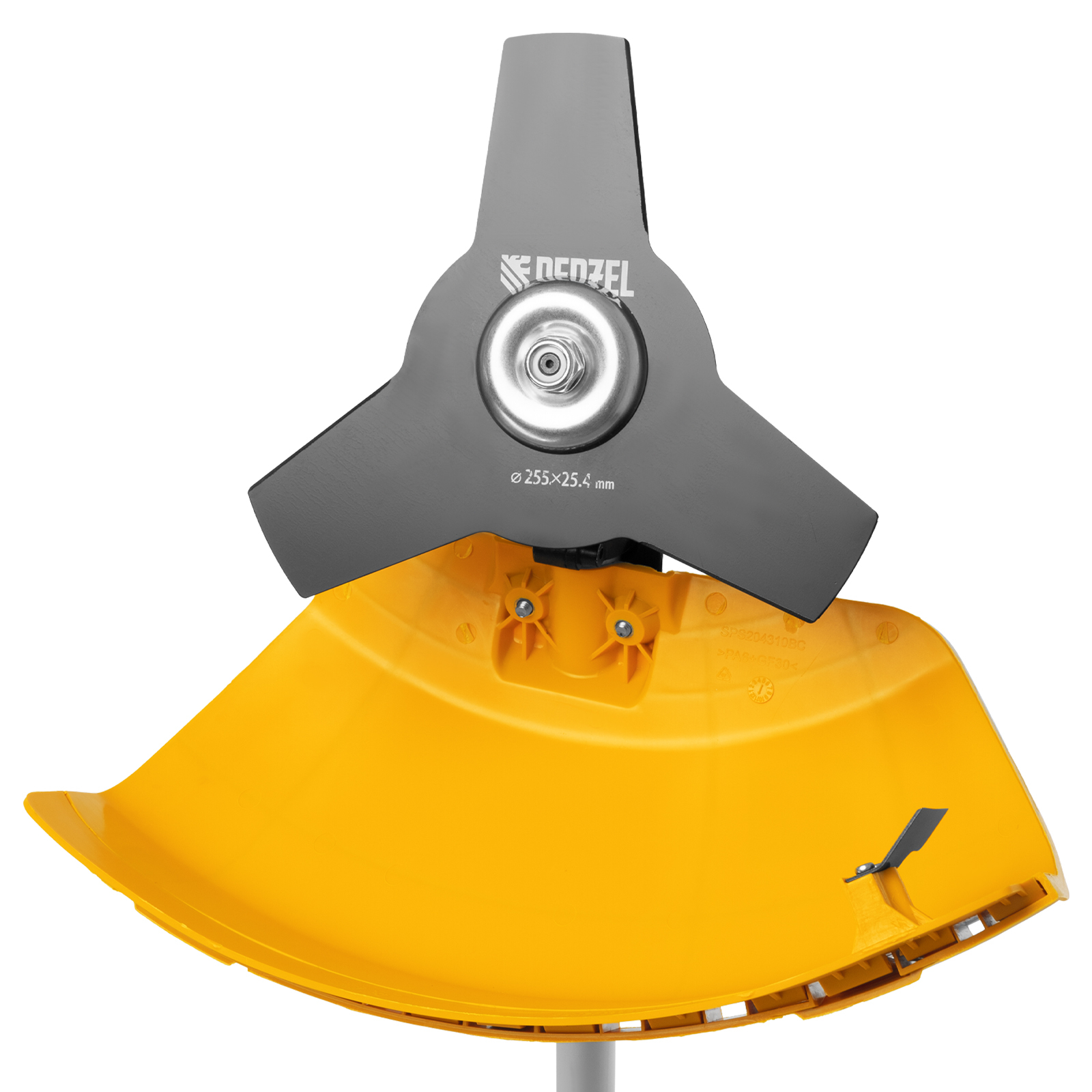 Бензиновый триммер Denzel DTS-33S 962125 с двигателем объемом 33 куб. см и разъемной штангой (состоит из 2 частей), используется для скашивания травы различных типов, в том числе с жесткими стеблями (полыни, крапивы, лебеды). Комплектуется двумя режущими оснастками — усиленной катушкой с леской и трехлопастным стальным ножом. Ширина скашивания леской составляет 42 см, а ножом — 25,5 см.,Двухтактный бензиновый двигатель мощностью 1,8 л.с. обеспечивает эффективное решение поставленных задач и полную автономность. Работать можно даже в самых отдаленных участках сада, не заботясь о наличии сети электропитания.ПреимуществаВысококачественное исполнение — надежный редуктор, двигатель с хромированным цилиндром и прочные чугунные колодки сцепления обеспечивают стабильную работу триммера.Система Easy Start — трос стартера вытягивается легко и без рывков, что упрощает начало работы.Легкое включение — праймер для подкачки топлива упрощает запуск двигателя даже после долгого простоя.Защита от случайного пуска — блокиратор курка газа предотвращает включение триммера по неосторожности, обеспечивая безопасность пользователя.Безопасная эксплуатация — прочный кожух, закрывающий оснастку, защищает пользователя от летящей травы, грязи и мелких камней.Быстрое обновление лески — достаточно слегка ударить полуавтоматической катушкой по земле, не снижая оборотов двигателя.Специальный нож на фартуке кожуха — концы лески подрезаются до нужной длины, это позволяет предотвратить перегрузку двигателя.Эргономичность — рукоятки велосипедного типа обеспечивают правильное положение рук.Удобная работа без усталости — одноплечевая подвесная система перераспределяет вес техники, а мягкая защита бедра позволяет снизить уровень вибраций и избежать ударов.Быстрая подготовка к работе — бензотриммер поставляется с уже установленным на штангу редуктором и корпусом сцепления.Дозатор в комплекте — емкость для приготовления топливной смеси не придется приобретать отдельно.Разборная штанга — триммер удобен в хранении и транспортировке.Дополнительные возможности — можно приобрести диск Denzel 96323 с шириной скашивания 230 мм для быстрого удаления растительности с жесткими стеблями, 96328 для скашивания молодых побегов кустарника диаметром до 3 мм, 96340 для срезания борщевика, кустарника и молодых побегов деревьев с диаметром стволов до 10 мм.Гарантия 3 года — высокое качество техники подтверждено производителем.