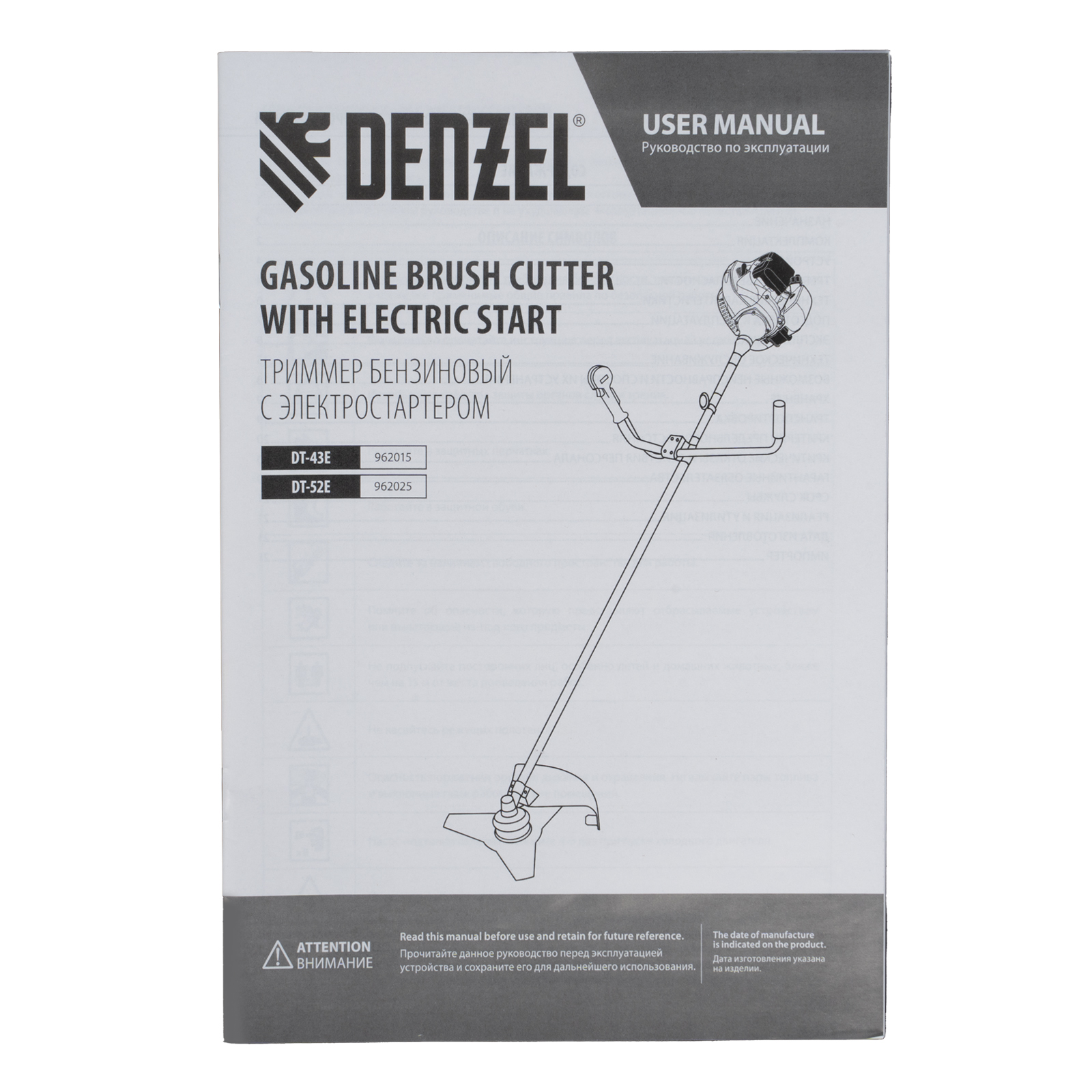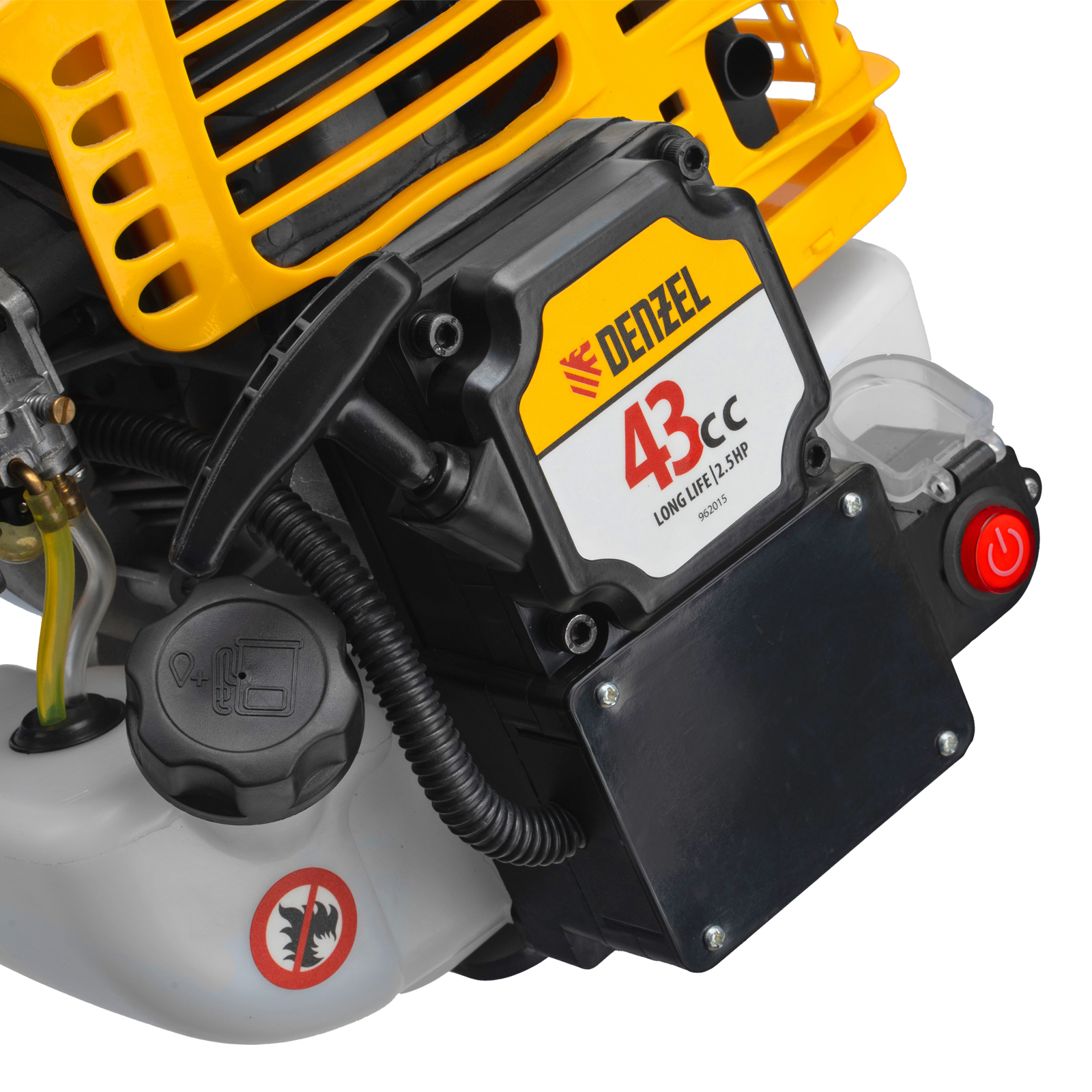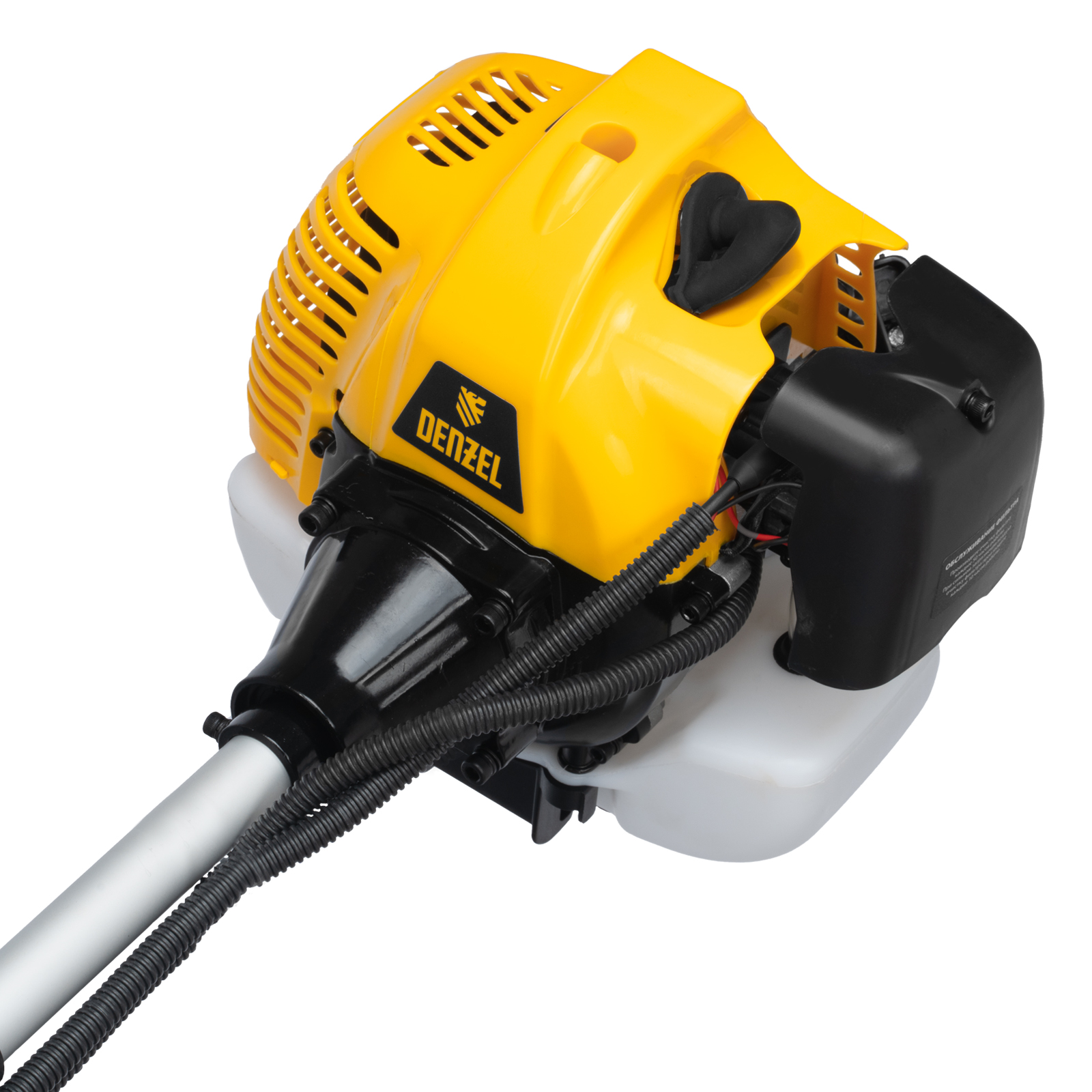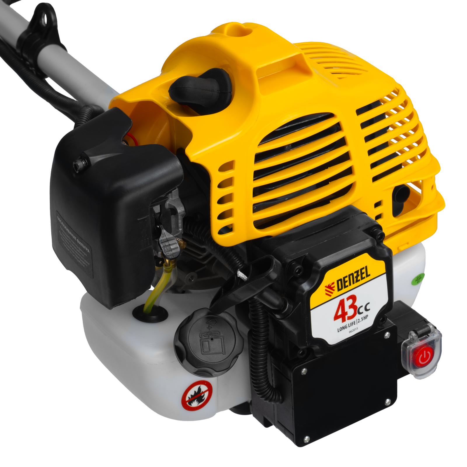 Бензиновый триммер Denzel DT-43E 962015 с двигателем объемом 43 куб. см, с неразъемной штангой и электростартером, поставляется комплектом из 2 частей и используется для ухода за дачным участком. С его помощью можно подравнять газон, скосить траву любого типа, в том числе с жесткими древовидными стеблями (полынь, крапива, лебеда, борщевик), а также срезать кустарник и молодые побеги деревьев с диаметром стволов до 10 мм. Триммер успешно справляется с этими задачами благодаря входящим в комплект катушке с леской и пильному диску с шириной скашивания 42 и 25,5 см соответственно. На штангу уже установлен редуктор и корпус сцепления, что упрощает подготовку инструмента к работе.ПреимуществаВысокий ресурс — благодаря хромированному цилиндру двигателя, прочному сцеплению и надежному редуктору триммер выдерживает работу при повышенных нагрузках.Безопасность — блокиратор курка газа препятствует случайному запуску двигателя, прочный пластиковый кожух защищает пользователя от летящей травы, грязи и прочих твердых частиц.Легкий запуск в любых условиях — благодаря электростартеру двигатель запускается одним нажатием на кнопку, а праймер для подкачки топлива облегчает запуск после длительного перерыва.Круиз-контроль — двигатель поддерживает заданные обороты, что позволяет не отвлекаться на регулировку скорости во время длительной работы.Полуавтоматическая система подачи лески — удлинить ее можно прямо во время работы, достаточно слегка ударить катушкой о землю.Автоматическая подрезка лески — нож на кожухе укорачивает концы корда до нужной длины, что предотвращает перегрузку двигателя.Легкое управление — все функциональные клавиши вынесены на правую рукоятку.Максимально комфортная работа — благодаря плечевому ремню триммер удобно удерживать, а мягкая пластина предохраняет пользователя от вибраций и ударов штангой по бедру.Полный комплект поставки — аккумулятор, зарядное устройство и удобный дозатор для приготовления топливной смеси прилагаются к триммеру.Дополнительные возможности — можно приобрести и установить на триммер диски Denzel 96323, 96325 для быстрого удаления растительности с жесткими стеблями (полыни, крапивы, лебеды), 96328 для скашивания молодых побегов кустарника диаметром до 3 мм.Гарантия 3 года — высокое качество техники подтверждено производителем.