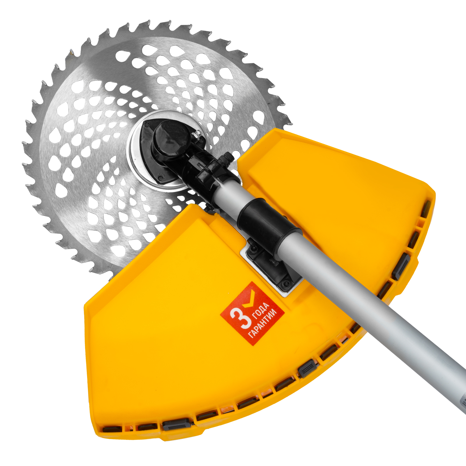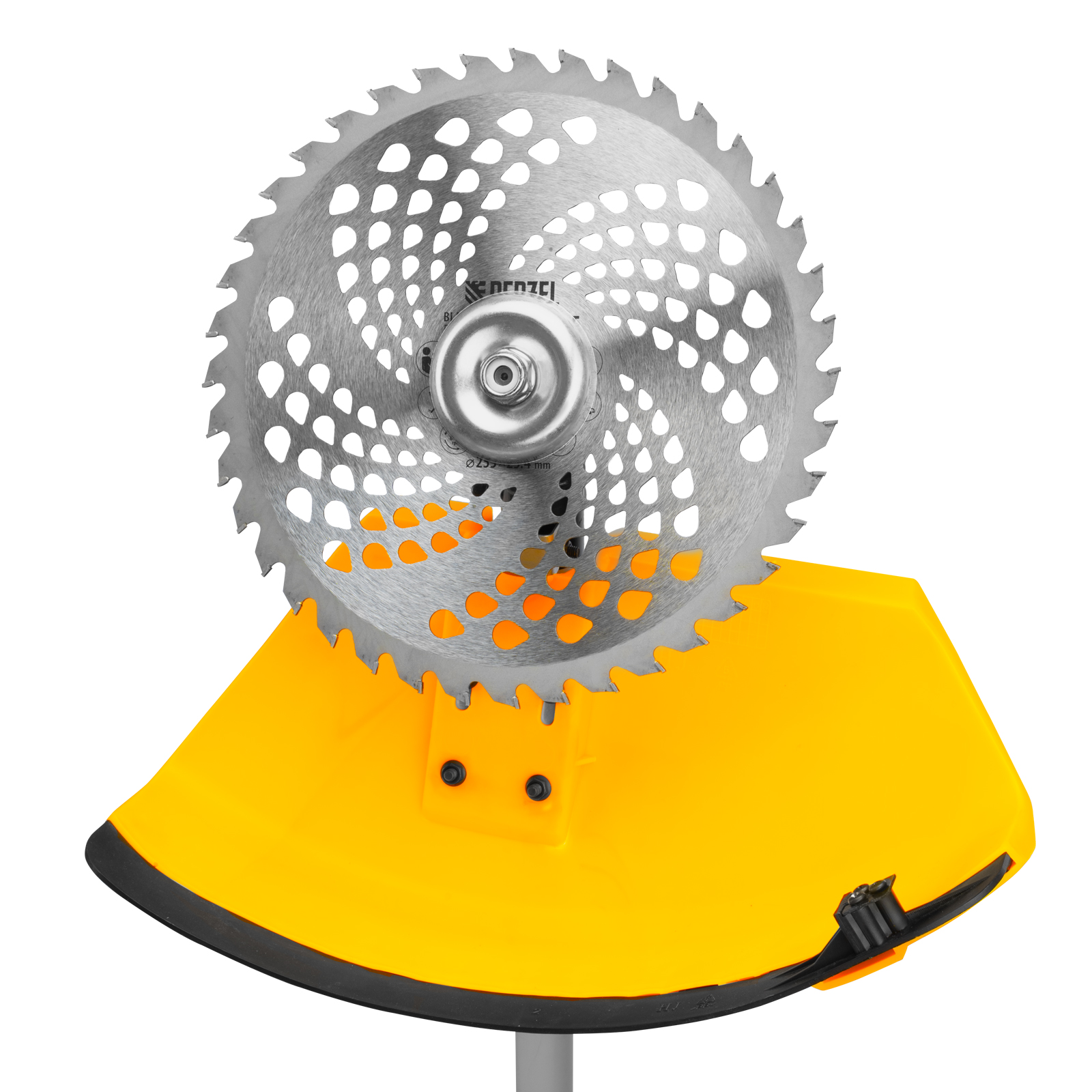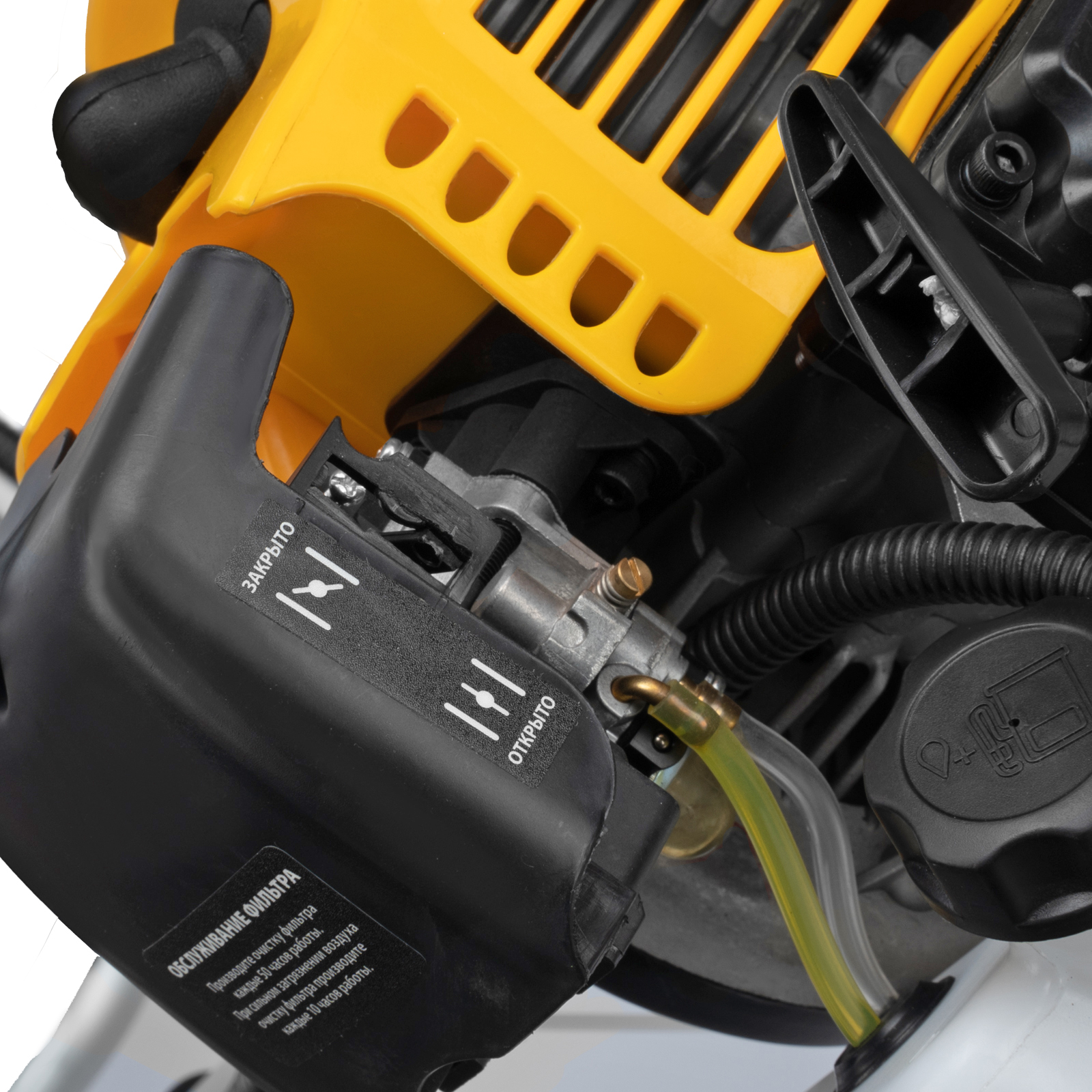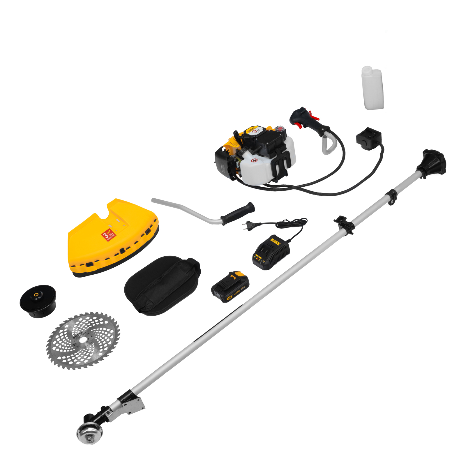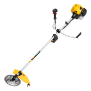 Бензиновый триммер Denzel DT-43E 962015 с двигателем объемом 43 куб. см, с неразъемной штангой и электростартером, поставляется комплектом из 2 частей и используется для ухода за дачным участком. С его помощью можно подравнять газон, скосить траву любого типа, в том числе с жесткими древовидными стеблями (полынь, крапива, лебеда, борщевик), а также срезать кустарник и молодые побеги деревьев с диаметром стволов до 10 мм. Триммер успешно справляется с этими задачами благодаря входящим в комплект катушке с леской и пильному диску с шириной скашивания 42 и 25,5 см соответственно. На штангу уже установлен редуктор и корпус сцепления, что упрощает подготовку инструмента к работе.ПреимуществаВысокий ресурс — благодаря хромированному цилиндру двигателя, прочному сцеплению и надежному редуктору триммер выдерживает работу при повышенных нагрузках.Безопасность — блокиратор курка газа препятствует случайному запуску двигателя, прочный пластиковый кожух защищает пользователя от летящей травы, грязи и прочих твердых частиц.Легкий запуск в любых условиях — благодаря электростартеру двигатель запускается одним нажатием на кнопку, а праймер для подкачки топлива облегчает запуск после длительного перерыва.Круиз-контроль — двигатель поддерживает заданные обороты, что позволяет не отвлекаться на регулировку скорости во время длительной работы.Полуавтоматическая система подачи лески — удлинить ее можно прямо во время работы, достаточно слегка ударить катушкой о землю.Автоматическая подрезка лески — нож на кожухе укорачивает концы корда до нужной длины, что предотвращает перегрузку двигателя.Легкое управление — все функциональные клавиши вынесены на правую рукоятку.Максимально комфортная работа — благодаря плечевому ремню триммер удобно удерживать, а мягкая пластина предохраняет пользователя от вибраций и ударов штангой по бедру.Полный комплект поставки — аккумулятор, зарядное устройство и удобный дозатор для приготовления топливной смеси прилагаются к триммеру.Дополнительные возможности — можно приобрести и установить на триммер диски Denzel 96323, 96325 для быстрого удаления растительности с жесткими стеблями (полыни, крапивы, лебеды), 96328 для скашивания молодых побегов кустарника диаметром до 3 мм.Гарантия 3 года — высокое качество техники подтверждено производителем.