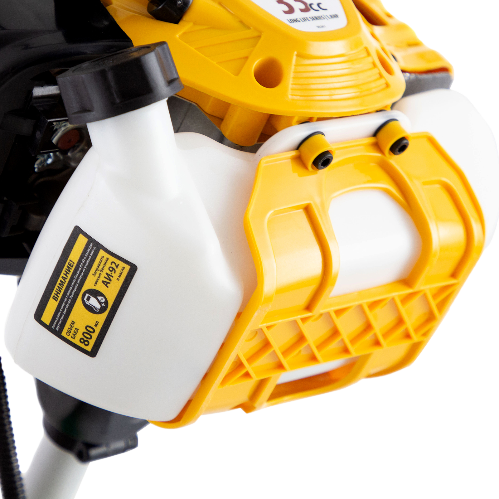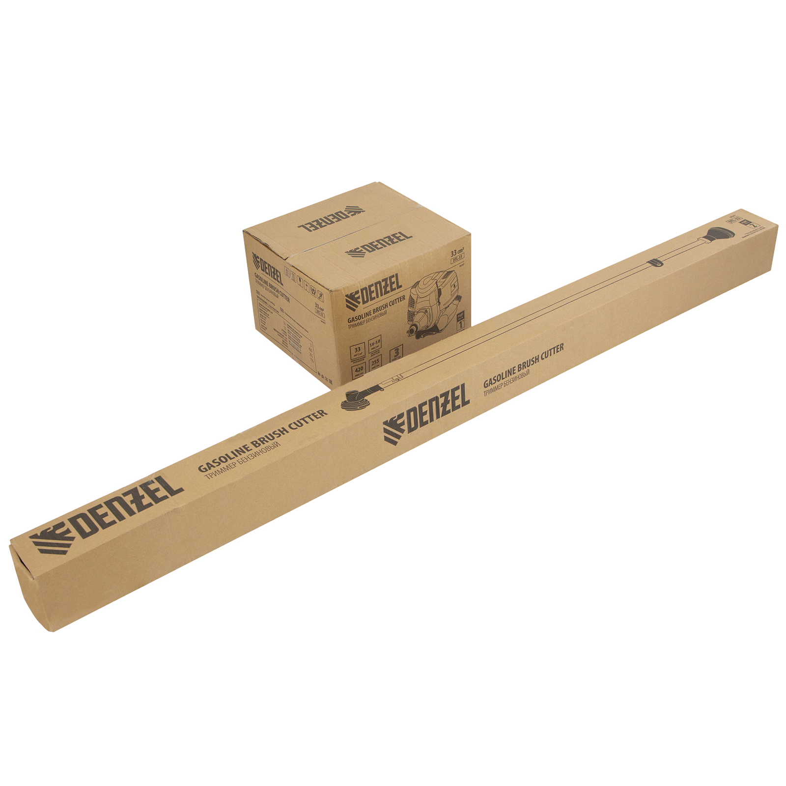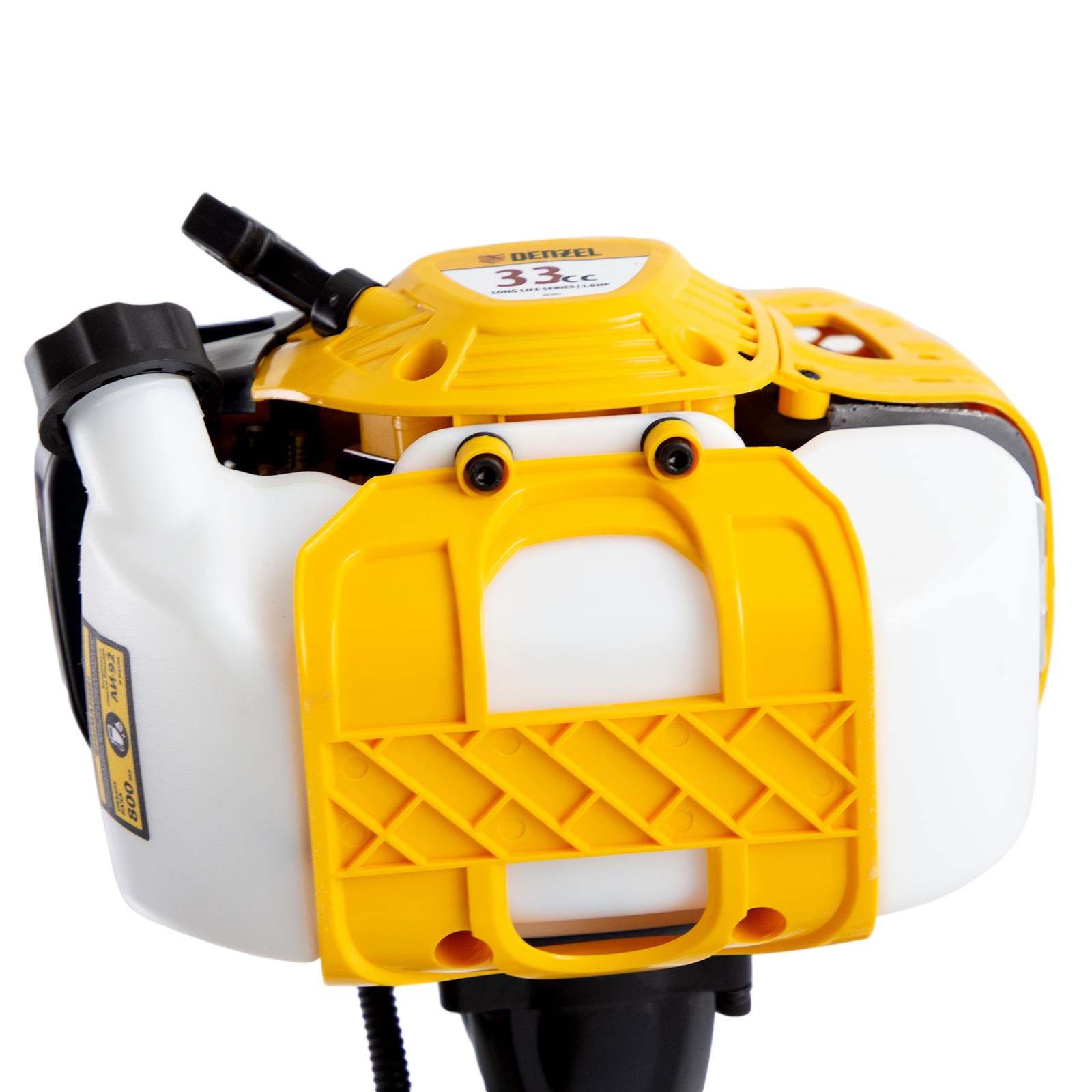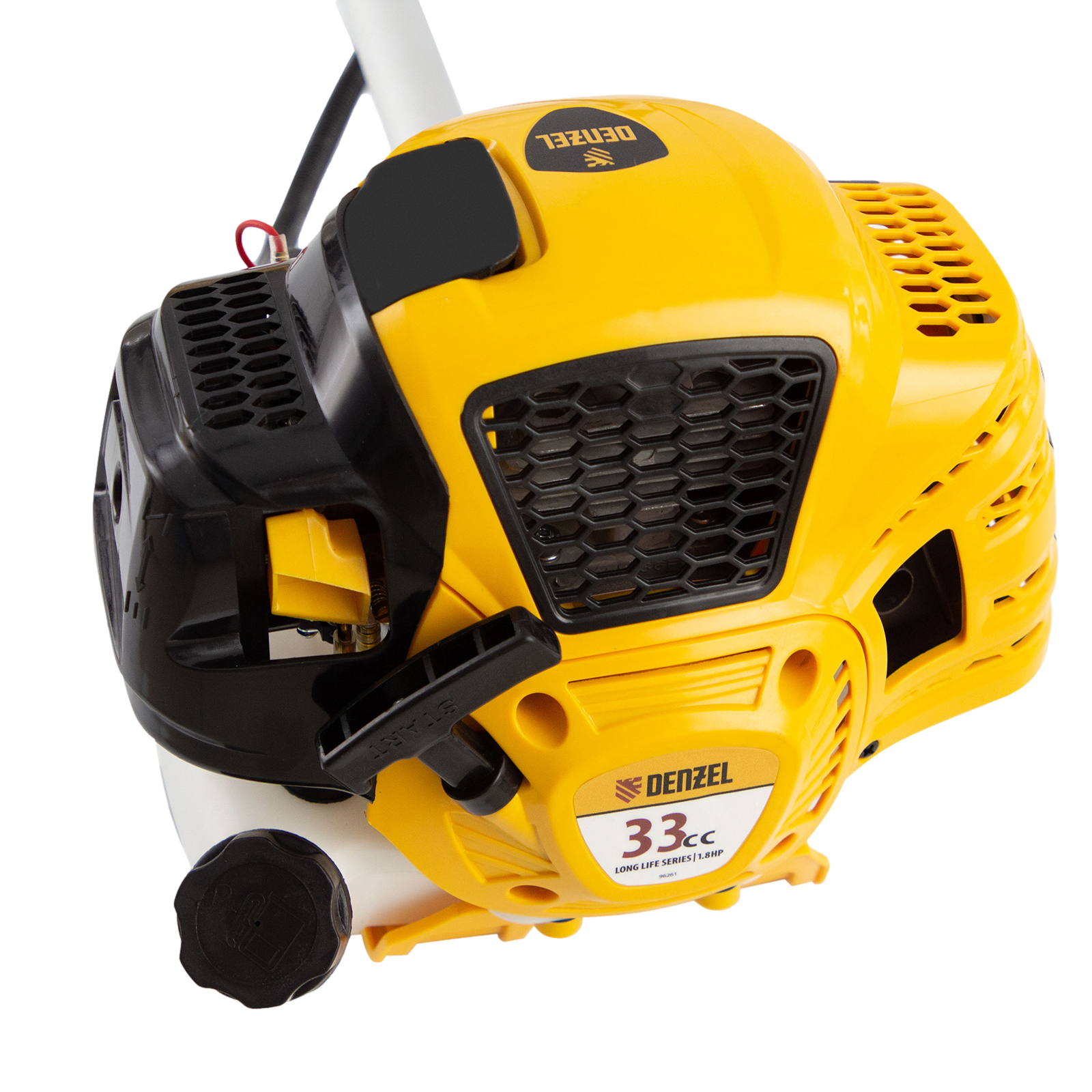 Бензиновый триммер Denzel DTL-33 96261 с объемом двигателя 33 см3 и неразъемной штангой подходит как для частичного подравнивания газона, так и скашивания травы всех типов, в том числе с жесткими древовидными стеблями (полыни, крапивы, лебеды, борщевика). Также эффективен для срезания кустарника и молодых побегов деревьев с диаметром стволов до 10 мм. Два режущих инструмента — леска и пильный диск — работают на скорости 9500 об/мин и обеспечивают ширину скашивания 42 и 25,5 см соответственно.Двигатель мощностью 1,8 л.с. экономично потребляет топливо, поэтому часто заправлять бак не придется. Триммер не требует подключения к стационарному источнику питания и может использоваться в самом отдаленном уголке дачного участка. ПреимуществаВысокий ресурс поршневой группы — цилиндр, покрытый пористым хромом и хонингованный, обеспечивает стабильную и долгую работу двигателя.Контроль уровня топлива — прозрачные стенки позволяют отслеживать степень наполненности бензобака.Блокировка газа — случайный запуск двигателя исключен, что обеспечивает безопасность пользователя.Полуавтоматическая подача лески — увеличить длину корда можно легким ударом шпули о землю, при этом работу двигателя останавливать не придется.Автоматическое укорачивание лески — в случае, если длина корда превышает допустимую, лезвие на кожухе триммера подрезает его, предотвращая лишнюю нагрузку на двигатель и его перегрев.Безопасная работа — защитный кожух закрывает режущую часть, поэтому в сторону пользователя не отлетают ветки и камни.Быстрая смена оснастки — установка режущего элемента занимает несколько секунд.Удобное управление — эргономичная рукоятка асимметричной формы обеспечивает удобный хват.Комфортная работа — плечевой ремень снижает нагрузку на руки, защита бедра предотвращает появление синяков от ударов штангой.Антивибрационная система — специальные амортизаторы снижают воздействие вибраций на организм пользователя, сохраняя суставы здоровыми.Мобильность — вес триммера составляет всего 7 кг, поэтому его легко перемещать.Удобное приготовление топливной смеси — дозатор для смешивания бензина и масла прилагается к триммеру.Дополнительные возможности — можно приобрести и установить на триммер диски Denzel 96323, 96325 для быстрого удаления растительности с жесткими стеблями (полыни, крапивы, лебеды) или 96328 для скашивания молодых побегов кустарника диаметром до 3 мм.Гарантия 3 года — высокое качество подтверждено производителем.