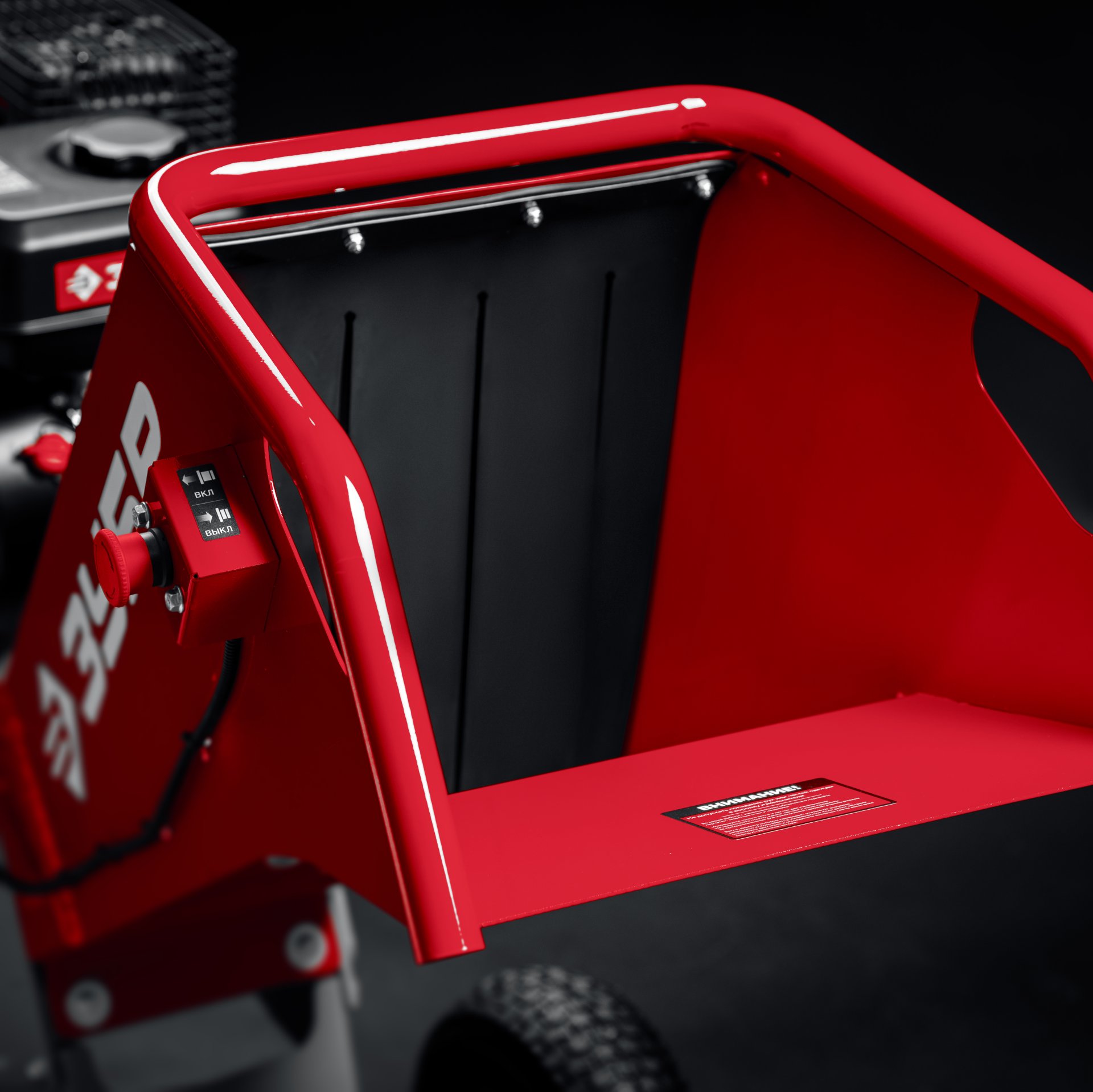 - Широкая горловина загрузочного желоба облегчает загрузку необработанной ветвистой древесины