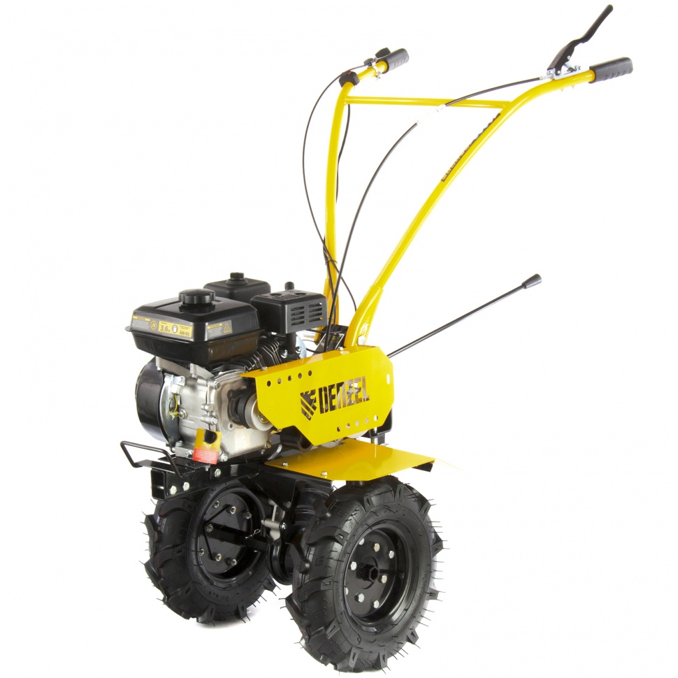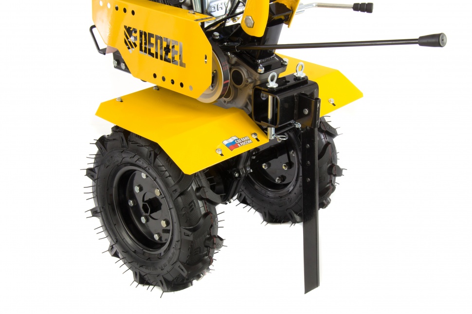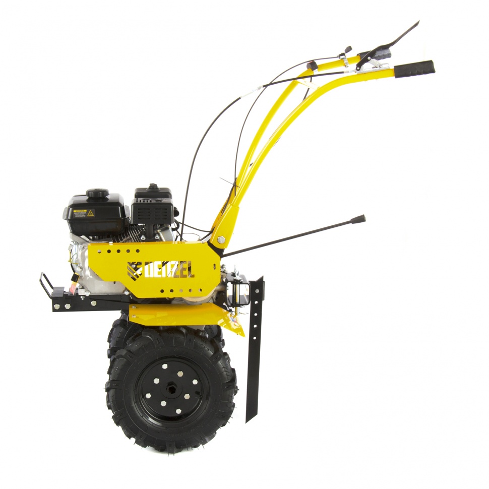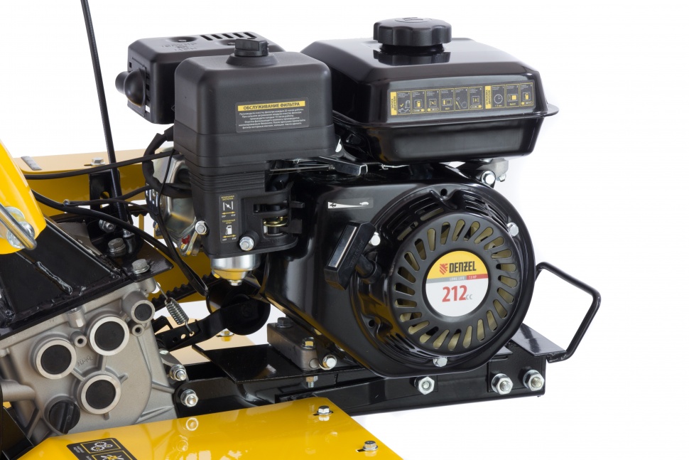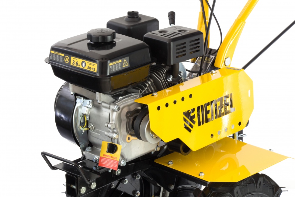Мотоблок Denzel DPT-170 56401 используется для вспахивания целины или глинистой почвы, разбивает комки сырой земли, создает ровные борозды. Двигатель мощностью 7 л.с. позволяет ему справляться с участками более 15 соток. Получится с легкостью культивировать сухой, мокрый или вязкий грунт, за один проход обрабатывая участок шириной 85 см и глубиной до 35 см.Возможность работы на 3-х скоростях и универсальное сцепление позволяют эффективно эксплуатировать мотоблок с разным навесным оборудованием: дополнительными фрезами, косилками, инструментом для выкапывания корнеплодов, снегоуборочным оборудованием, тележками и др. Это делает устройство многофункциональным и значительно экономит средства пользователя.ПреимуществаТрехскоростная коробка передач (2 вперед/1 назад) — можно выбрать добиться маневренности на разной почве и легко извлечь почвофрезы из грунта.Экономичный двигатель Denzel серии Long Life — заправлять топливный бак придется не чаще 1 раза в 3,5 часа.Универсальность — шкив отбора мощности делает возможным подключение даже активного навесного оборудования, например, зубчатых дисков для удаления сорняков.Фрезы из закаленной стали — они не деформируется, подходят для любого типа почвы и не требуют повторной заточки.Надежность и стабильная работа — стальной коленвал, закаленный токами высокой частоты до твердости 45-50 HRС и качественный распредвал повышают ресурс мотоблока.Система LO-protection — исключен запуск двигателя при недостаточном уровне масла, это помогает продлить ресурс мотоблока и избежать поломок.Безопасность — 2 защитных крыла оберегают пользователя от вылетающей почвы, камней и других предметов.Регулировка сошника по высоте — легко добиться неизменной глубины вспахивания для каждого типа почвы и поднять производительность работы.Комфортное управление — регулятор оборотов вынесен на рукоятку перед оператором, что позволяет быстро менять темп работы под тип грунта.Эргономичность — рукоятки находятся на удобном расстоянии друг от друга, дополнительно укреплены поперечной балкой и прорезинены для снижения вибраций.Идеальное равновесие — несмотря на вес более 50 кг мотоблоком легко управлять, т.к. он отцентрован на заводе.Легкое передвижение — пневматические колеса диаметром 47 см обеспечивают отличную проходимость.Металлическая ручка — мотоблок удобно поднимать, например, для загрузки в транспорт.Расширенная гарантия 3 года — качество мотоблока подтверждено производителем.