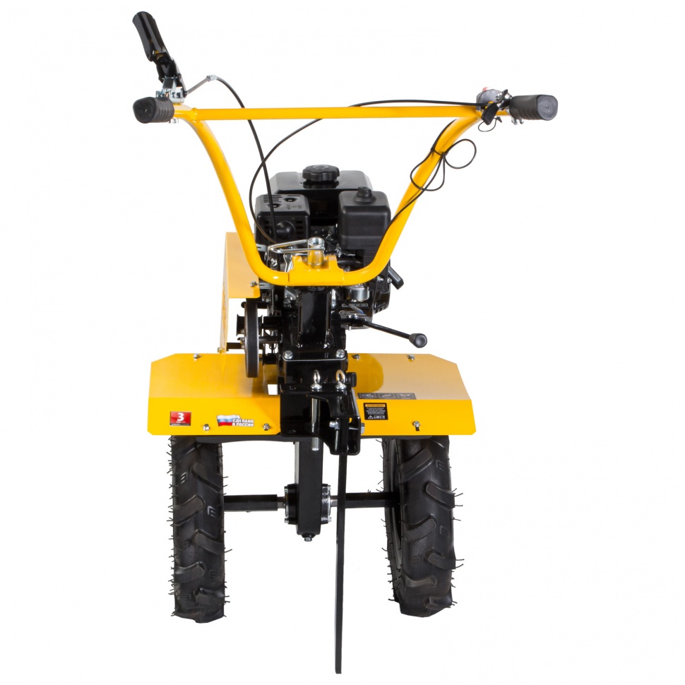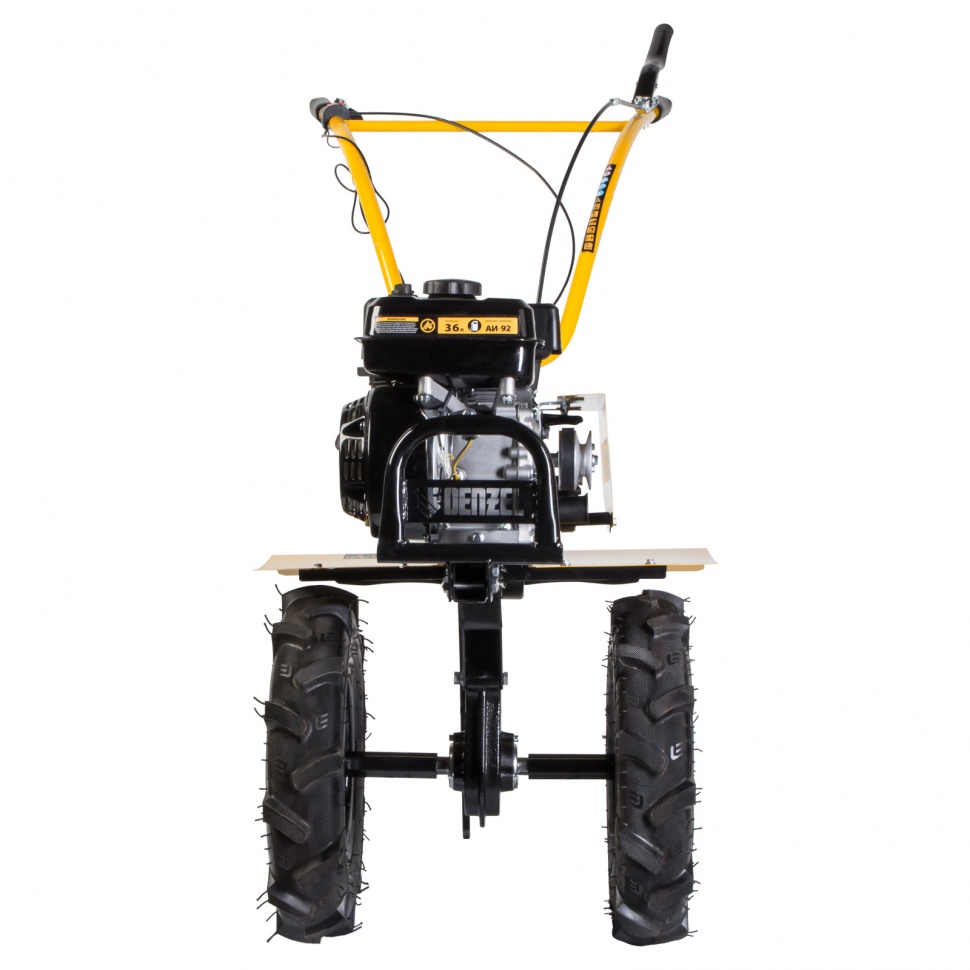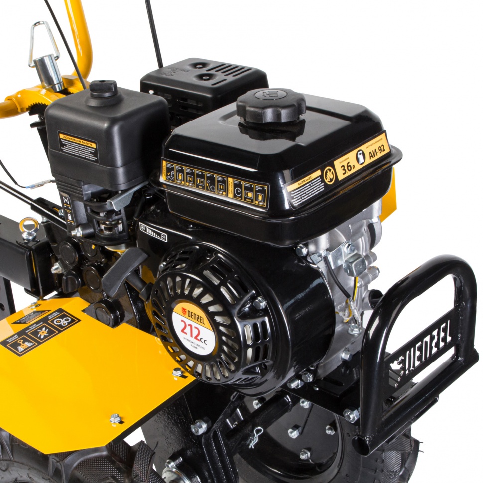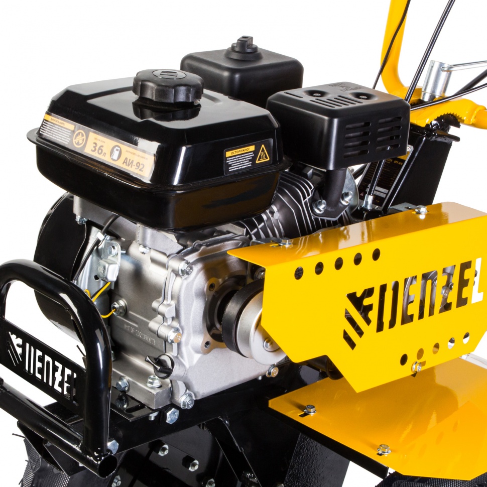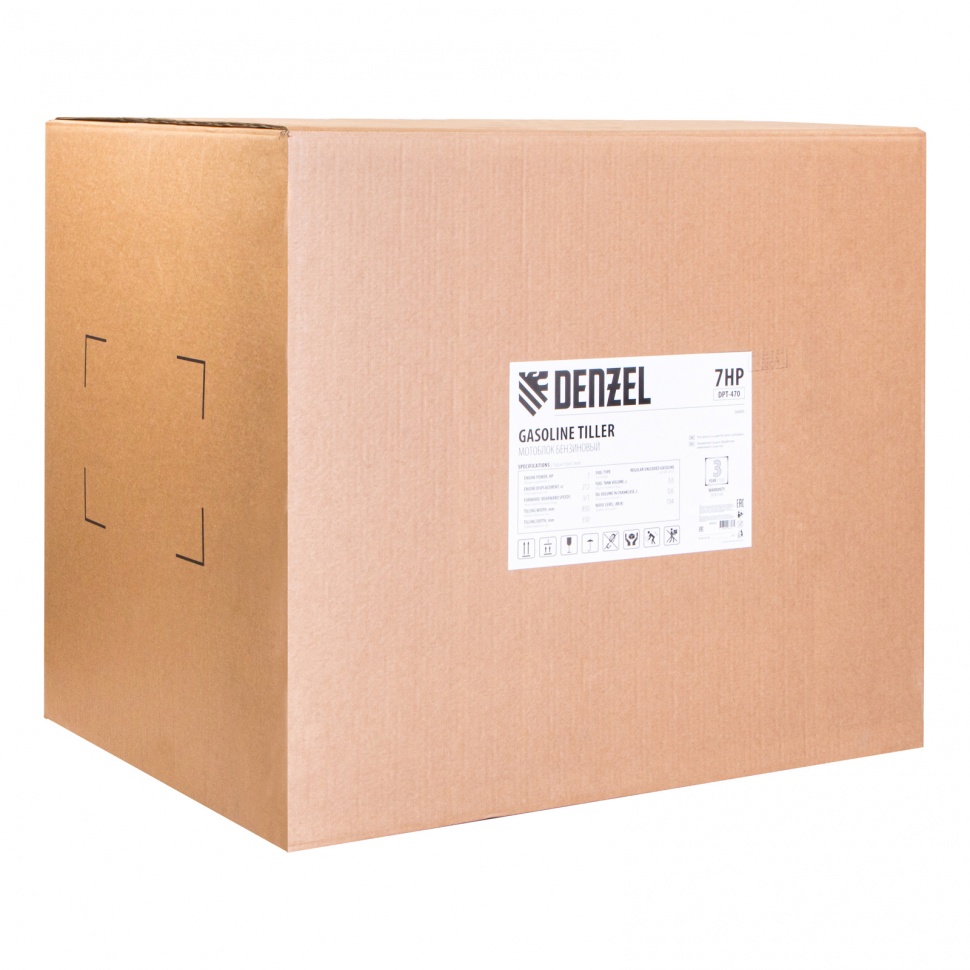 Мотоблок Denzel 56405 DPT-470 мощностью 7 л.с., с ременным сцеплением, , фрезами 3 х 4, шкивом отбора мощности ШОМ, коробкой передач 3В/1Н, — техника для вспашки, прополки, культивации почвы, обеспечивающая ширину прохода 85 см и заглубление фрез до 35 см. Благодаря надежному 4-тактному двигателю серии Long Life мощностью 7 л.с. и увеличенному весу за счет чугунного корпуса редуктора он успешно справляется с обработкой плотного грунта. Мотоблок применяется для выполнения бытовых сельскохозяйственных работ.Преимущества4 режима работы — 3 передачи вперед и одна назад позволяют подстраиваться под тип почвы и легко извлекать почвофрезы из любого грунта.Удобная эксплуатация — рукоятки руля регулируются в 2 плоскостях — вертикально и относительно продольной оси машины.Легкое управление — регулятор оборотов двигателя, выключатель зажигания и рычаг сцепления находятся на рукоятке перед пользователем.Усиленный сошник толщиной 12 мм — можно менять глубину вспахивания, удерживать равновесие при обработке почвы и использовать его в качестве задней опоры при хранении мотоблока.Многофункциональность и экономия бюджета — шкив отбора мощности позволяет подключать к мотоблоку активное навесное оборудование.Защита от низкого уровня масла LO-protection — мотоблок не включится при незаполненном картере, такое решение предотвращает поломку двигателя и продлевает срок службы техники.Безопасная работа — защитные крылья предотвращают вылетание почвы, камней и прочих предметов на пользователя.Низкий расход топлива 1 л/ч — можно непрерывно работать более 3-х часов, не отвлекаясь на заправку.Долговечность — чугунный корпус редуктора и стальные фрезы (в комплекте поставки 24 шт.) отличаются особой прочностью.Надежный карбюратор — мотоблок работает стабильно даже при высокой нагрузке на двигатель.Качественные детали — закаленный до твердости 45-50 HRС стальной коленвал и надежный распредвал обеспечивают высокую производительность мотоблока в любое время года.Воздушный фильтр — поступающий в цилиндр воздух очищается от твердых частиц, что обеспечивает его сохранность — это особенно важно при обработке сухой почвы.Эргономичность — рукоятки изогнутой формы находятся на оптимальном расстоянии друг от друга и усилены стальной перекладиной, поэтому пользователь не устанет даже при длительной работе.Комфортная транспортировка — усиленная рукоятка-бампер и большие колеса с глубоким протектором позволяют с легкостью перемещать мотоблок до нужного места.Складная ножка — дополнительная опора позволяет удобно располагать мотоблок в зоне хранения без риска опрокидывания.Расширенная гарантия 3 года — качество мотоблока подтверждено производителем.