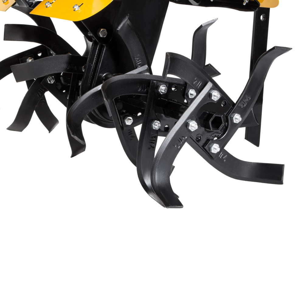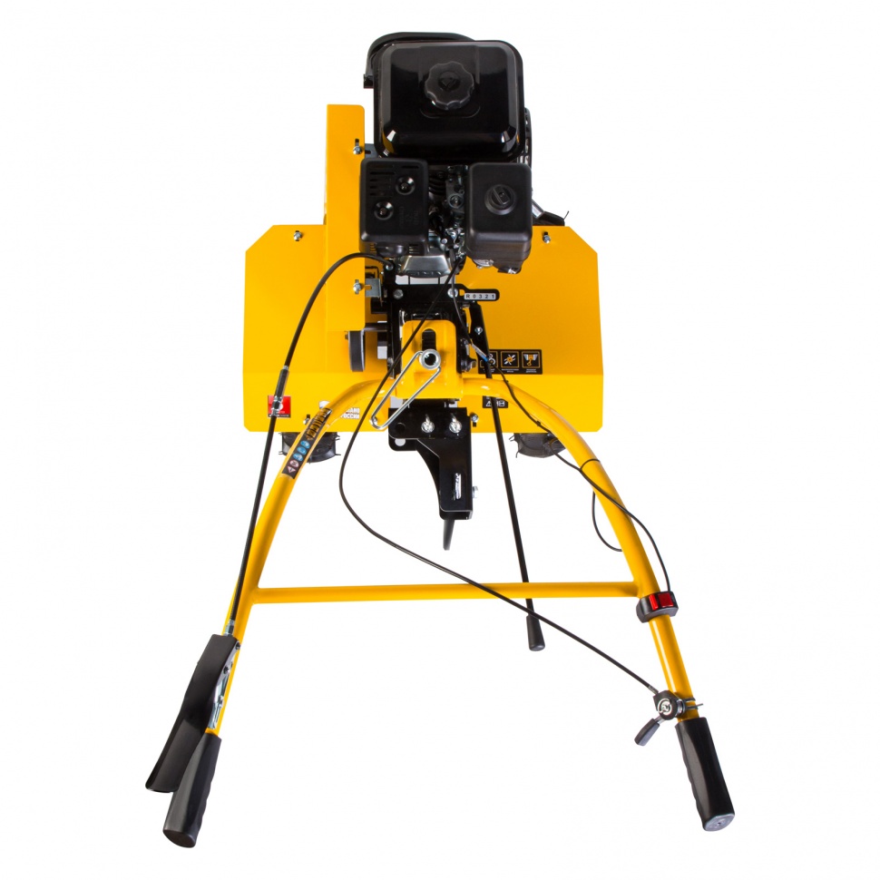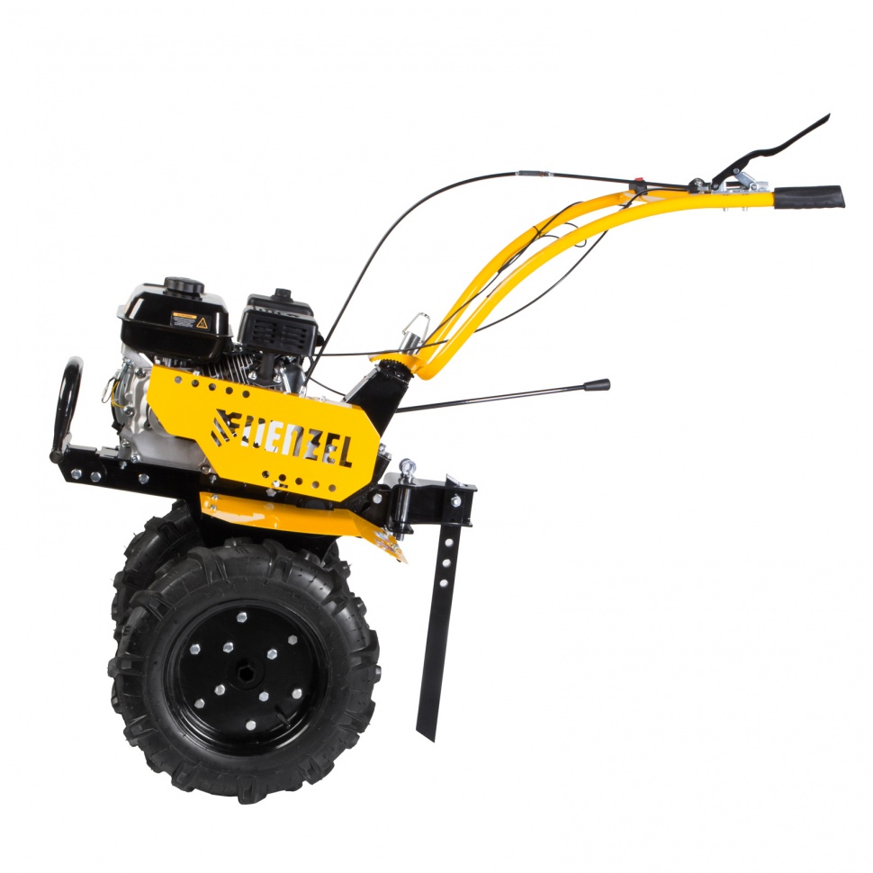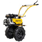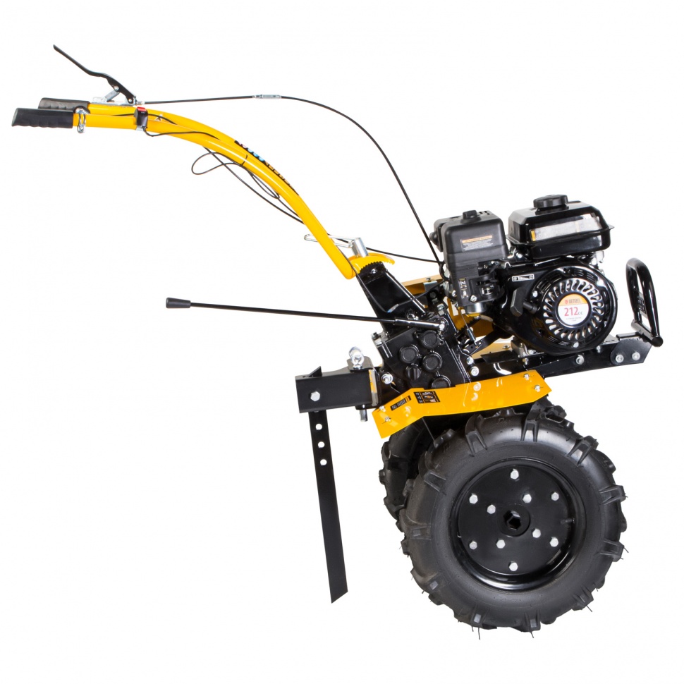 Мотоблок Denzel 56405 DPT-470 мощностью 7 л.с., с ременным сцеплением, , фрезами 3 х 4, шкивом отбора мощности ШОМ, коробкой передач 3В/1Н, — техника для вспашки, прополки, культивации почвы, обеспечивающая ширину прохода 85 см и заглубление фрез до 35 см. Благодаря надежному 4-тактному двигателю серии Long Life мощностью 7 л.с. и увеличенному весу за счет чугунного корпуса редуктора он успешно справляется с обработкой плотного грунта. Мотоблок применяется для выполнения бытовых сельскохозяйственных работ.Преимущества4 режима работы — 3 передачи вперед и одна назад позволяют подстраиваться под тип почвы и легко извлекать почвофрезы из любого грунта.Удобная эксплуатация — рукоятки руля регулируются в 2 плоскостях — вертикально и относительно продольной оси машины.Легкое управление — регулятор оборотов двигателя, выключатель зажигания и рычаг сцепления находятся на рукоятке перед пользователем.Усиленный сошник толщиной 12 мм — можно менять глубину вспахивания, удерживать равновесие при обработке почвы и использовать его в качестве задней опоры при хранении мотоблока.Многофункциональность и экономия бюджета — шкив отбора мощности позволяет подключать к мотоблоку активное навесное оборудование.Защита от низкого уровня масла LO-protection — мотоблок не включится при незаполненном картере, такое решение предотвращает поломку двигателя и продлевает срок службы техники.Безопасная работа — защитные крылья предотвращают вылетание почвы, камней и прочих предметов на пользователя.Низкий расход топлива 1 л/ч — можно непрерывно работать более 3-х часов, не отвлекаясь на заправку.Долговечность — чугунный корпус редуктора и стальные фрезы (в комплекте поставки 24 шт.) отличаются особой прочностью.Надежный карбюратор — мотоблок работает стабильно даже при высокой нагрузке на двигатель.Качественные детали — закаленный до твердости 45-50 HRС стальной коленвал и надежный распредвал обеспечивают высокую производительность мотоблока в любое время года.Воздушный фильтр — поступающий в цилиндр воздух очищается от твердых частиц, что обеспечивает его сохранность — это особенно важно при обработке сухой почвы.Эргономичность — рукоятки изогнутой формы находятся на оптимальном расстоянии друг от друга и усилены стальной перекладиной, поэтому пользователь не устанет даже при длительной работе.Комфортная транспортировка — усиленная рукоятка-бампер и большие колеса с глубоким протектором позволяют с легкостью перемещать мотоблок до нужного места.Складная ножка — дополнительная опора позволяет удобно располагать мотоблок в зоне хранения без риска опрокидывания.Расширенная гарантия 3 года — качество мотоблока подтверждено производителем.