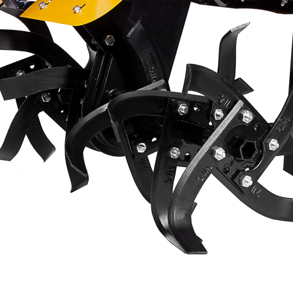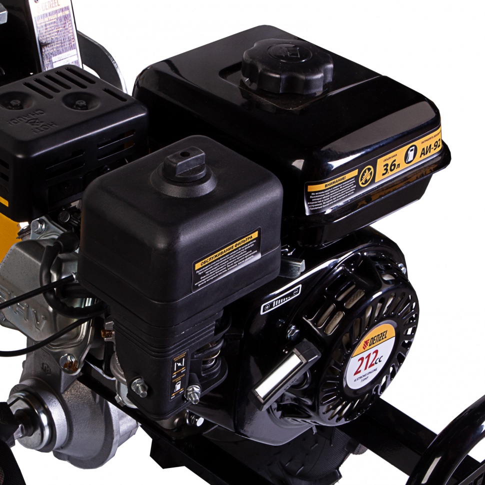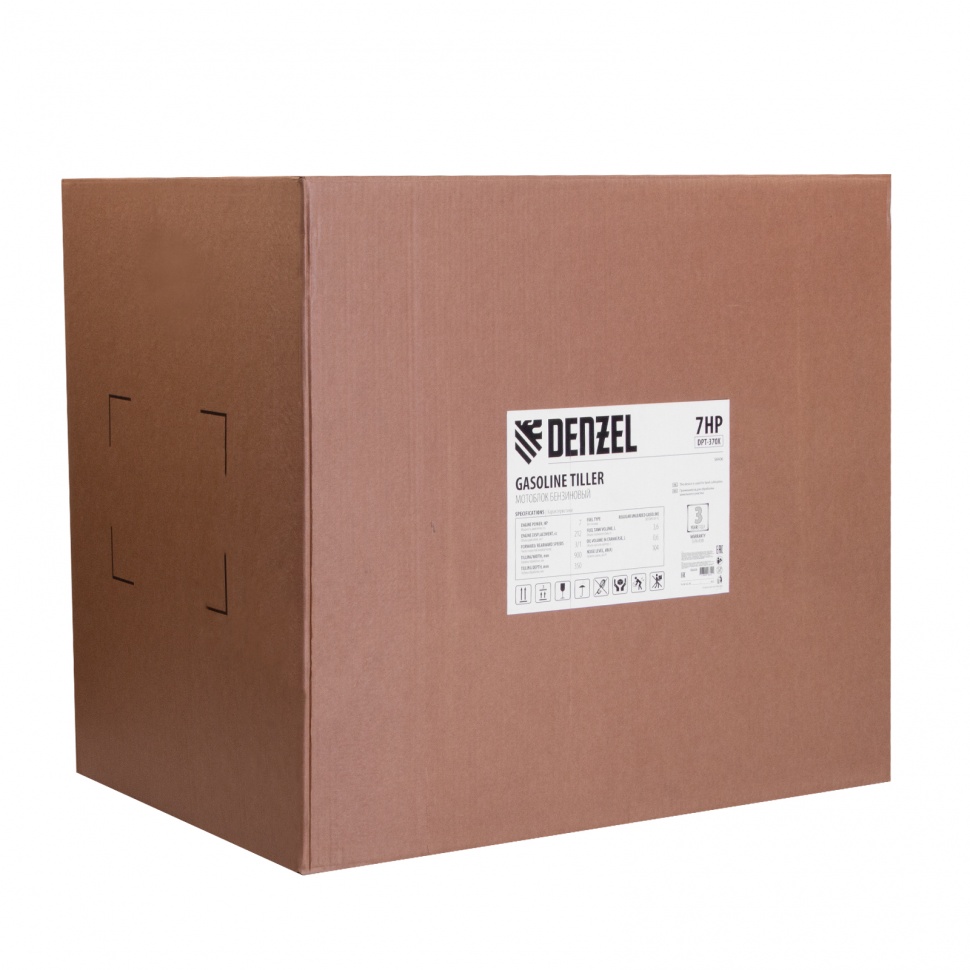 Мотоблок Denzel 56406 DPT-370X мощностью 7 л.с., с дисковым сцеплением, фрезами 3 х 4, валом отбора мощности (ВОМ), передачами 3В/1Н, имеет ширину вспахивания 90 см и глубину обработки 35 см. Предназначен для обработки почвы: рыхления, боронования, выравнивания, прополки и выполнения других задач на приусадебных и садовых участках, уверенно справляется с плотной глинистой почвой.Мощный и экономичный одноцилиндровый четырехтактный двигатель Denzel серии Long Life с рабочим объемом 212 см3 отличается надежностью и продолжительным ресурсом. Многодисковый механизм сцепления обеспечивает передачу высокого крутящего момента на колеса. Мотоблок предназначен для работы на большой территории и широко используется в быту.ПреимуществаВысокопроизводительная коробка передач — 3 передачи вперед и одна назад позволяют подстраиваться под тип почвы и легко извлекать почвофрезы из любого грунта.Удобная эксплуатация — рукоятки руля регулируются в 2 плоскостях — вертикально и относительно продольной оси машины.Легкое управление — регулятор оборотов двигателя, выключатель зажигания и рычаг сцепления находятся на рукоятке перед пользователем.Усиленный сошник толщиной 12 мм — можно менять глубину вспахивания, удерживать равновесие при обработке почвы и использовать его в качестве задней опоры при хранении мотоблока.Многофункциональность и экономия бюджета — вал отбора мощности позволяет подключать к мотоблоку активное навесное оборудование.Защита от работы при низком уровне масла LO-protection — мотоблок не включится при незаполненном картере, такое решение предотвращает поломку двигателя и продлевает срок службы техники.Безопасная работа — широкие крылья защищают пользователя от вылетающих фрагментов почвы, камней и прочих предметов.Низкий расход топлива 1 л/ч — можно непрерывно работать более 3-х часов, не отвлекаясь на заправку.Долговечность — чугунный корпус редуктора и стальные фрезы (в комплекте поставки 24 шт.) отличаются особой прочностью.Надежный карбюратор — мотоблок работает стабильно даже при высокой нагрузке на двигатель.Качественные детали — закаленный до твердости 45-50 HRС стальной коленвал и надежный распредвал обеспечивают высокую производительность мотоблока в любое время года.Воздушный фильтр — поступающий в цилиндр воздух очищается от твердых частиц, что обеспечивает его высокий ресурс — это особенно важно при обработке сухой почвы.Эргономичность — рукоятки изогнутой формы находятся на оптимальном расстоянии друг от друга и усилены стальной перекладиной, поэтому пользователь не устанет даже при длительной работе.Комфортная транспортировка — усиленная рукоятка-бампер и большие колеса с глубоким протектором позволяют с легкостью перемещать мотоблок до нужного места.Складная ножка — дополнительная опора позволяет удобно располагать мотоблок в зоне хранения без риска опрокидывания.Расширенная гарантия 3 года — качество мотоблока подтверждено производителем.