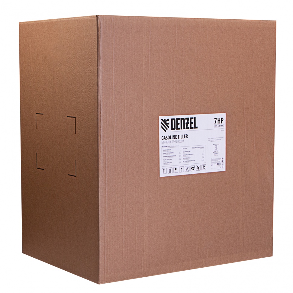 Самый эффективный из представленных в линейке, мотоблок Denzel DPT-370-PRO 56404 мощностью 7 л.с. рассчитан на участки площадью до 1-2 гектаров. Сырой или вязкий грунт, глинистая почва, целина или большое поле — все эти задачи под силу четырехтактному двигателю Denzel.Для рыхления, измельчения или выравнивания почвы используются 24 фрезы диаметром 35 см. Их обслуживание сведено к минимуму и не требует повторной заточки. Режущие элементы без труда уходят на глубину 35 см и захватывают до 90 см в ширину.Преимущества4 скорости вперед и 2 назад — несколько режимов работы помогут справиться с почвой любого типа, маневрируя в узких местах, и без труда вытащить мотоблок даже из сложного грунта.Длительная обработка почвы — емкий топливный бак на 6 л и двигатель из серии Denzel Long Life обеспечивают экономичное потребление бензина (примерно 1 л/час) и позволяют обработать большую территорию, не теряя времени на дозаправку.Высокая производительность — надежные фрезы из закаленной стали обеспечивают оптимальную скорость вспахивания даже слежавшейся земли.Широкий спектр задач — благодаря надежному механизму сцепления на мотоблок легко закрепляются дополнительные фрезы, тележки, приспособления для высадки клубней и сбора урожая, косилки и прочая вспомогательная техника.Настройка глубины вспахивания — сошник регулируется по высоте и позволяет погружать почвофрезы на глубину до 35 см, идеально обрабатывая разные участки земли, и дополнительно обеспечивая устойчивость мотоблока.Система LO-protection — двигатель не заведется при недостаточном уровне масла, что гарантирует его сохранность и повышает ресурс работы всего мотоблока.Долговечность — стальной коленвал, закаленный до твердости 45-50 HRС в паре с качественно отлитым распредвалом гарантируют надежную и стабильную работу независимо от типа почвы и времени года.Безопасная работа — специальный щиток ограждает пользователя от попадания земли, грязи и посторонних предметов.Усиленная конструкция — рама надежно защищает мотоблок от механических повреждений и способна выдержать длительную эксплуатацию даже в зимнее время.Устойчивость на любом грунте — мотоблок отцентрован на заводе и отлично удерживает равновесие, поэтому подойдет даже неопытным пользователям.Эргономика в деталях — рукоятки изогнутой формы обеспечивают удобный захват, находятся на оптимальном расстоянии друг от друга, усилены металлической перекладиной и гасят вибрации благодаря прорезиненным наконечникам.Удобство эксплуатации — основные элементы управления вынесены на рукоятки, поэтому оператор сможет быстро настроить оптимальный режим под тип грунта, не наклоняясь.Уверенное сцепление с любой поверхностью — пневматические колеса диаметром 49 см защищены от проколов протекторами и обеспечивают хорошую амортизацию, поэтому пройти получится даже по неровному участку, не боясь за оборудование.Быстрая заправка без брызг — горловина топливного бака увеличена, что сокращает время на его заполнение и позволяет избежать разбрызгивания бензина.Расширенная гарантия 3 года — качество мотоблока подтверждено производителем.